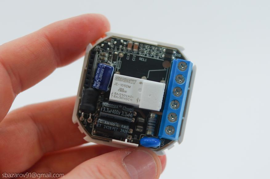 Снимается пластиковый кожух элементарно, под ним двухэтажная плата. В качестве коннектора выступает гребенка на 7 пинов. Электромагнитное реле GOODKY JE-105DM с номиналом 8А при 250В (т.е изготовить берет с запасом под нагрузку 2кВт). В целом пайка и сборка выполнена качественно, не придраться.