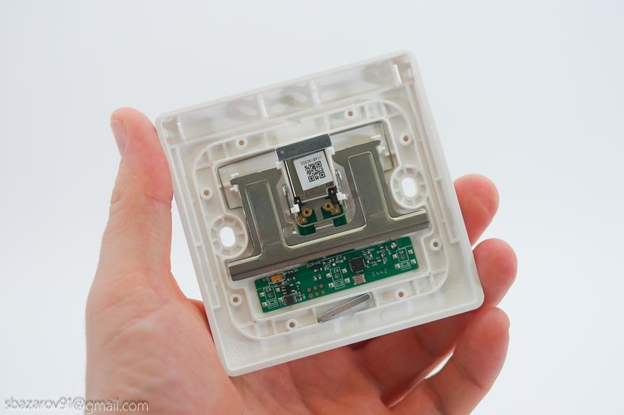 Для монтажа выключателя необходимо снять клавишу, держится она на пазах и защелках. Внутри три резиновых контакта, которые давят на пластину, а та в свою очередь дает контакт микрогенератору энергии, вырабатывающий импульс и преобразующий кинетическую энергию в электрическую. Этот сигнал «уходит» на реле, которое и управляет включением света. Таким образом для работы кинетического выключателя не требуется внешнее питание, так как он полностью автономный.