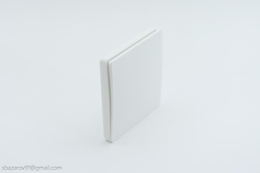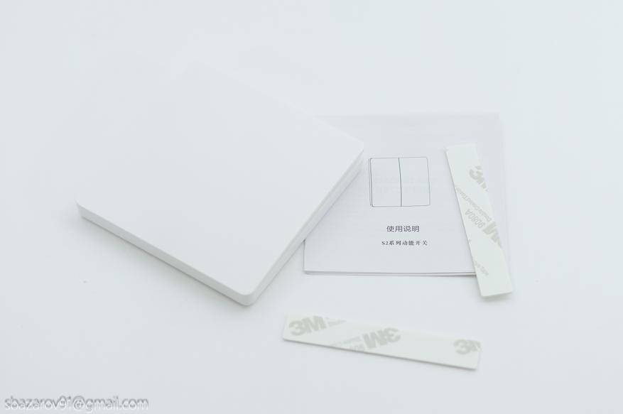 Размеры выключателя составляют 86х86х17 мм, а посадочные отверстия совместимы со стандартными подрозетниками на 68 мм. В комплект также входят два стикера 3М, которые позволяют закрепить выключатель в любом месте без необходимости использования подрозетников.
