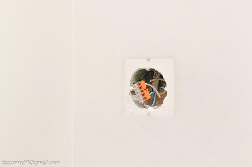 На место старого выключателя устанавливаем новый. Посадочные отверстия идеально совпадают с 68-мм коробкой, так что проблем с установкой не вызывает. При желании можно было закрепить его двухсторонним скотчем из комплекта.
