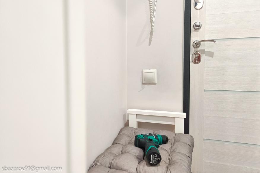 Итак, у нас Г-образный коридор длиной чуть более трех метров в каждую сторону. На выходе установлен обычный выключатель под правую руку, а в качестве освещения используются 3 точечных светильника.