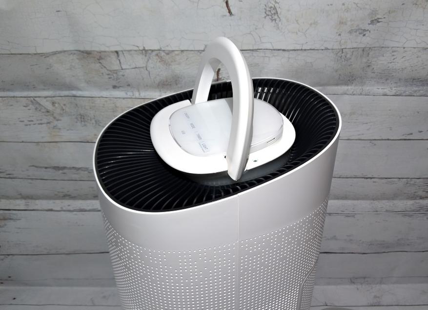 В верхней части корпуса расположена глянцевая панель с сенсорными кнопками управления, встроенная подсветка и кольцевая решетка для вывода отфильтрованного воздуха: