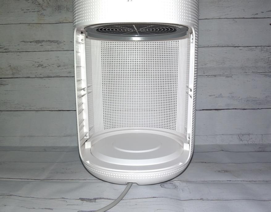 Умный очиститель воздуха HIPER IoT Purifier Pro v1 является комбинированным прибором, который не только фильтрует и очищается воздух при помощи системы фильтров, но и обеззараживает его стерилизатором с УФ-лампой, убивая различные микробы и бактерии. Фильтр расположен в нижней части прибора и закрыт декоративной крышкой: