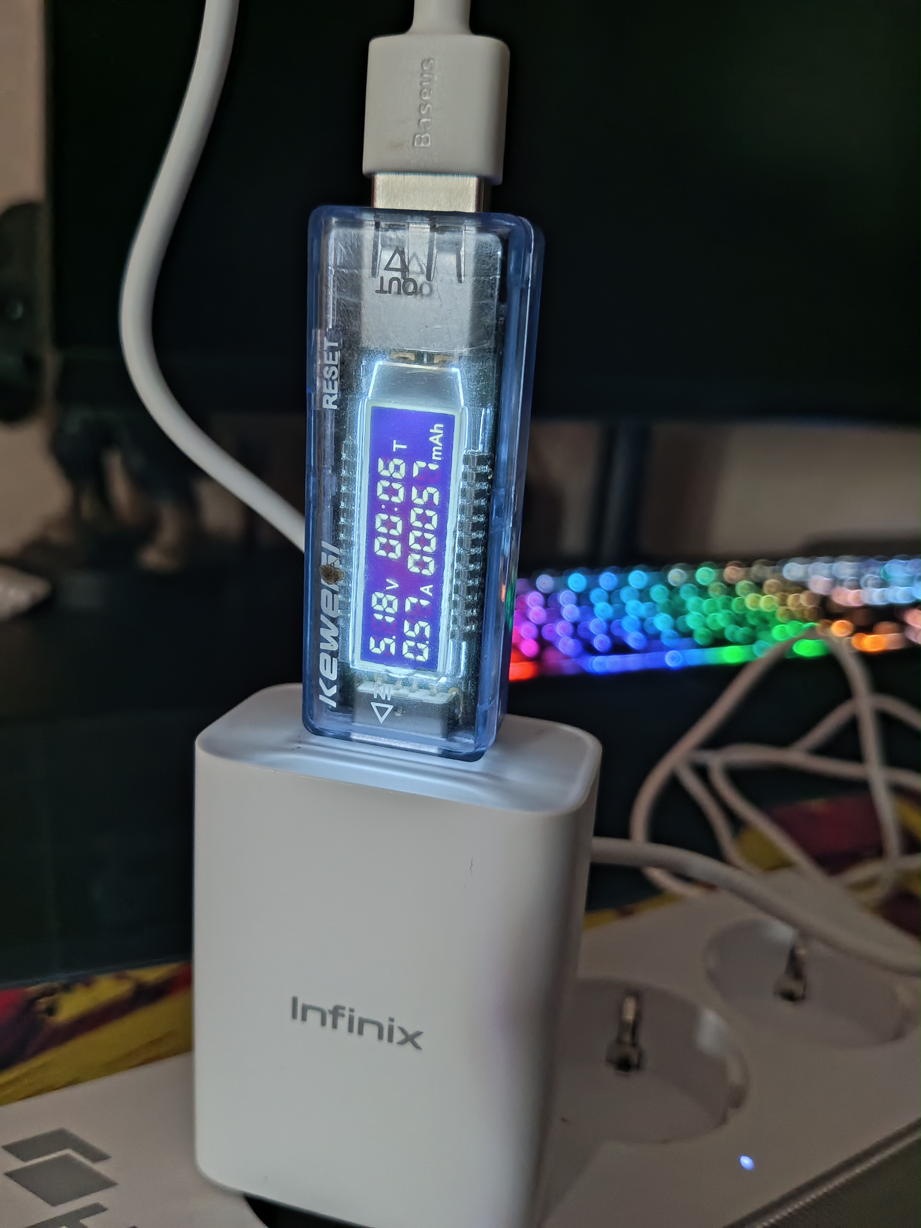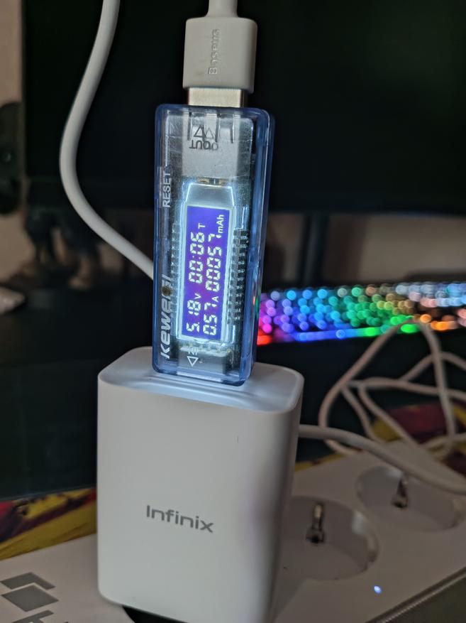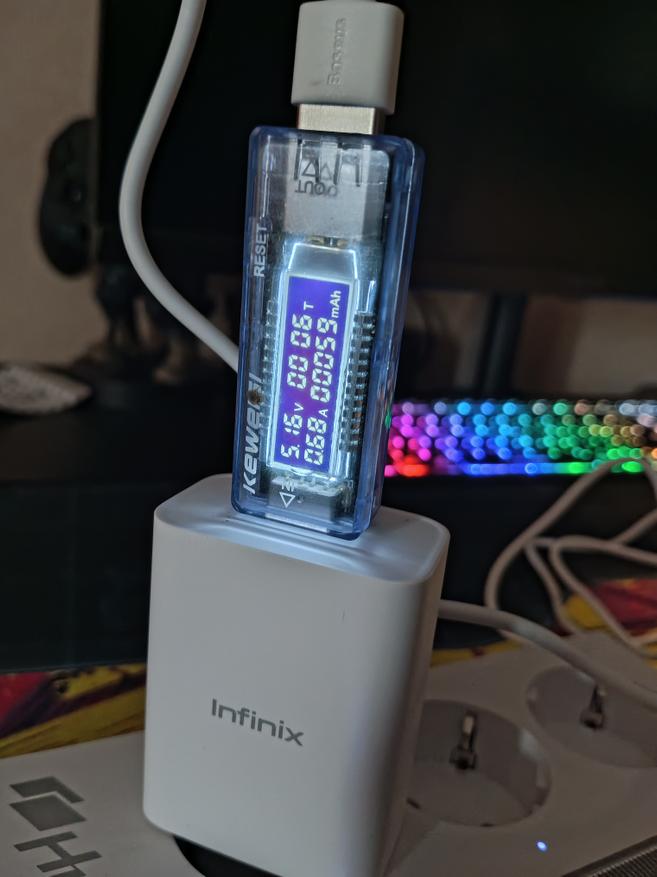 Во время зарядки, ток потребляемый лампой составил 0.57 А, а если включить лампу, то ток увеличивается и становиться 0.68 А. Полностью разряженная лампа зарядилась примерно за 4 часа.
