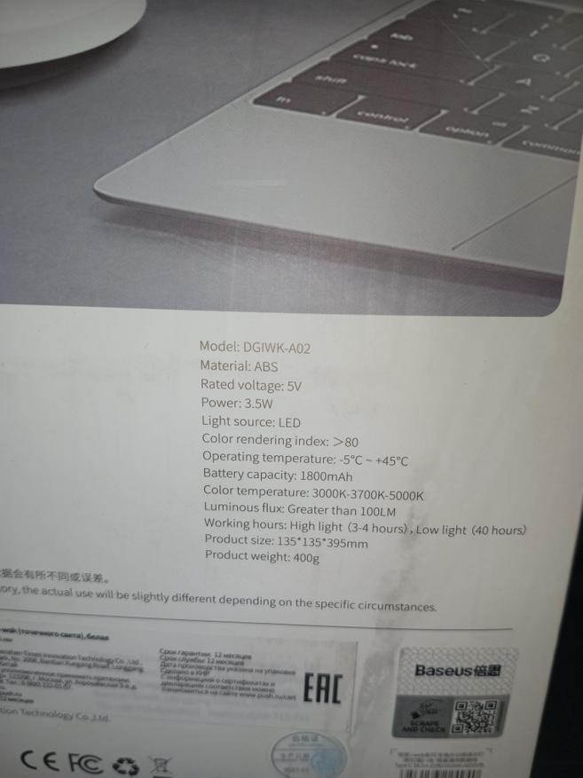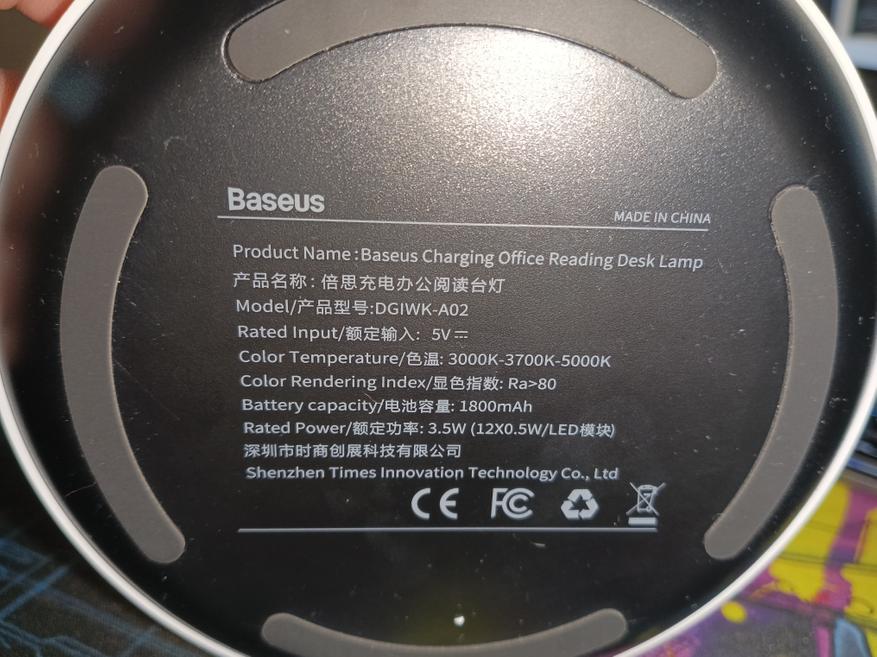 С нижней стороны написаны основные характеристики светильника. По периметру присутствует антискользящая ставка, которая хорошо удерживает светильник на столе.