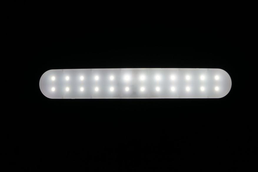 Включить или выключить лампу можно как с пульта так и сенсорными кнопками на осветительной части. В разных режимах цветовой температуры работают разные типы светодиодов, расположенных в три ряда. На фото ниже (с зажатой диафрагмой фотоаппарата) это можно увидеть в явном виде.