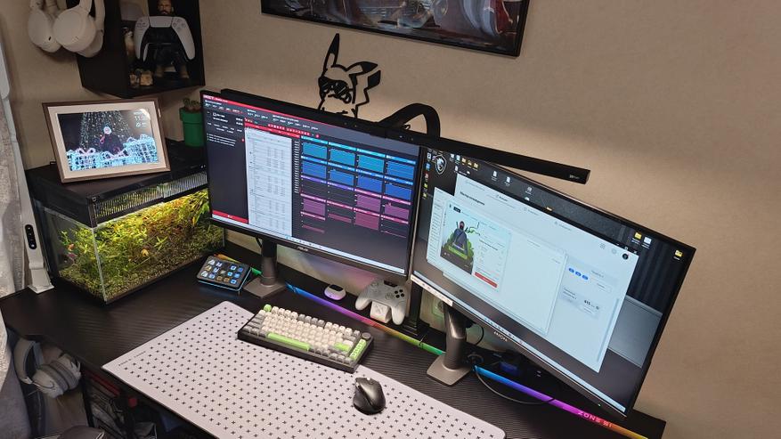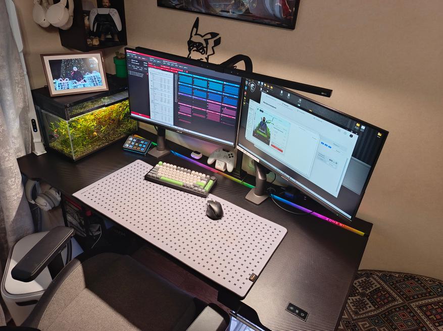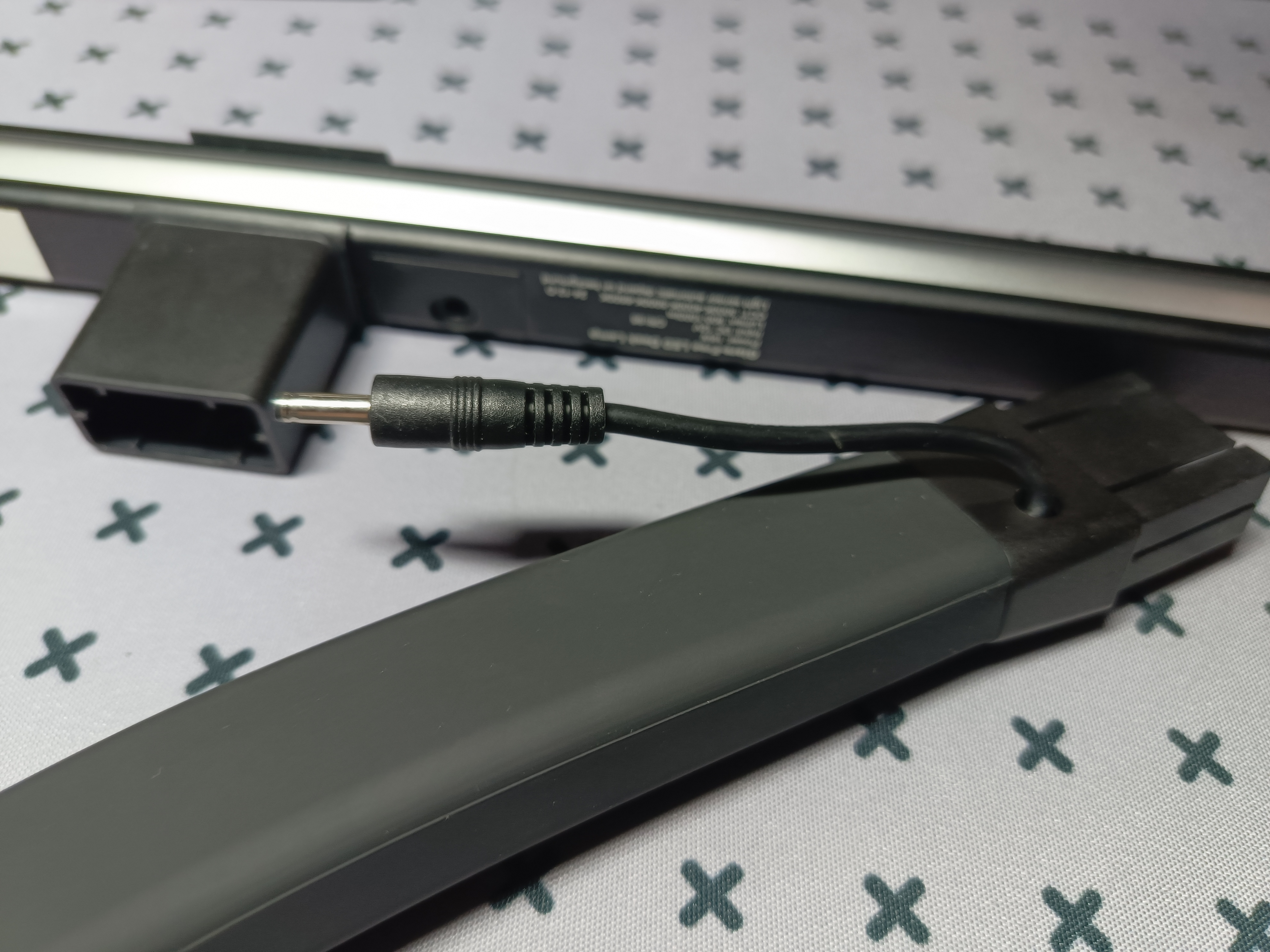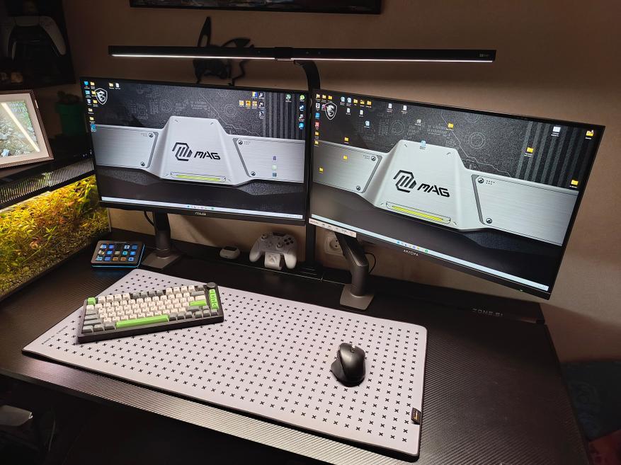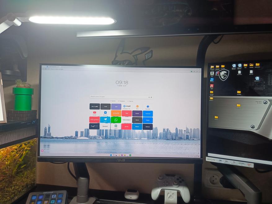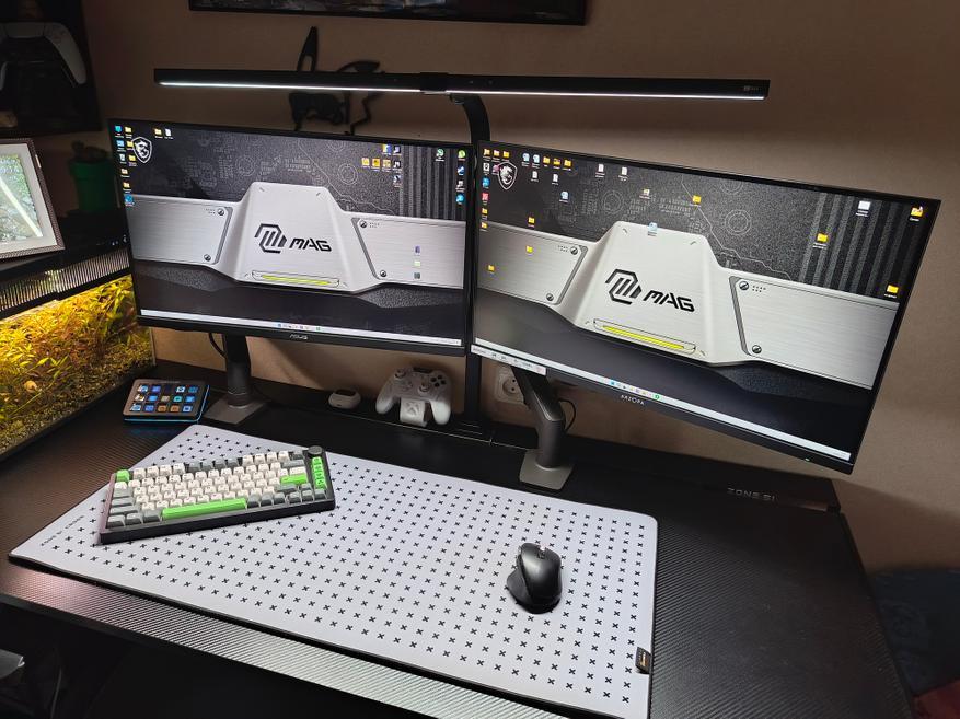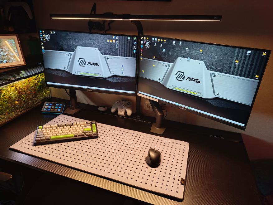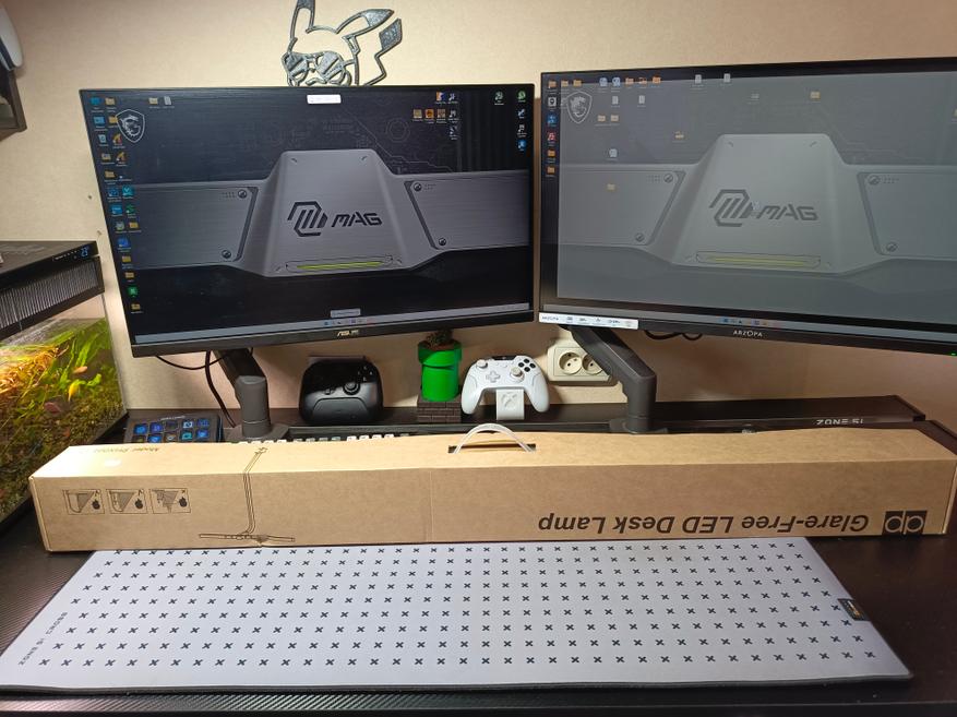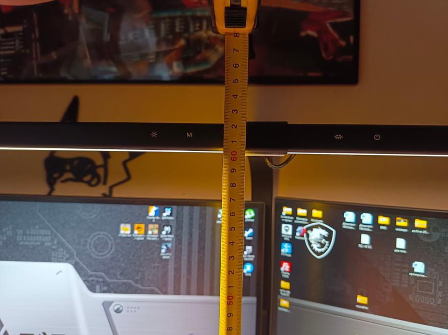 Вот так вот выглядит лампа, установленная на столе шириной 160 см. Она полностью обеспечивает светом всю рабочую зону. На столе установлены также два монитора с диагональю 27 дюймов, и лампа им не мешает. Думаю, с мониторами в 32 дюйма уже не хватит высоты основания лампы.