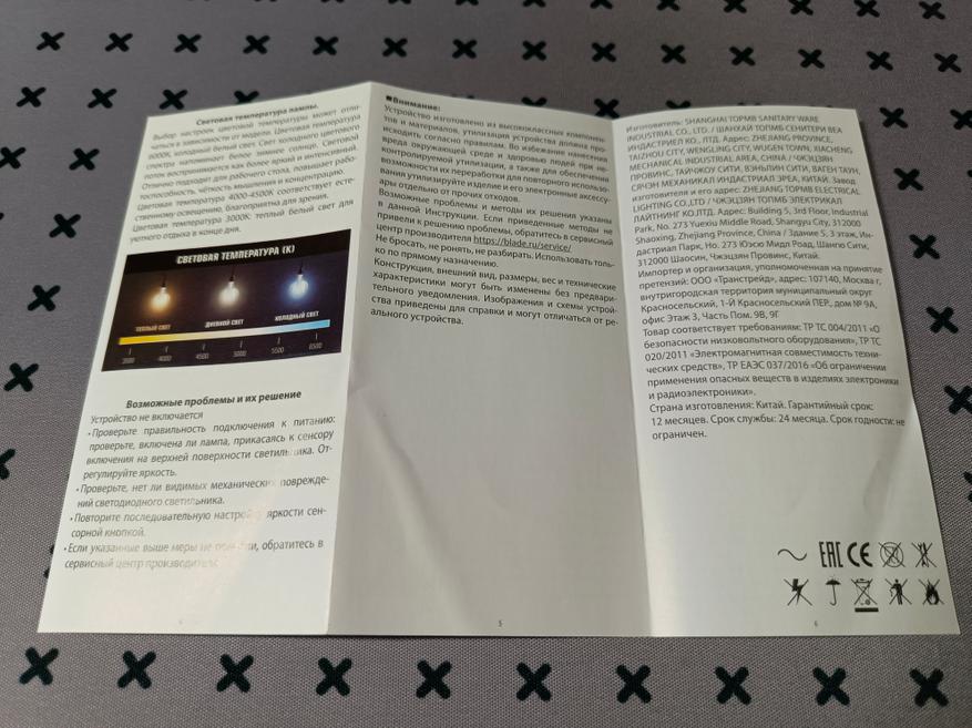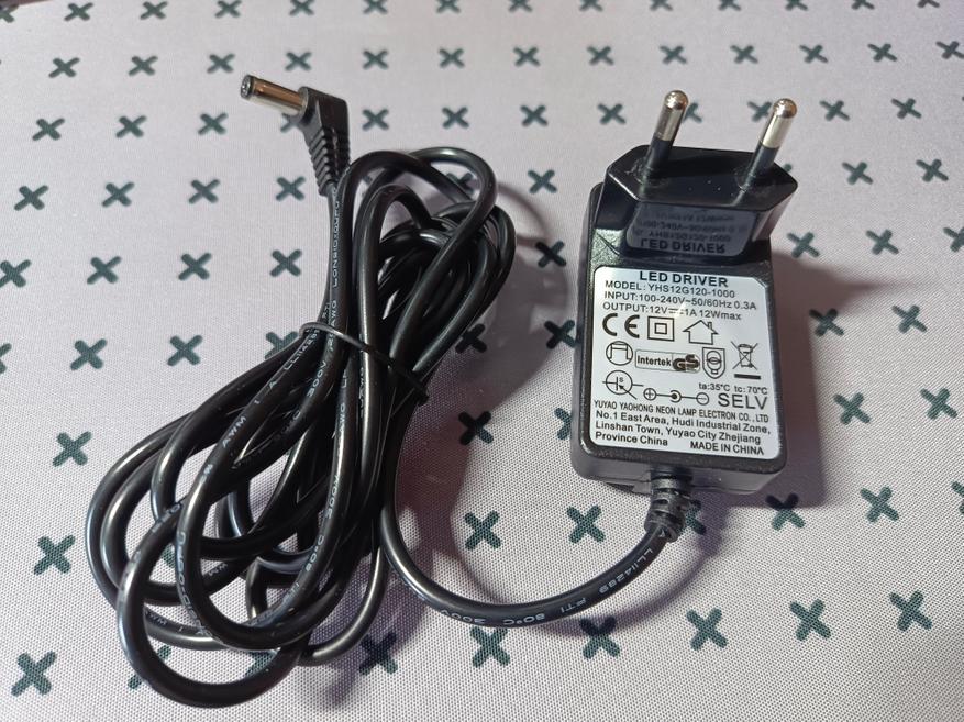 Внутри находятся сама лампа, зажим для фиксации на столе, блок питания и инструкция. Инструкция подробная и на русском языке, но и без нее все понятно. Блок питания с выходным напряжением 12 В и силой тока 1 А, что в совокупности обеспечивает 12 Вт.