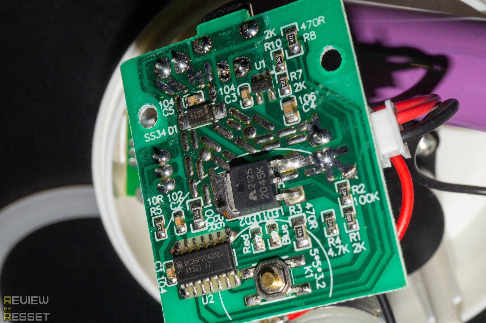Корпус разбирается легко, под силиконовой вставкой спрятаны 4 шурупа, внутри аккумулятор 18650, двигатель с редуктором и мелкая плата с магнитным датчиком. Основная плата простенькая, но тут много элементов и не нужно, достаточно контроллера заряда и мосфета, чтобы не насиловать кнопку