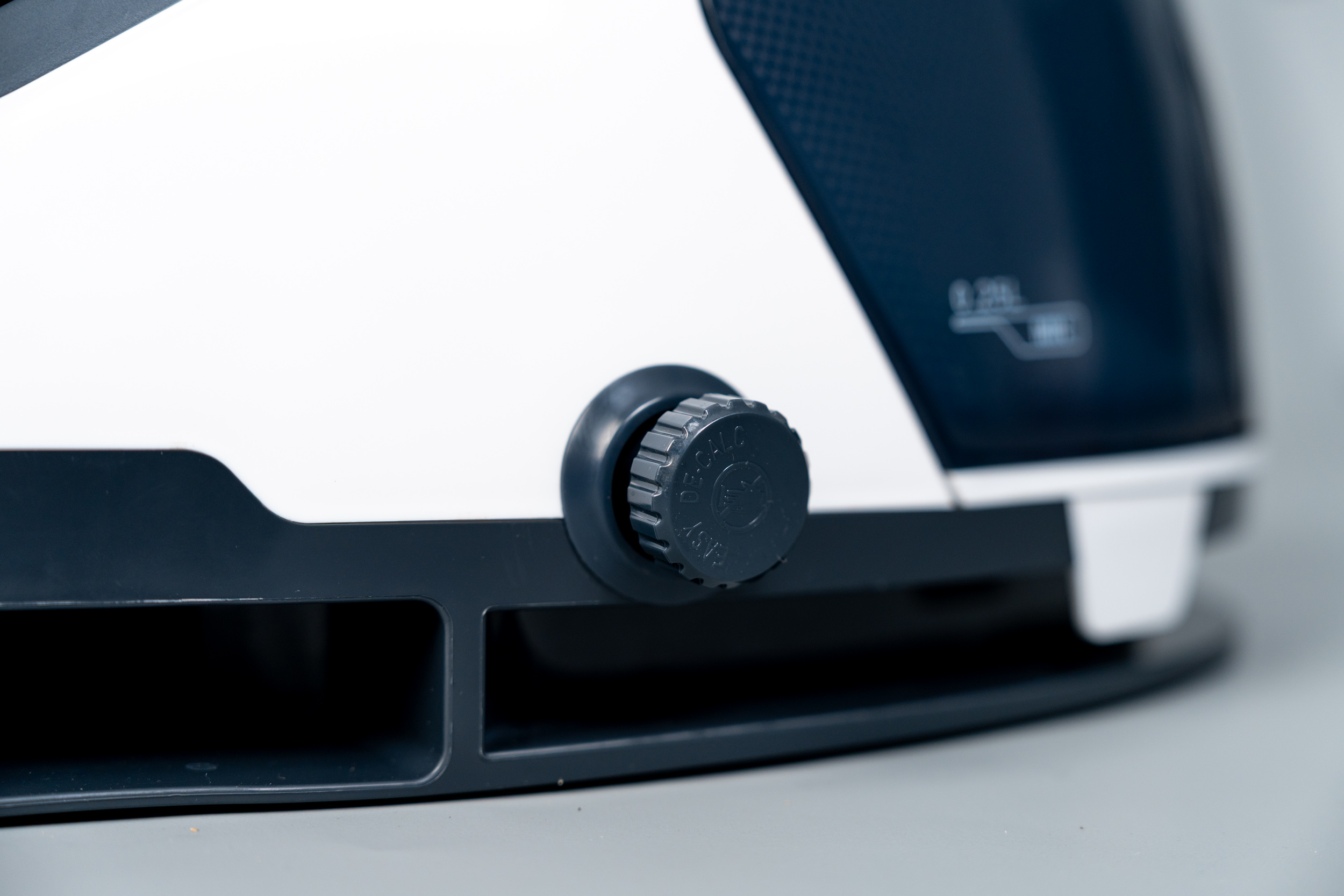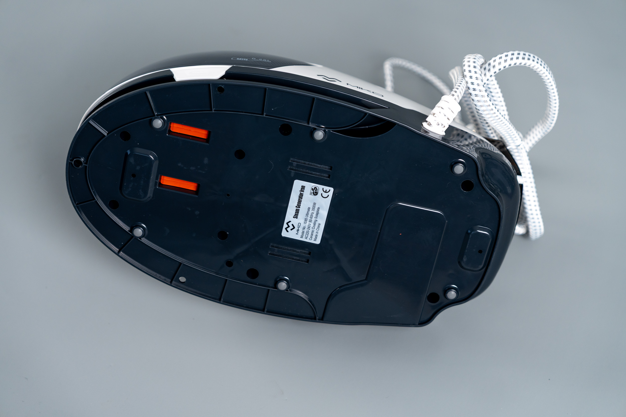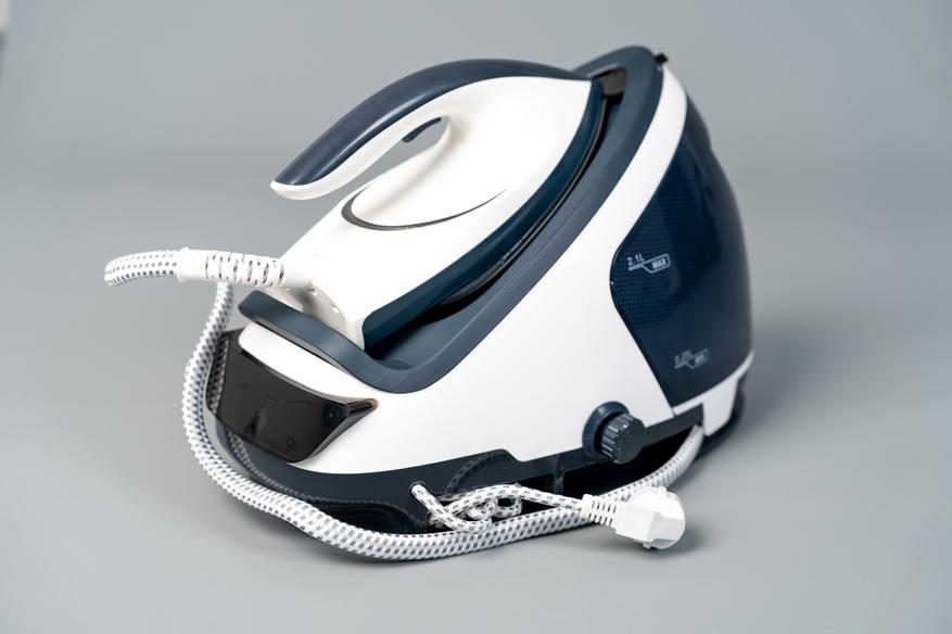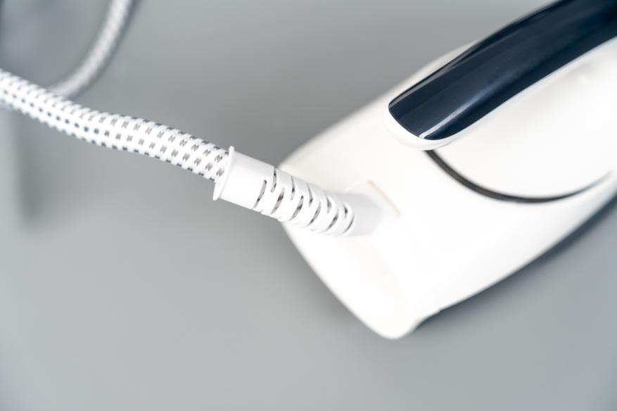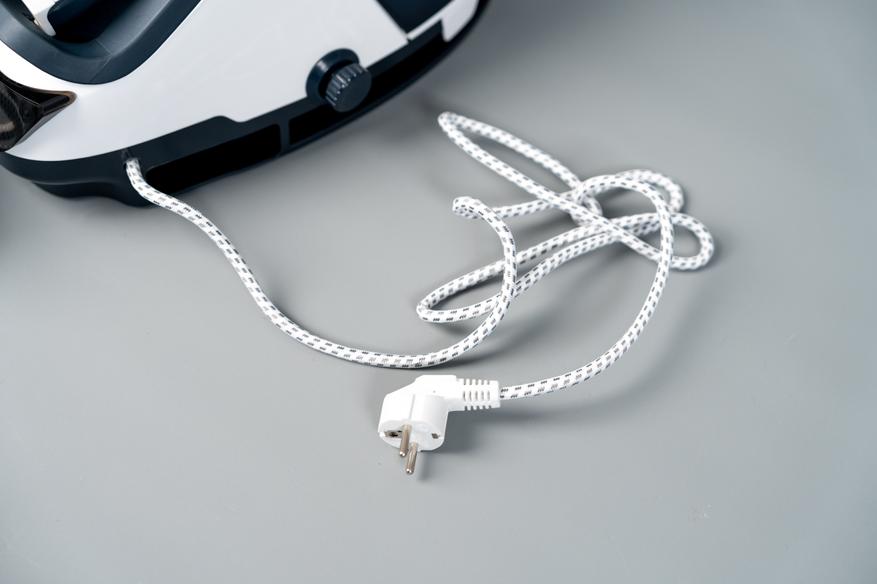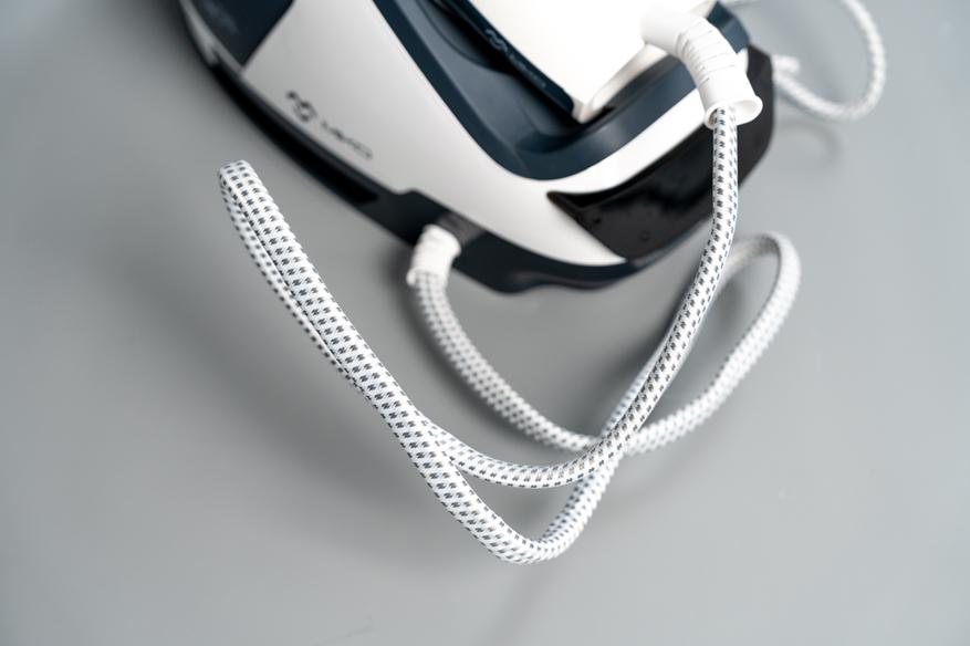 Подача пара осуществляется через шланг в теплостойкой синтетической оплетке длиной в 1,5 м. С противоположной стороны станции расположен сетевой кабель длиной 1,5 м в тканевой оплетке с заземляющей вилкой европейского типа. Для компактного хранения кабель можно закрепить на нижней части корпуса, используя специальную выемку.