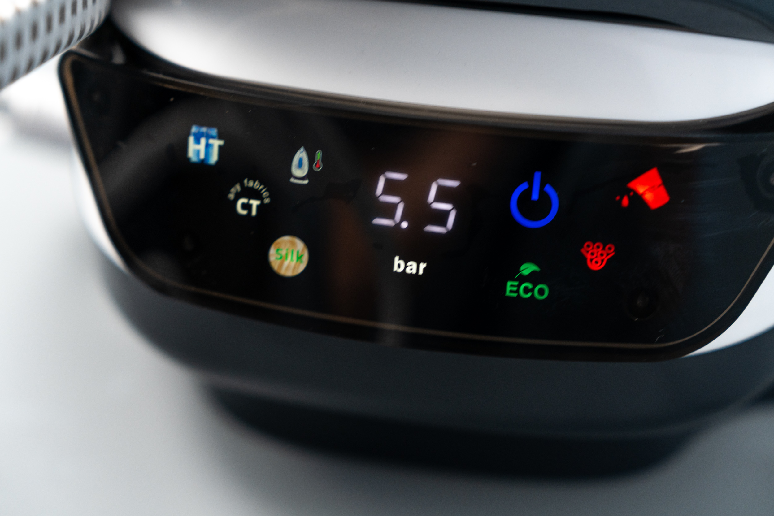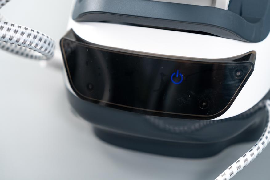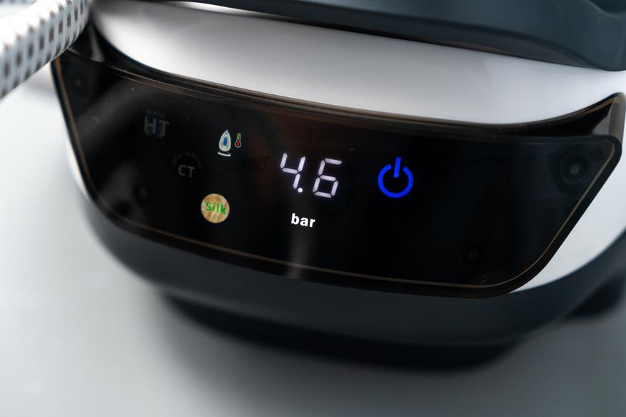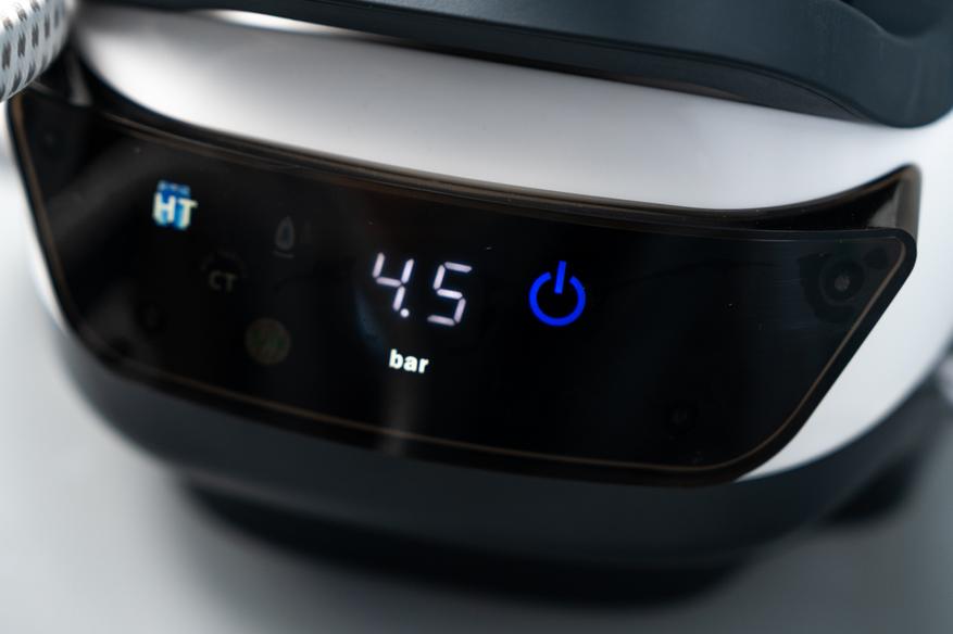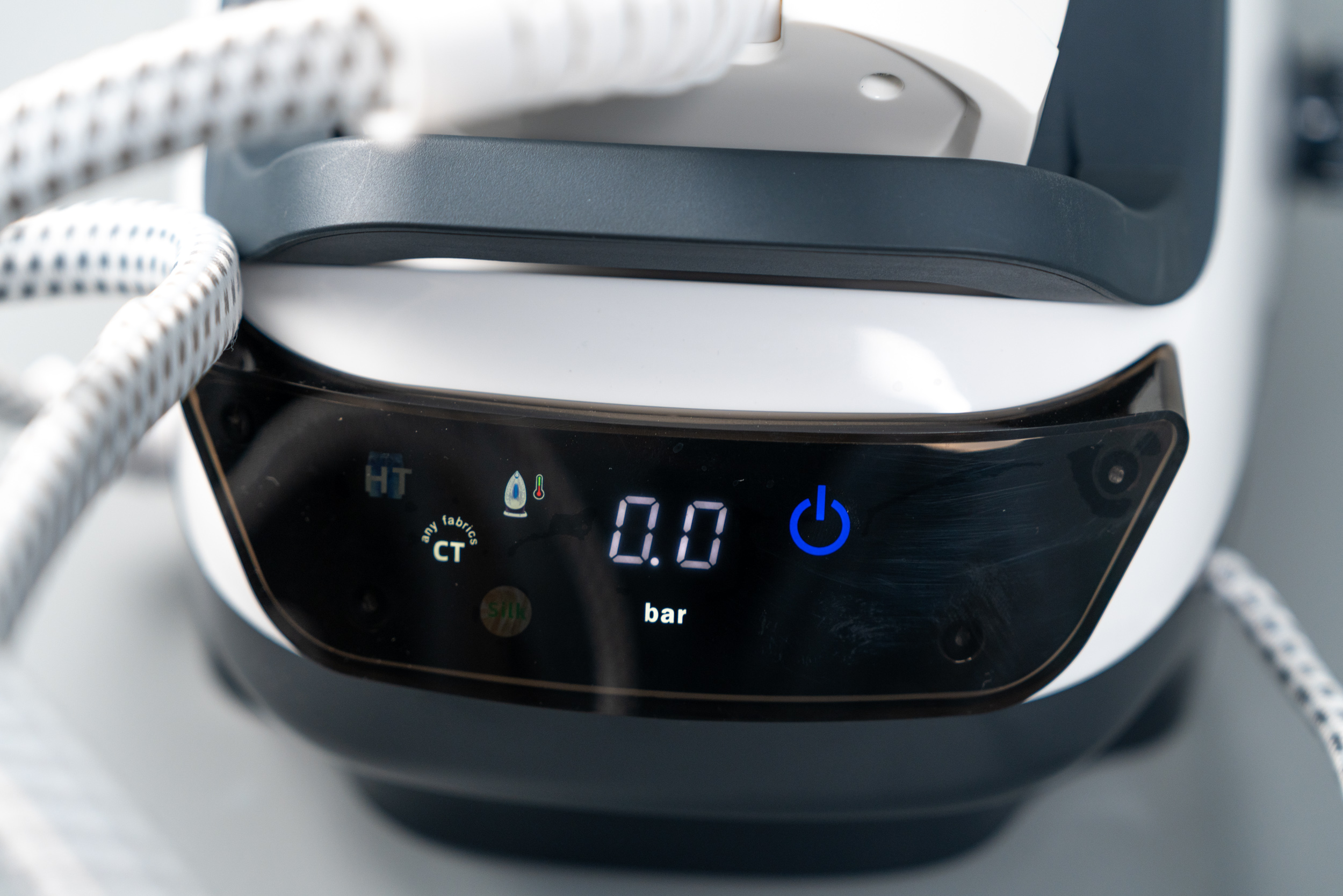 Управление в парогенераторе осуществляется при помощи сенсорных кнопок, располагающихся на тыльной стороне станции, и отображении информации на цифровом дисплее. В неактивном состоянии панель индикации находится в режиме ожидания, о чем сигнализирует подсветка кнопки питания синим цветом.