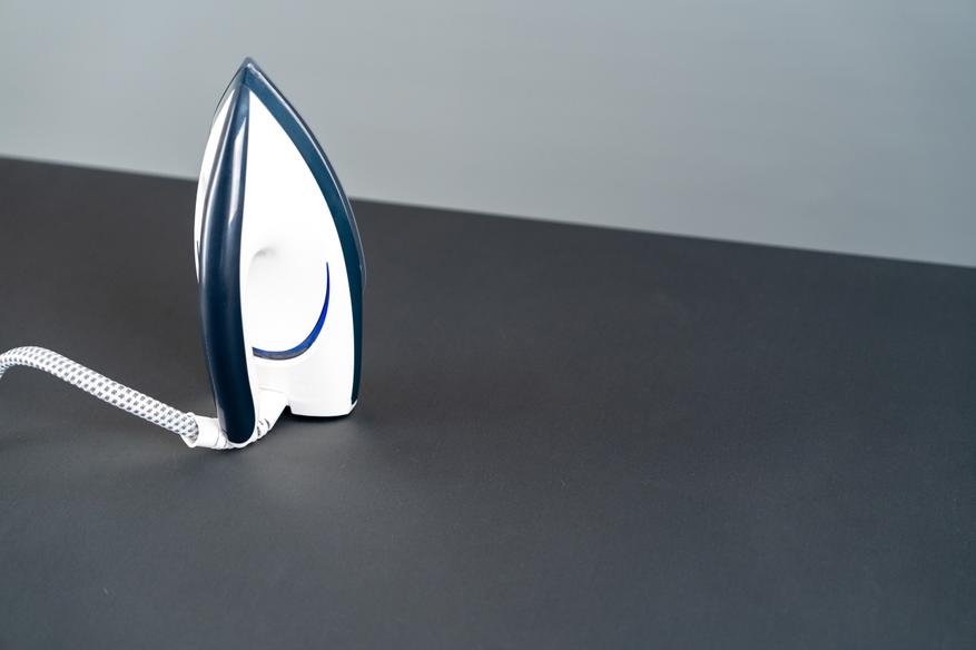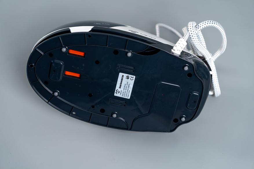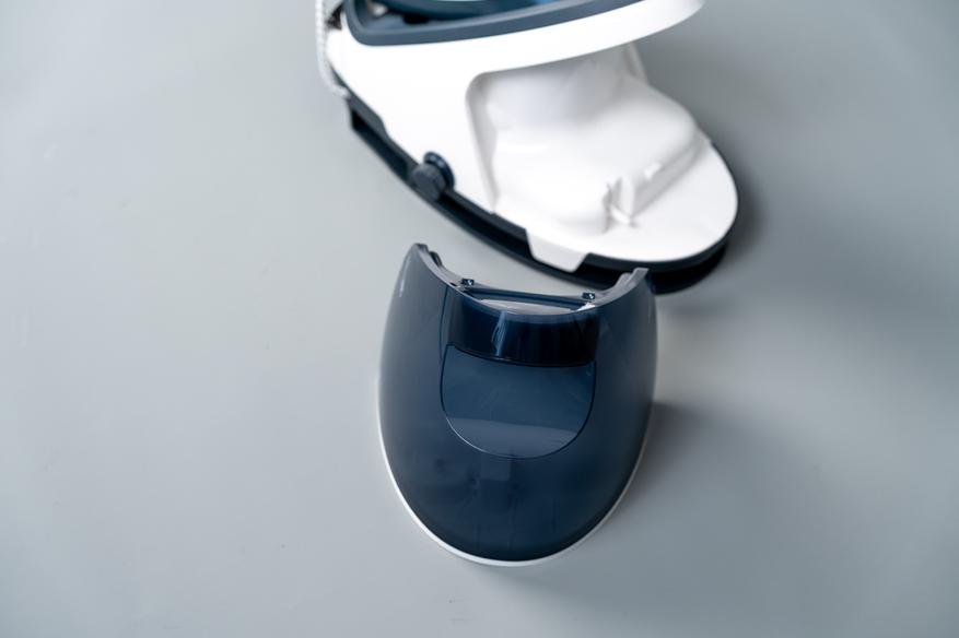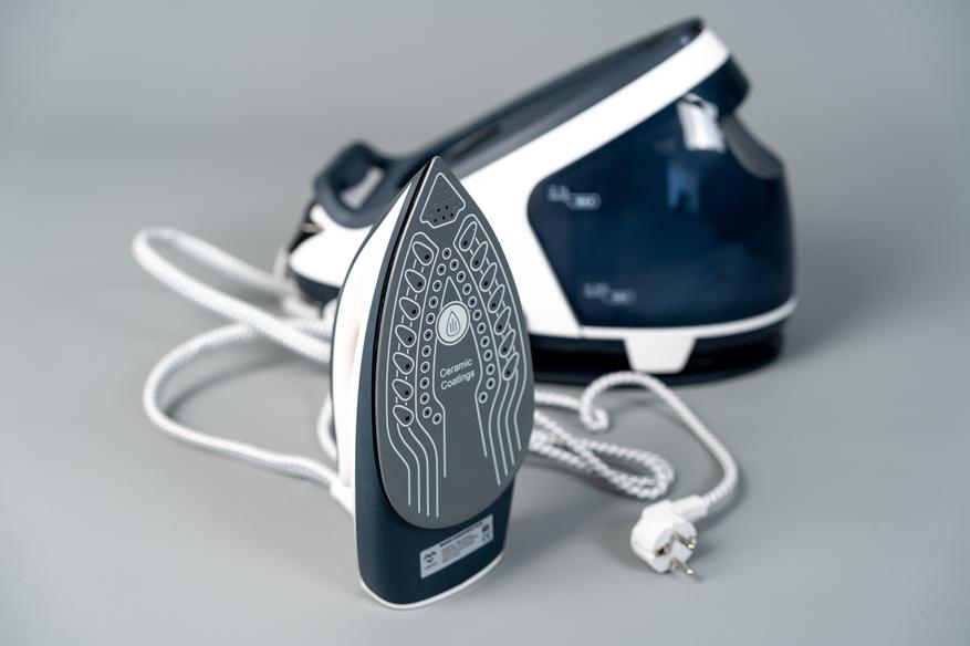 Рабочая поверхность площадью в 225 на 120 миллиметров представляет собой перфорированную керамическую подошву, способствующую равномерному распределению пара. Конструкция подошвы включает скругленный носок для обработки труднодоступных мест, например, вокруг пуговиц, а также скошенные края по периметру для комфортного глажения изделий в области швов и краев.