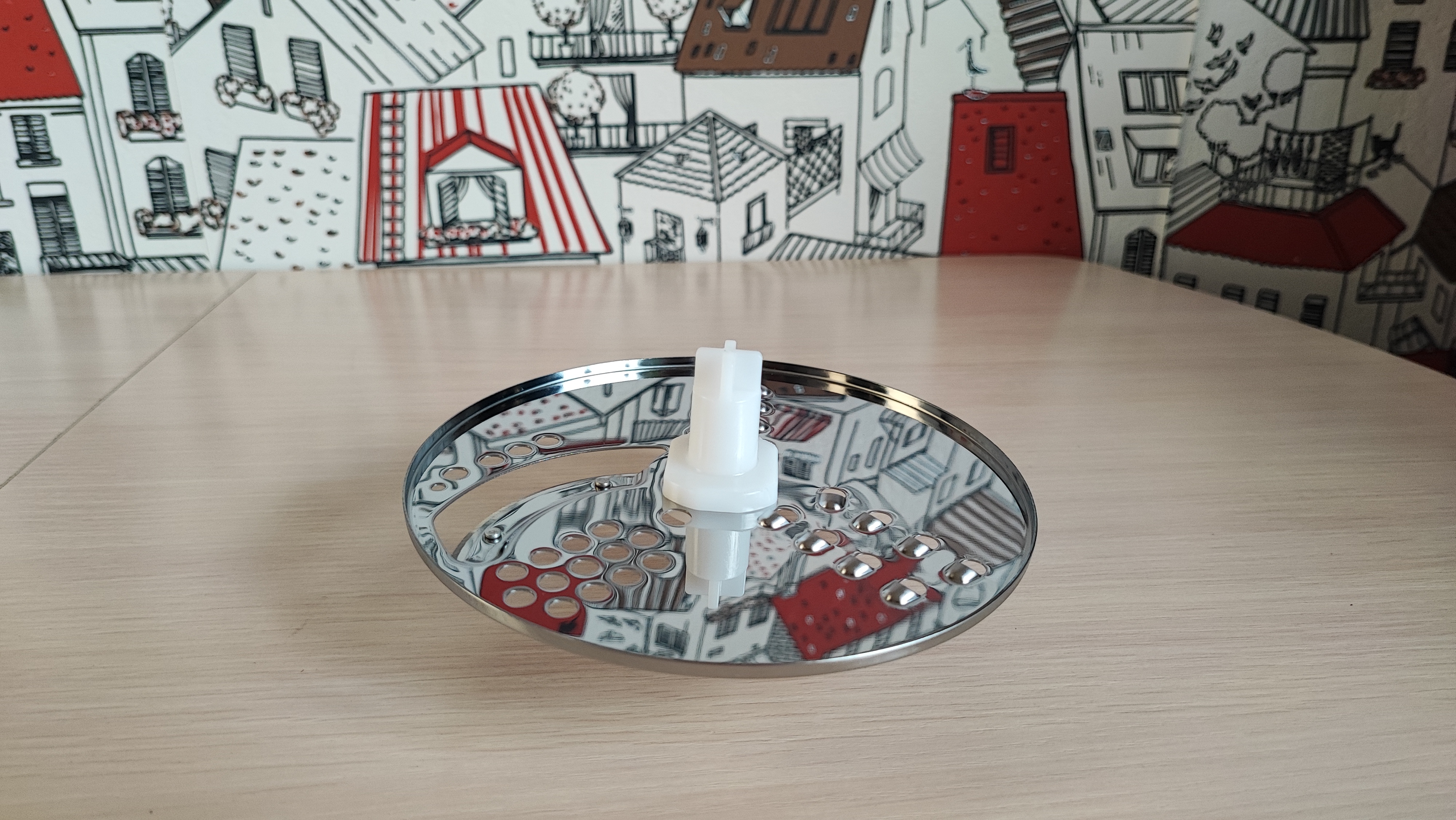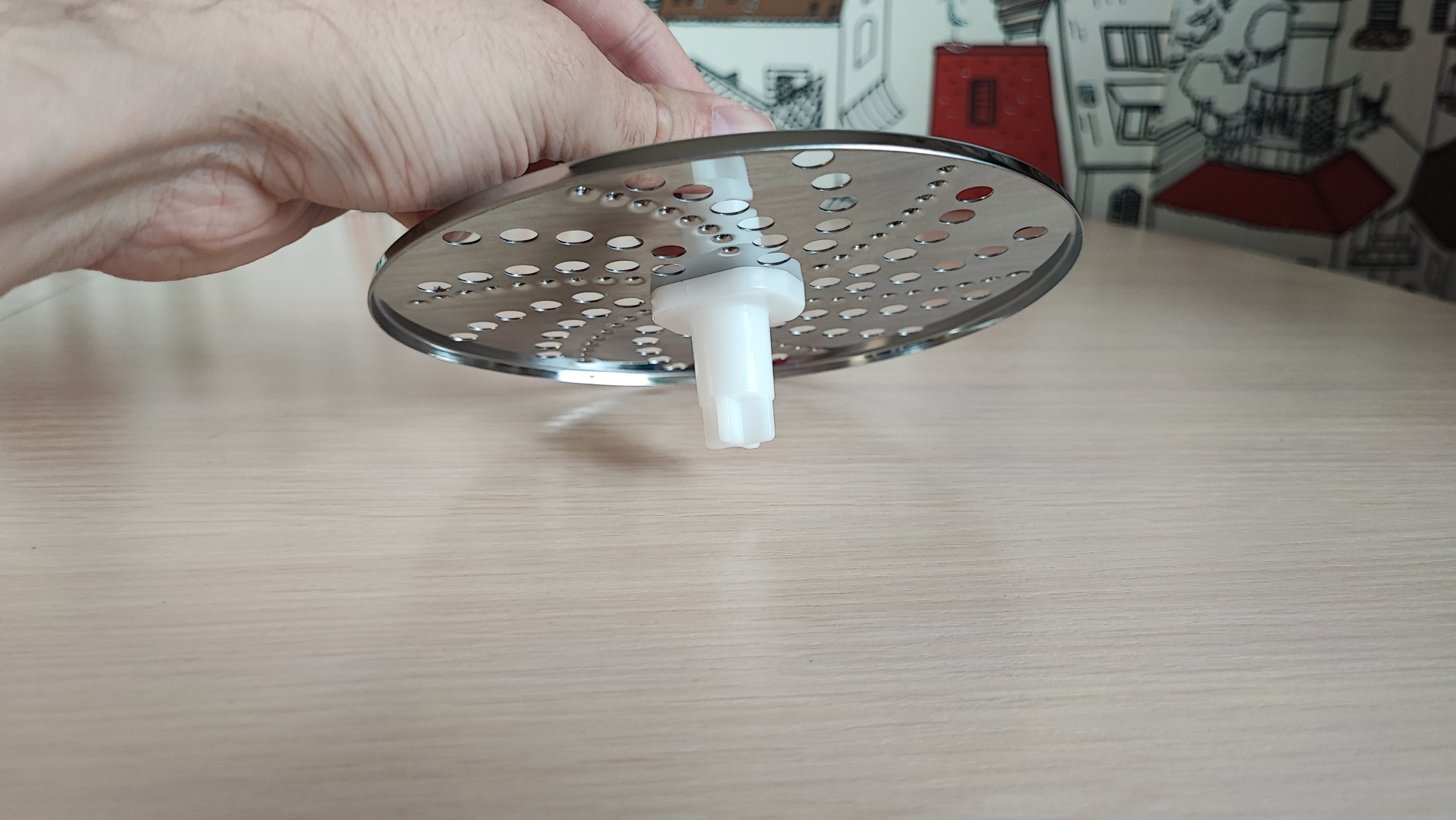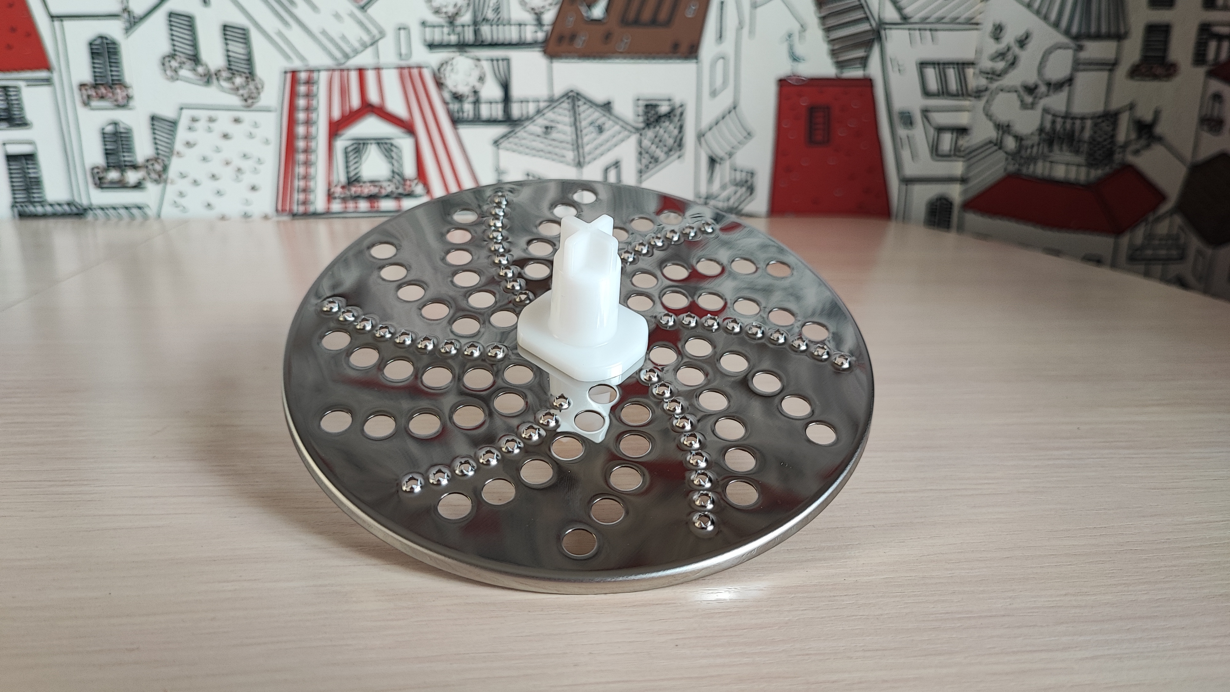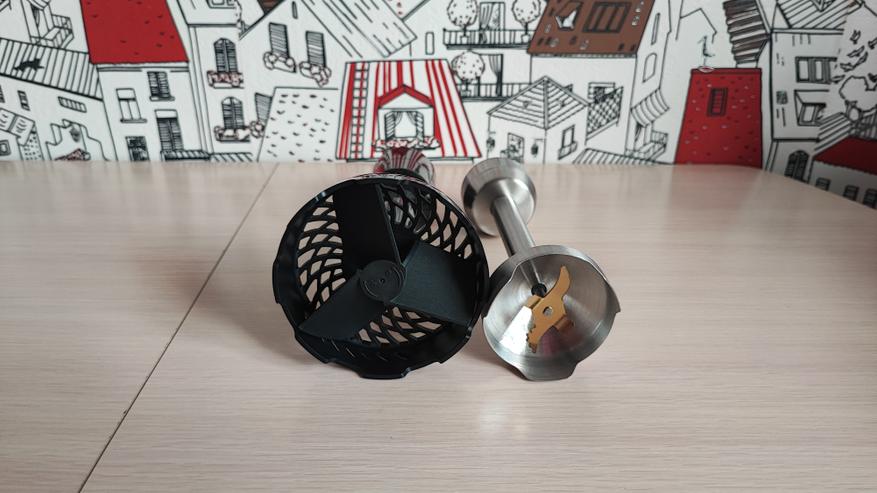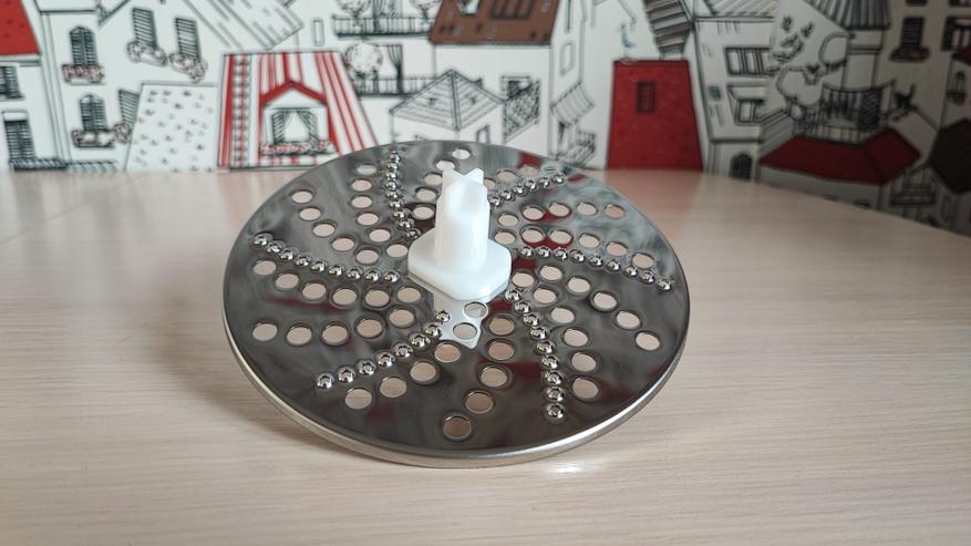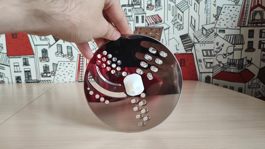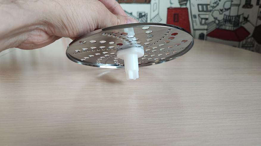 Перейдем к большой чаше для измельчения. В верхней части расположено крепление для блендера и отверстие для загрузки продуктов. Конструкция является разборной, верхнюю крышку необходимо разбирать для очистки после измельчения продуктов. Снизу расположено съемное вращающееся лезвие, прикрепленное к шестеренке. Режущие поверхности лезвий находятся сверху и имеют острую заточку. Внутри есть сеточка для нарезки продуктов квадратиками. Это удобно для приготовления, к примеру салата оливье, быстро закинул все ингредиенты, прокрутил и все готово. Больше не нужно нарезать вручную.