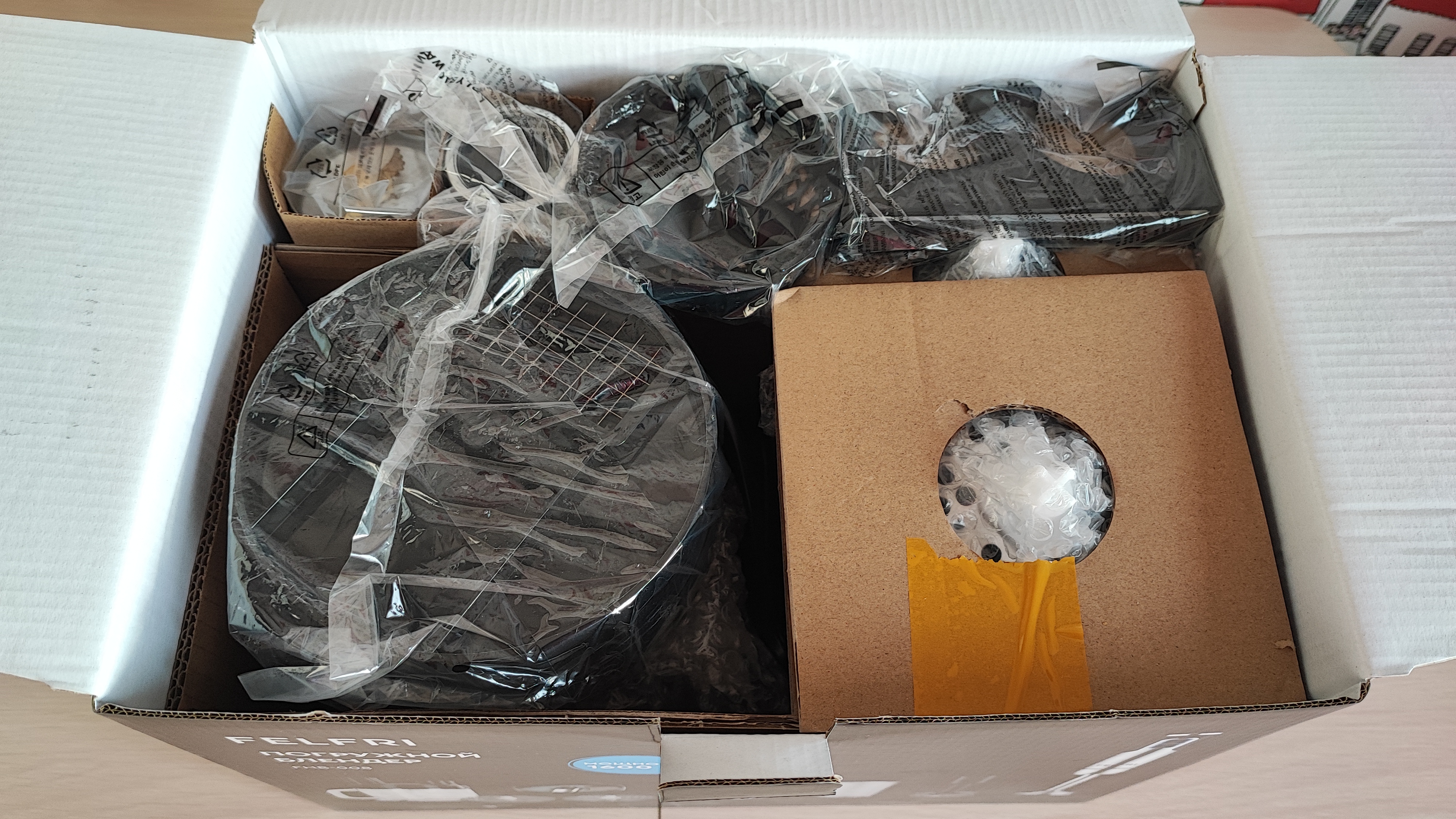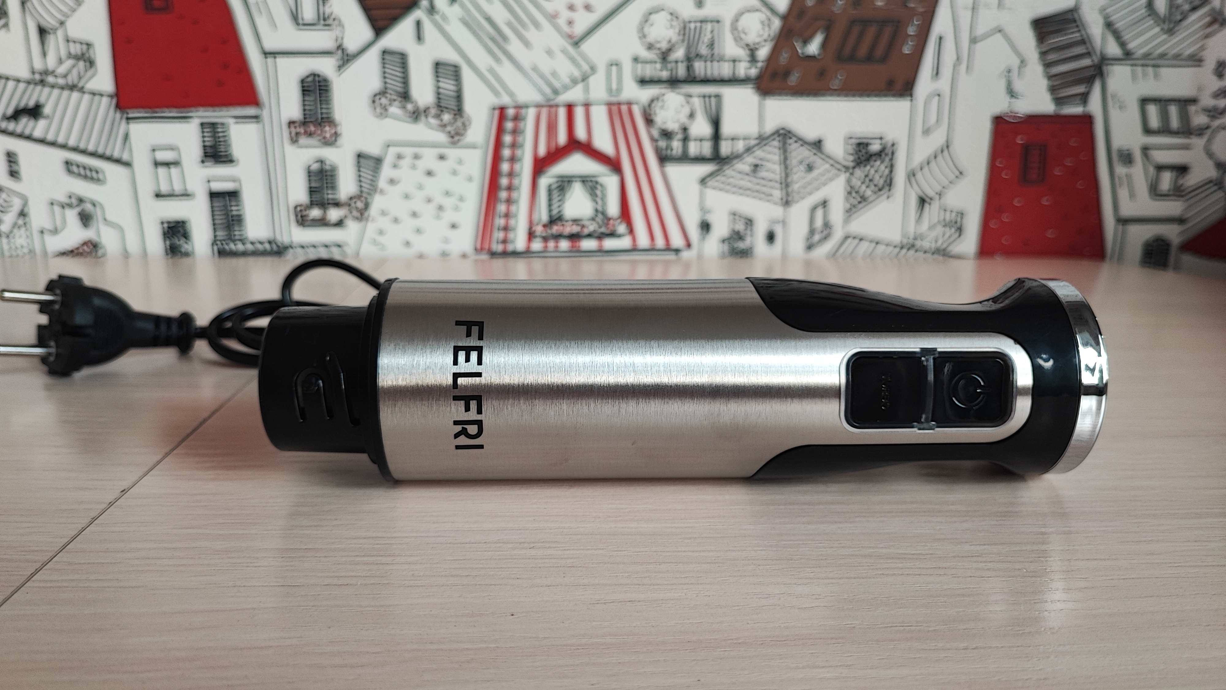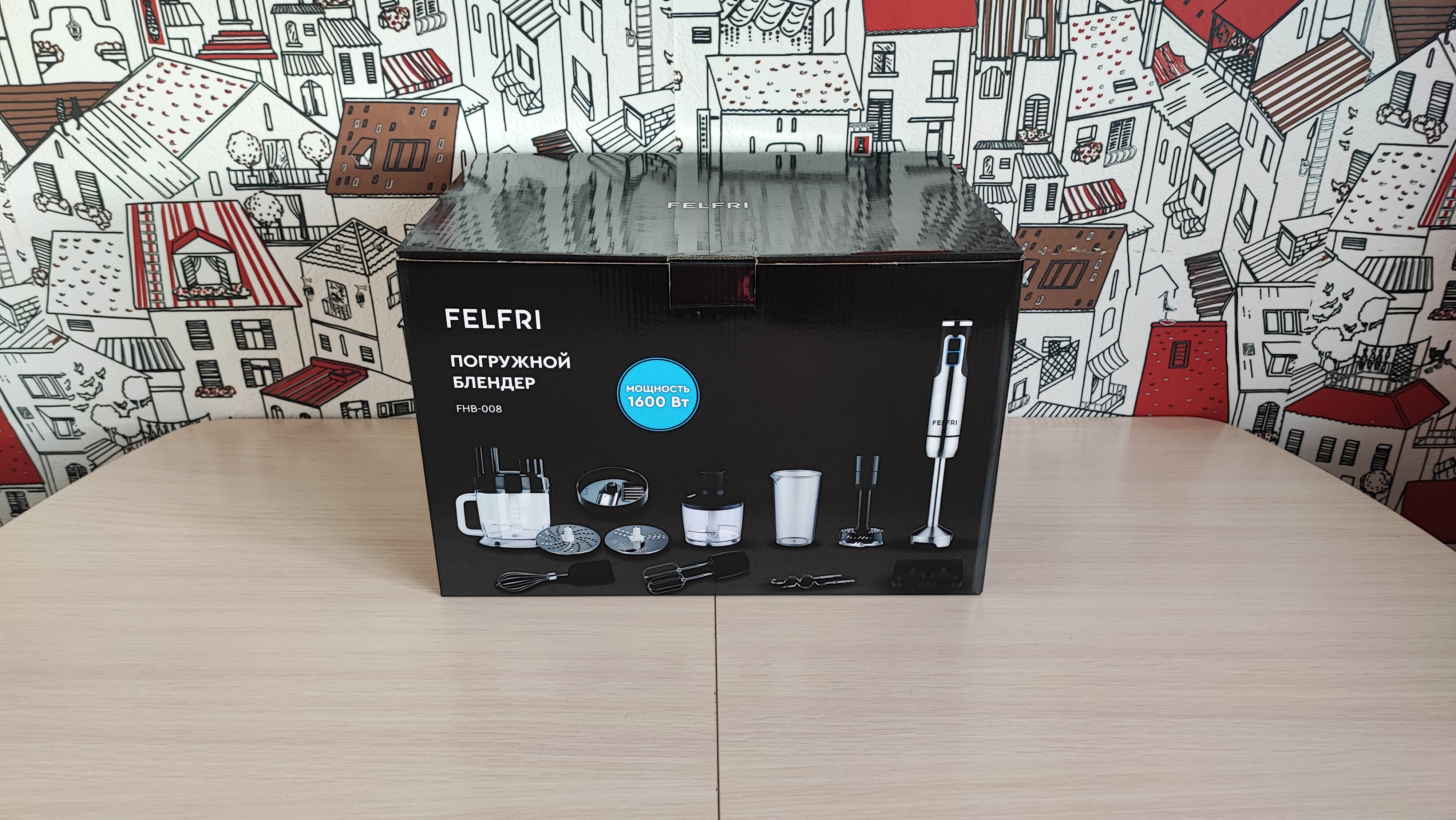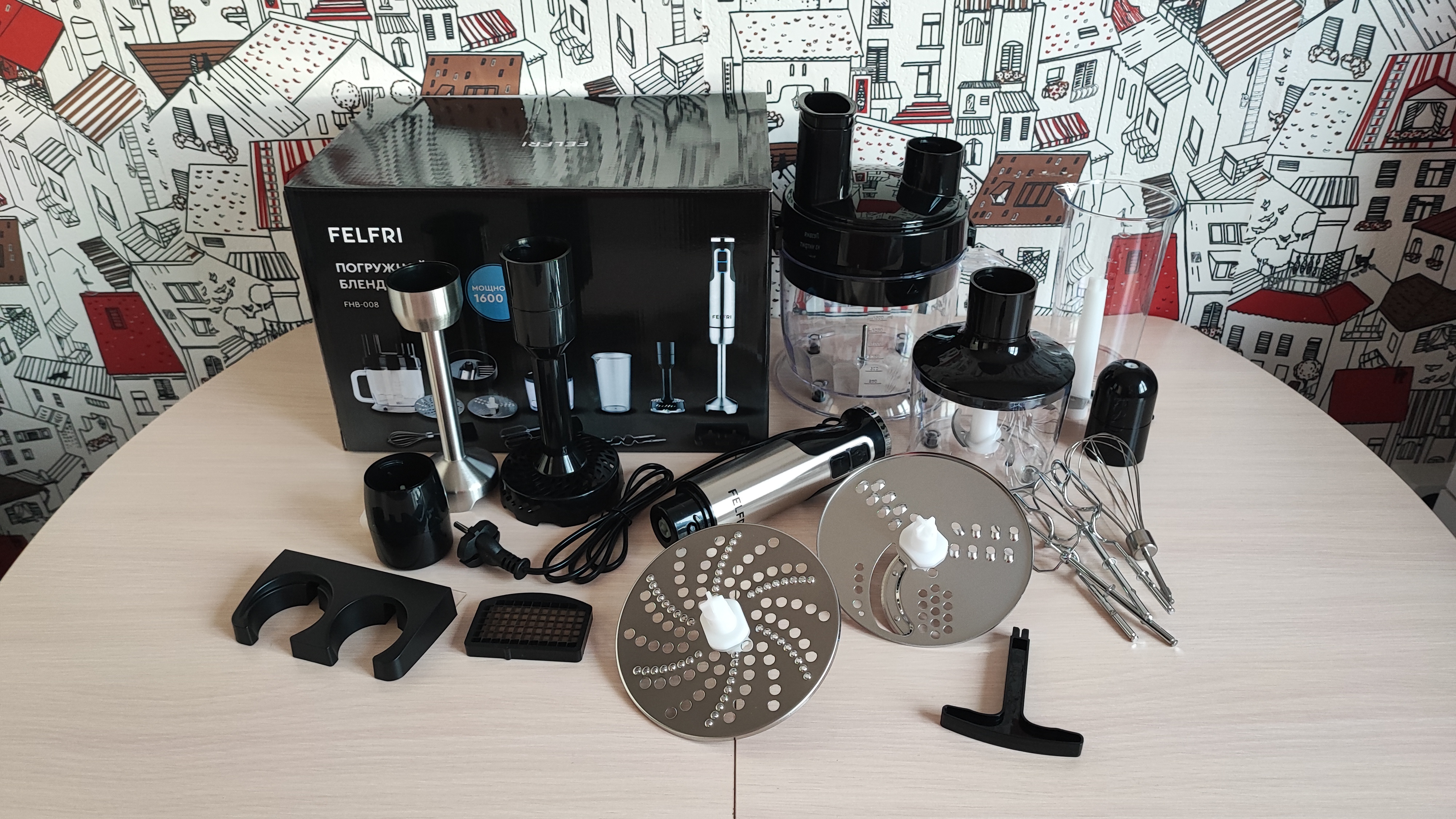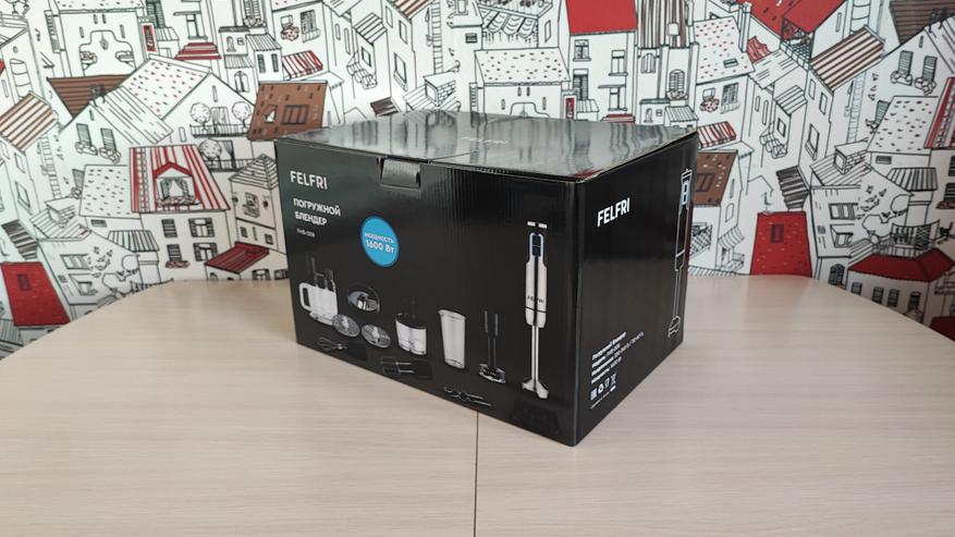 Одним из полезных устройств на кухне, на мой взгляд является погружной блендер. Хорошо, когда к нему идет множество насадок, полезных для приготовления различных блюд. Сегодня поговорим про такой блендер. Итак, FELFRI FHB-008. Мощность 1600Вт, оснащен 12 скоростями работы, в комплекте 9 насадок, есть возможность нарезки кубиками, кружочками, слайсами. Давайте посмотрим его в деле. Поехали!