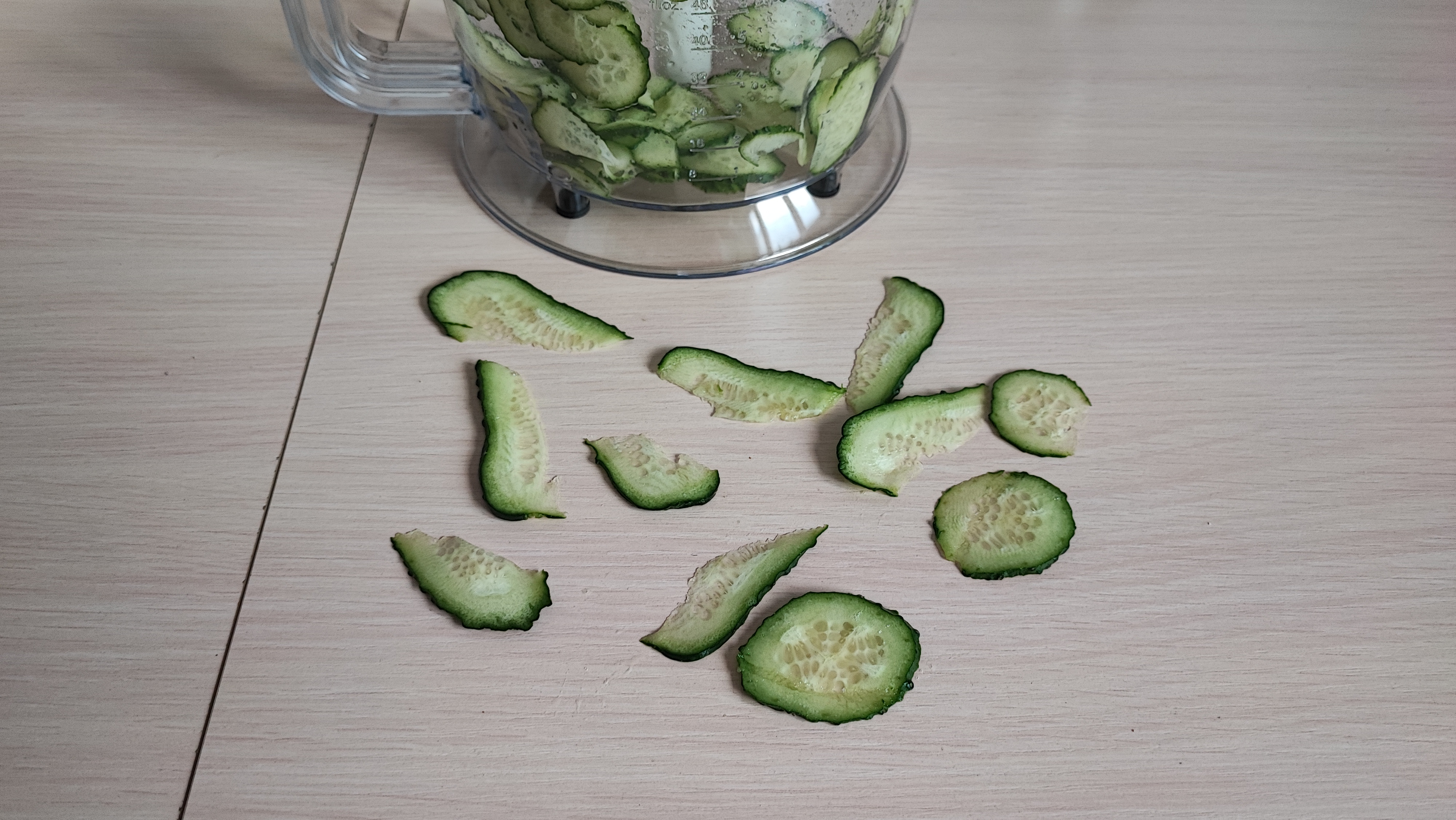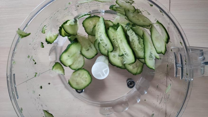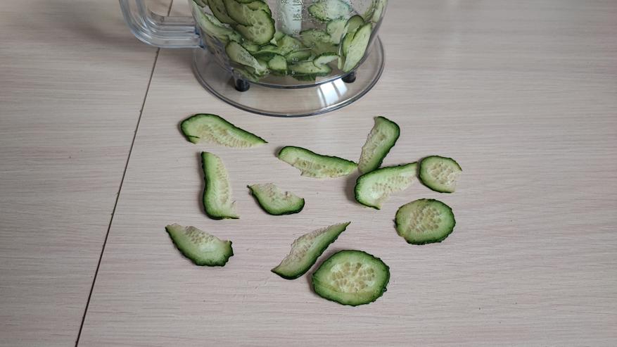 Следующий эксперимент тоже провел с огурцами. Установил насадку из комплекта, которая нарезает слайсами и опустил огурец в блендер. На фото ниже вы можете посмотреть, как он нарезал его аккуратными кружочками. Можно подавать на стол как самостоятельное закусочное блюдо или же делать канапешки.