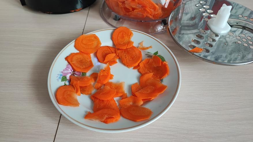 Далее тут же порезал и морковку. Получились такие же аккуратные кружочки. На фото ниже вы можете посмотреть результат.