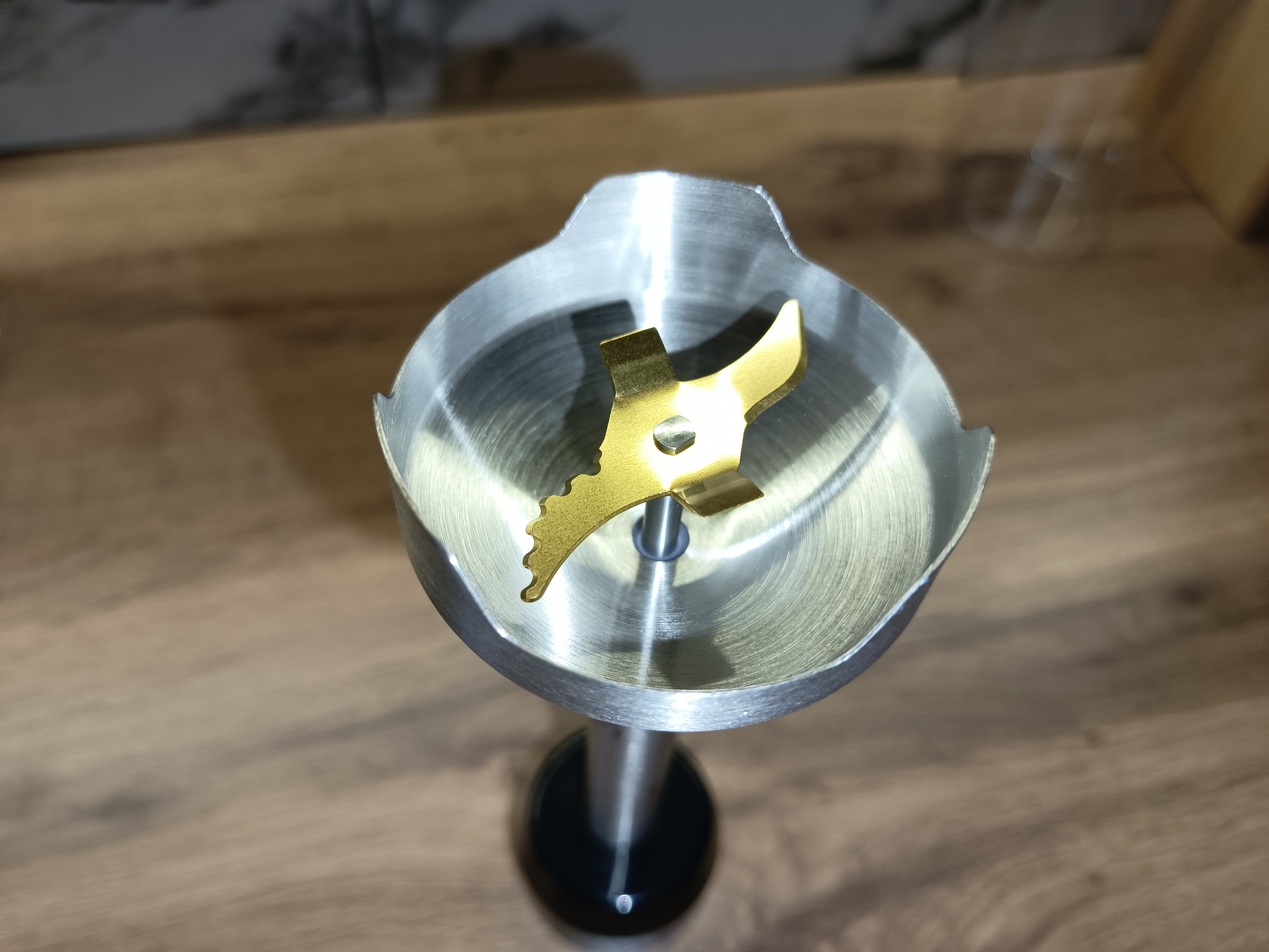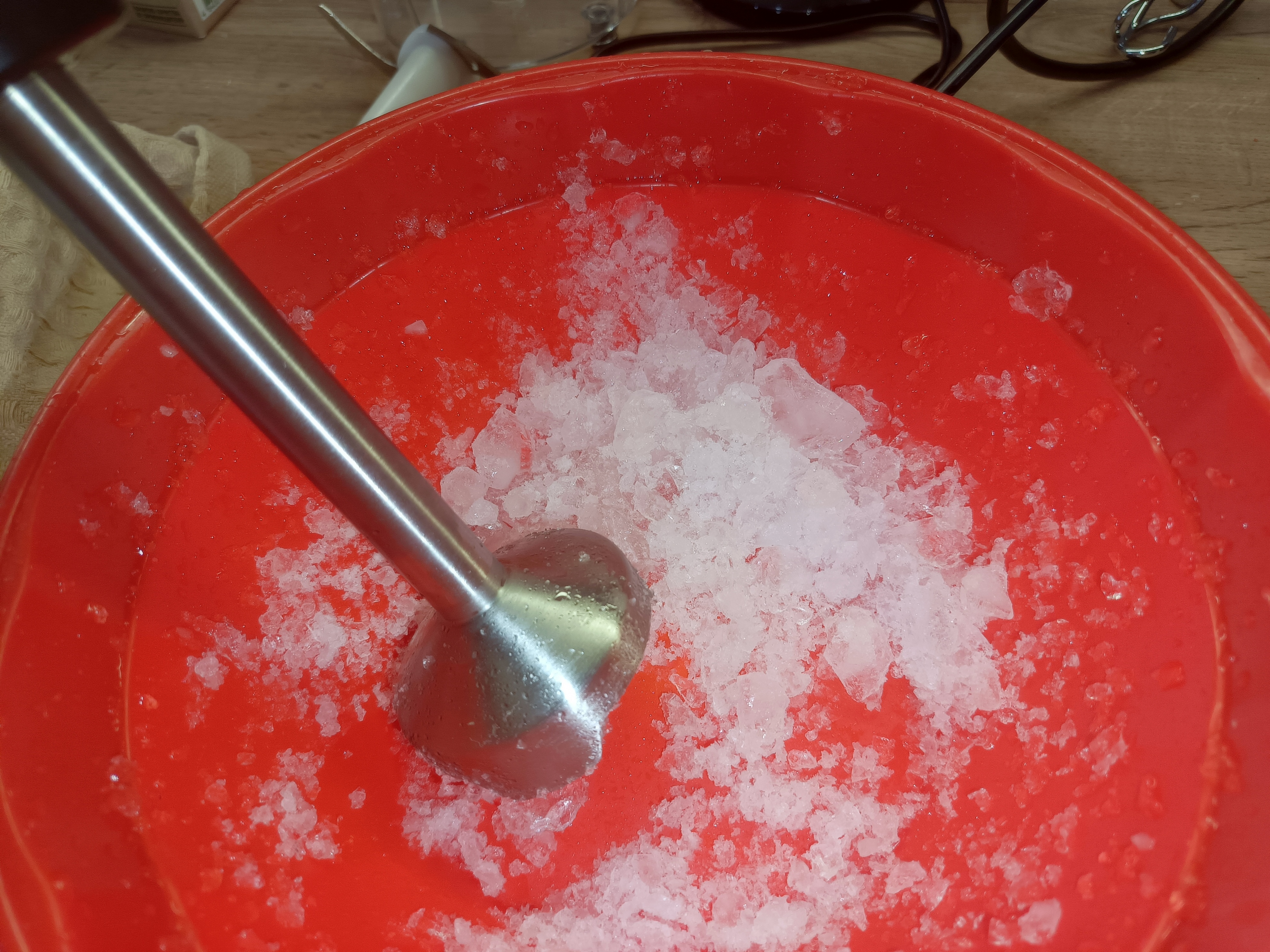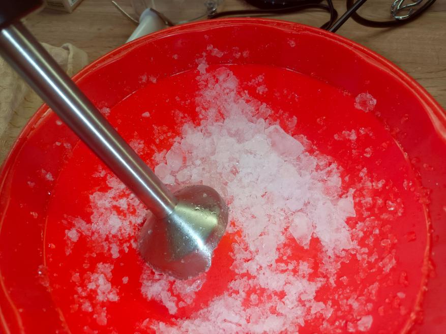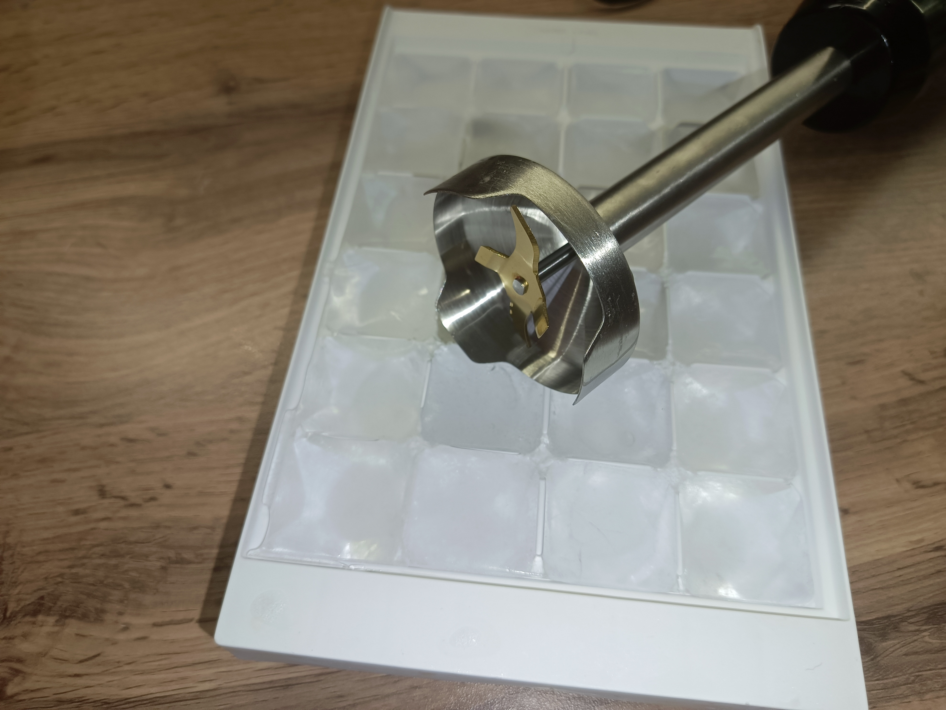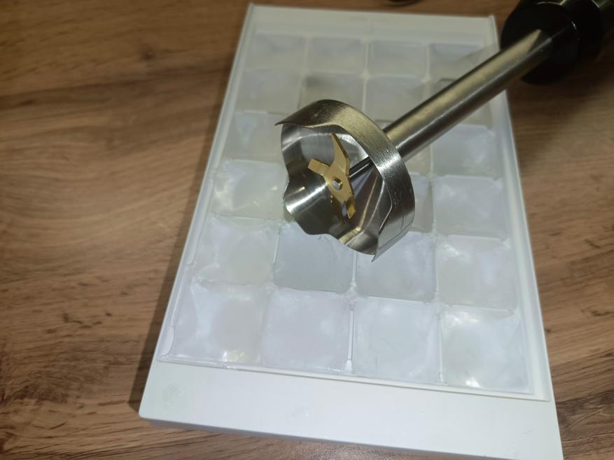 Насадка для измельчения изготовлена из нержавеющей стали, а сами лезвия имеют титановое покрытие со специальной формой, которая позволяет расколоть даже лед. Я взял классическую форму с кубиками льда и измельчил его за пару секунд. Дробленый лед пригодится для приготовления коктейлей или подачи рыбы и морепродуктов.