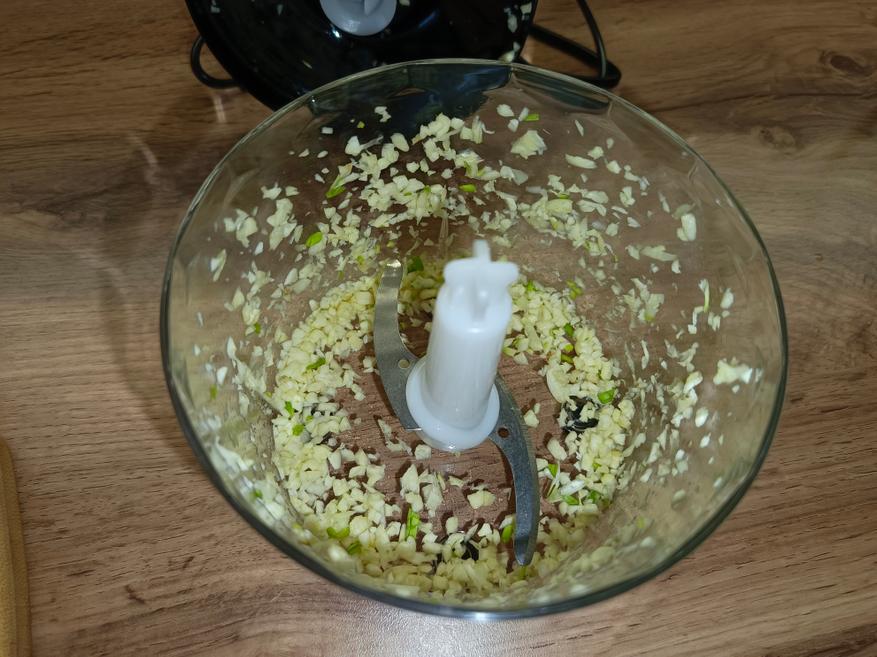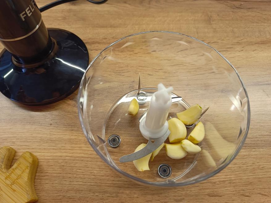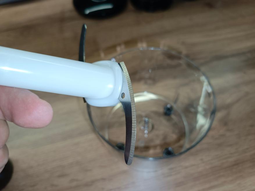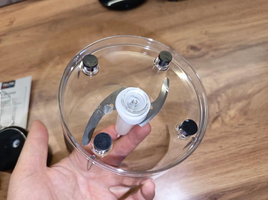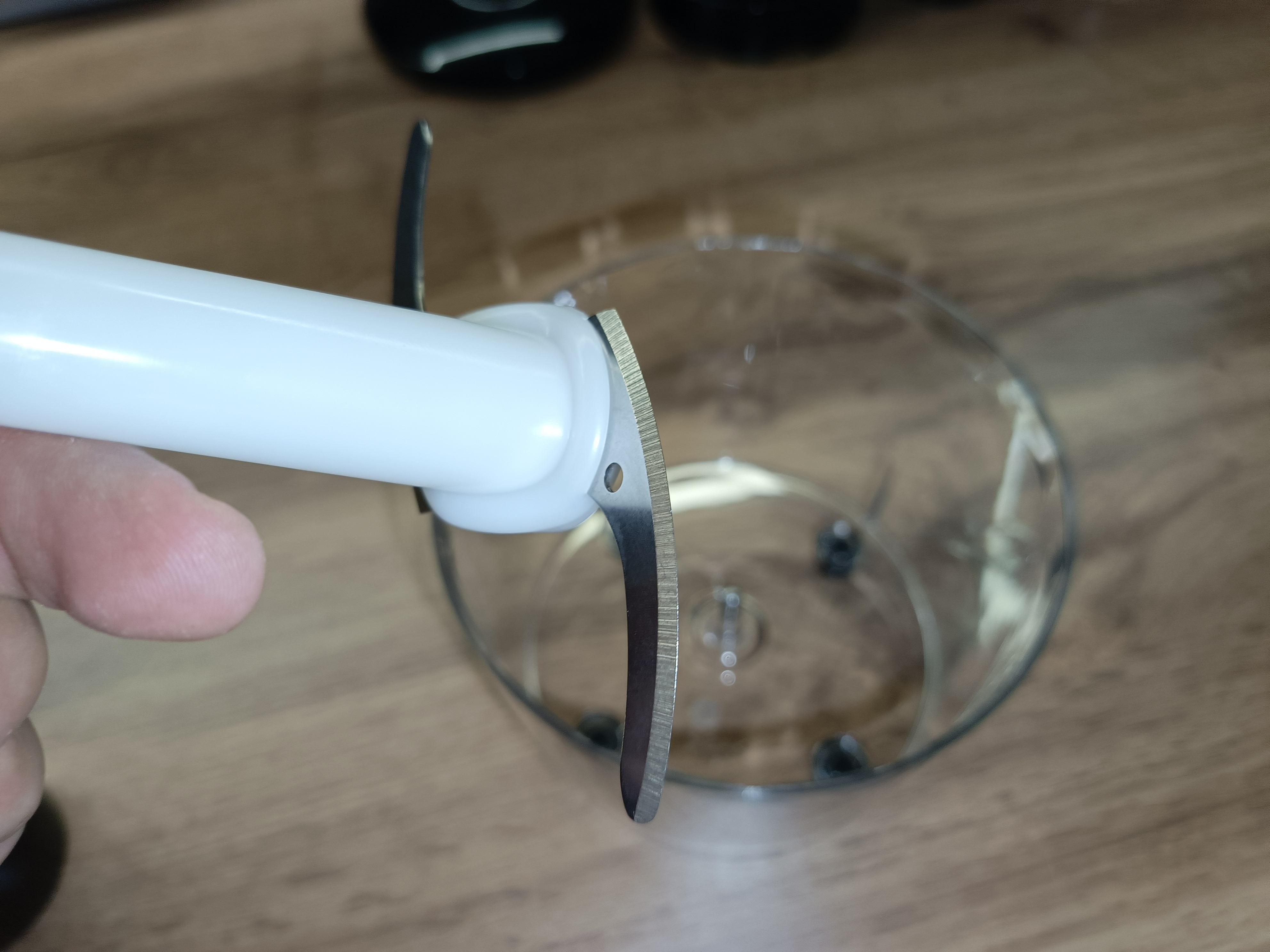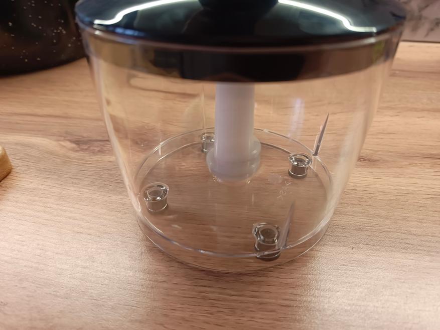 Следующая на очереди — это стакан для измельчения. Пластиковый корпус с объемом 860 мл и съемной крышкой. Для устойчивости на столе предусмотрены резиновые накладки. Внутри двойной S-образный нож с хорошо заточенными лезвиями. С помощью этого стакана приготовлю рубленые котлетки с луком.