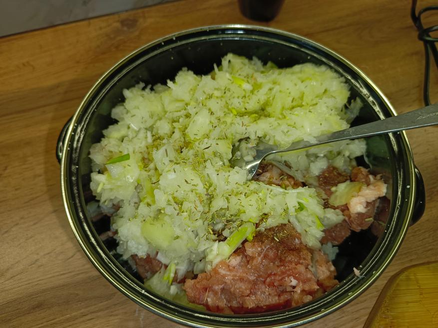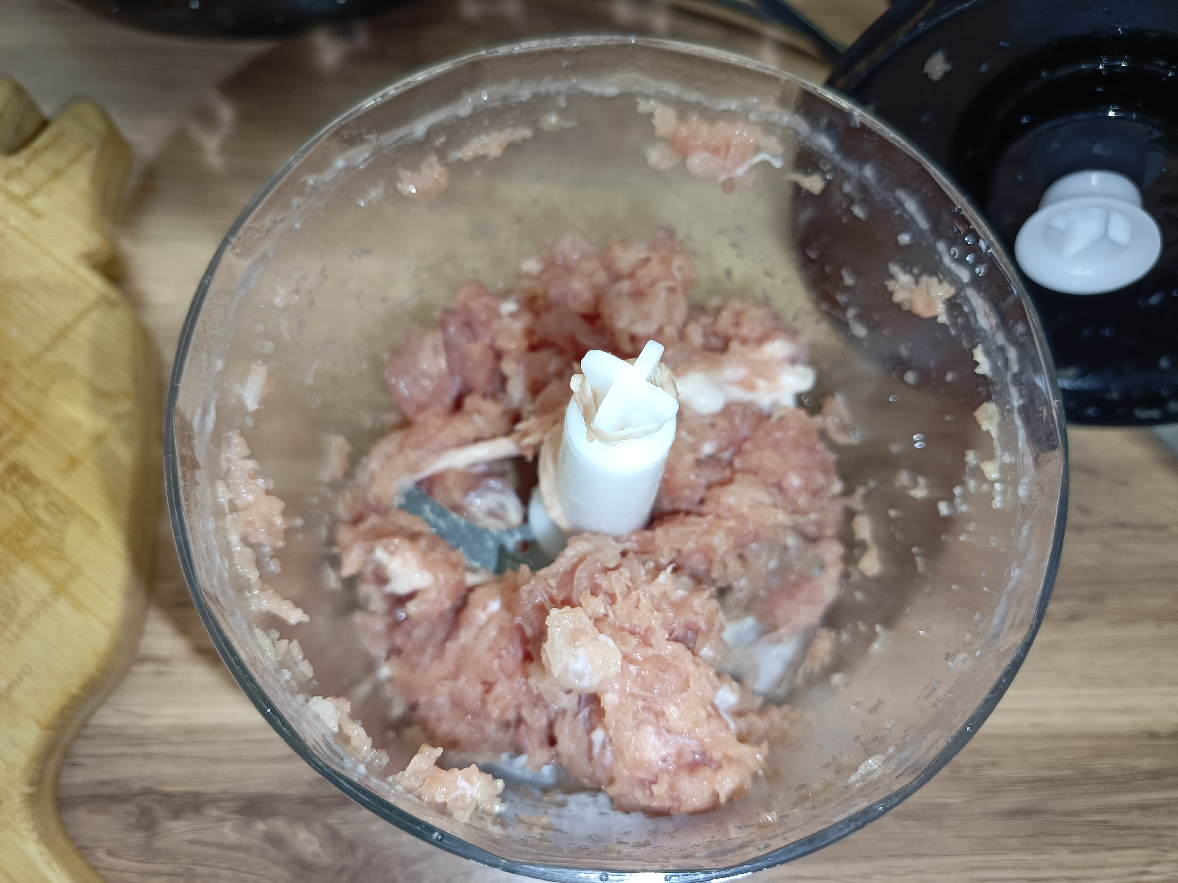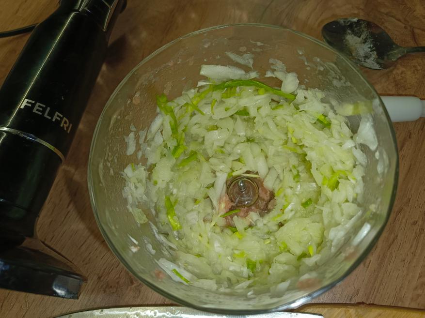 Режем мясо небольшими кусочками, укладываем в чашу и измельчаем до нужной консистенции. Примерно секунд 10-15, и готово. Получившуюся массу перекладываем в миску и так же делаем с луком. Добавляем для клейкости и вкуса три столовые ложки муки, а также соль и перец и всё хорошо перемешиваем.