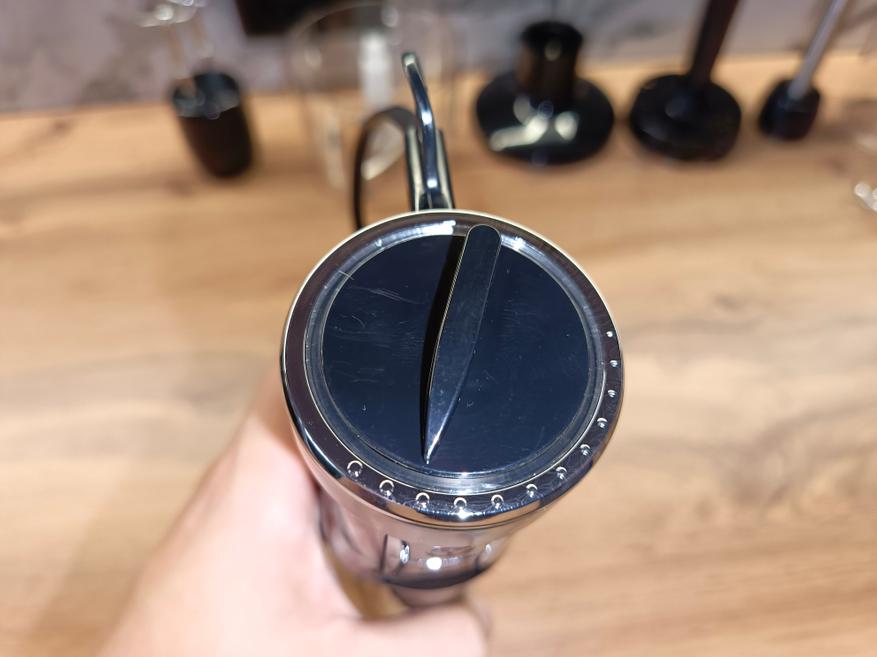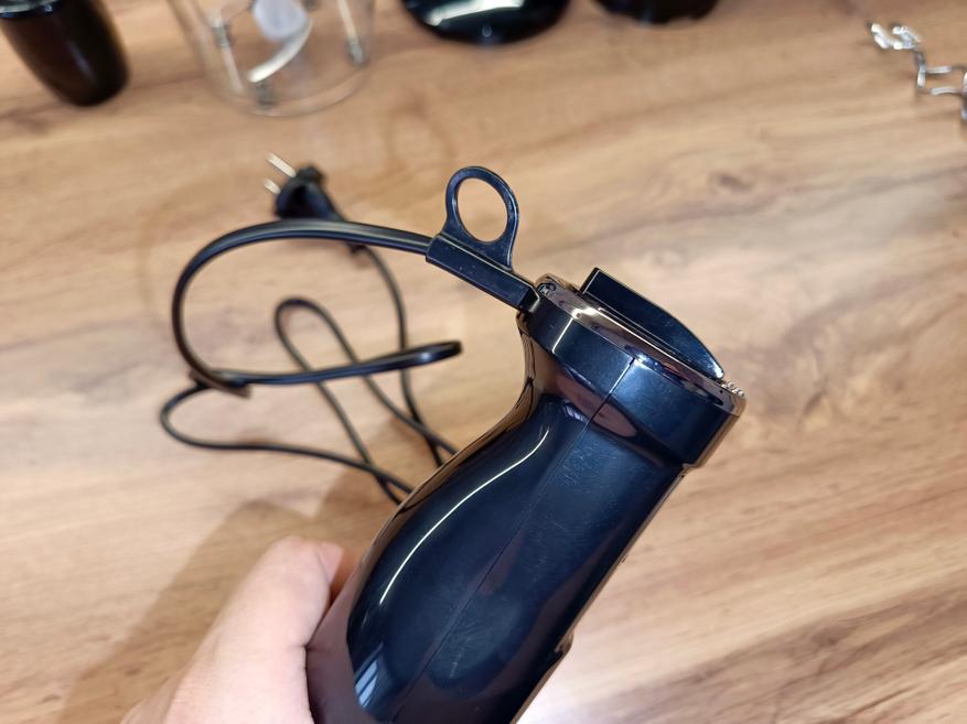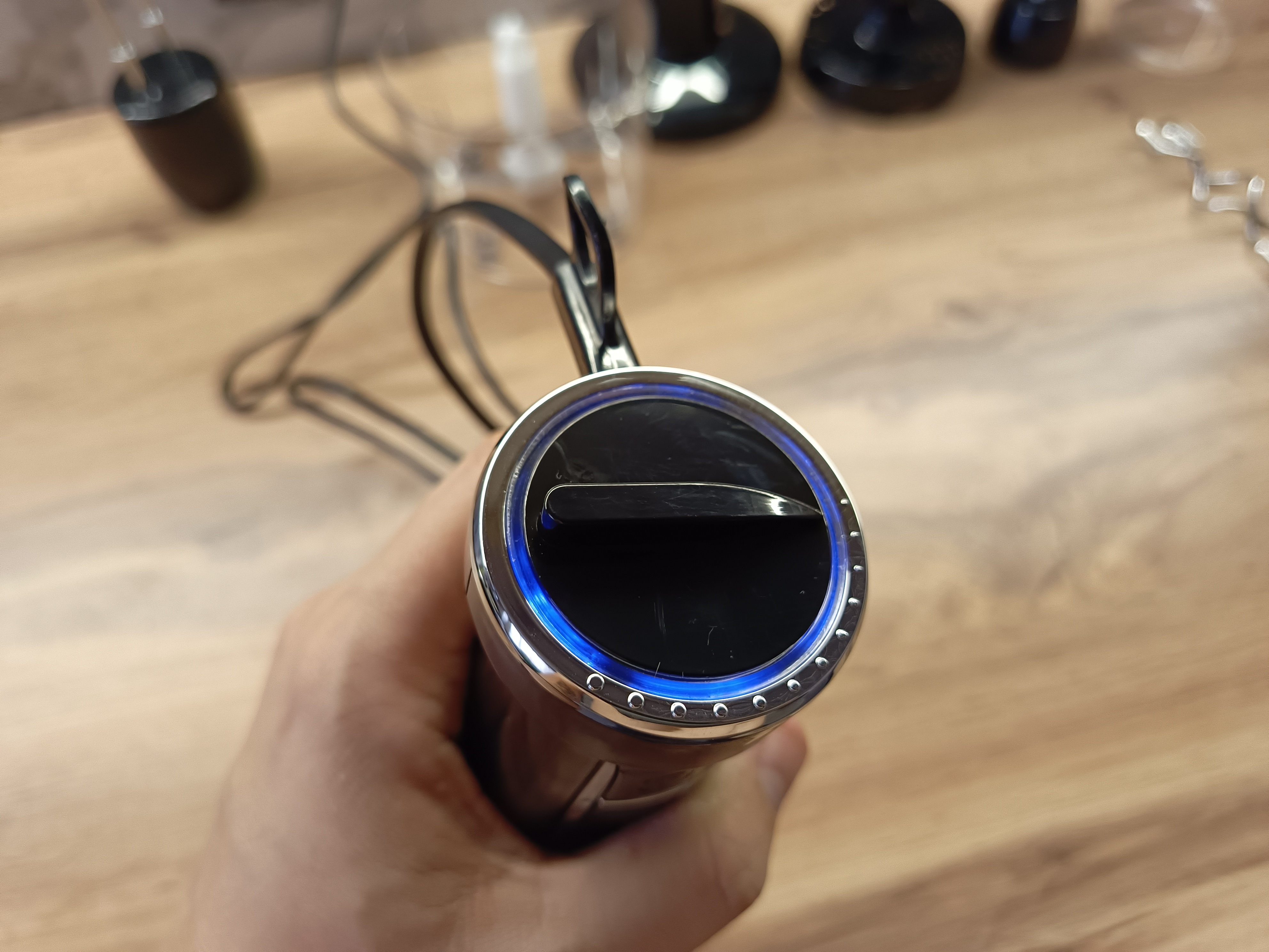 Естественно, все насадки работают от одного блока с электродвигателем мощностью 1600 Вт. Две механические кнопки, одна работает через регулятор скорости, где предусмотрено 12 скоростей и режим TURBO — работает на максимальной скорости. Типичная форма и ничего лишнего. Скорости изменяются круговым регулятором в верхней части с синей подсветкой. Провод длинный и позволяет комфортно работать вблизи розетки.
