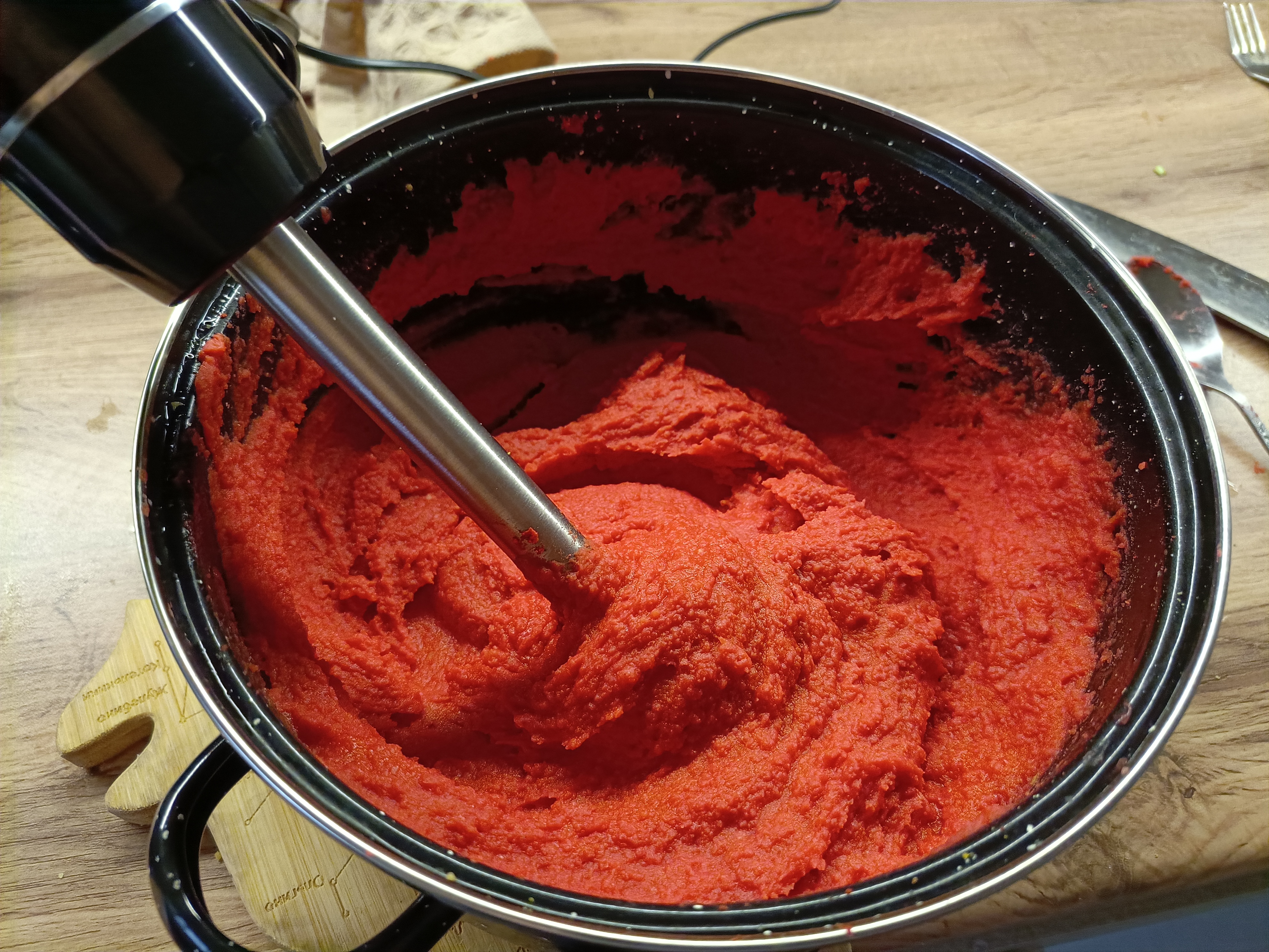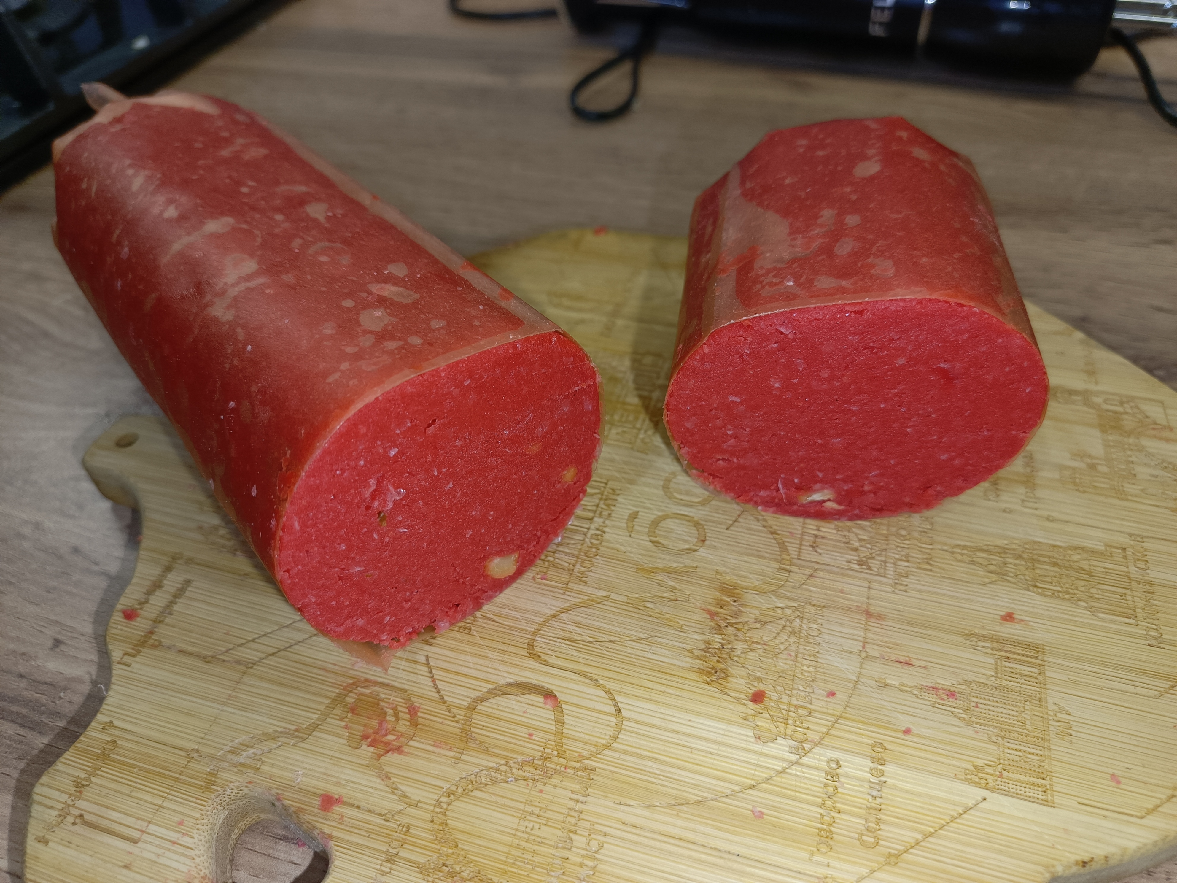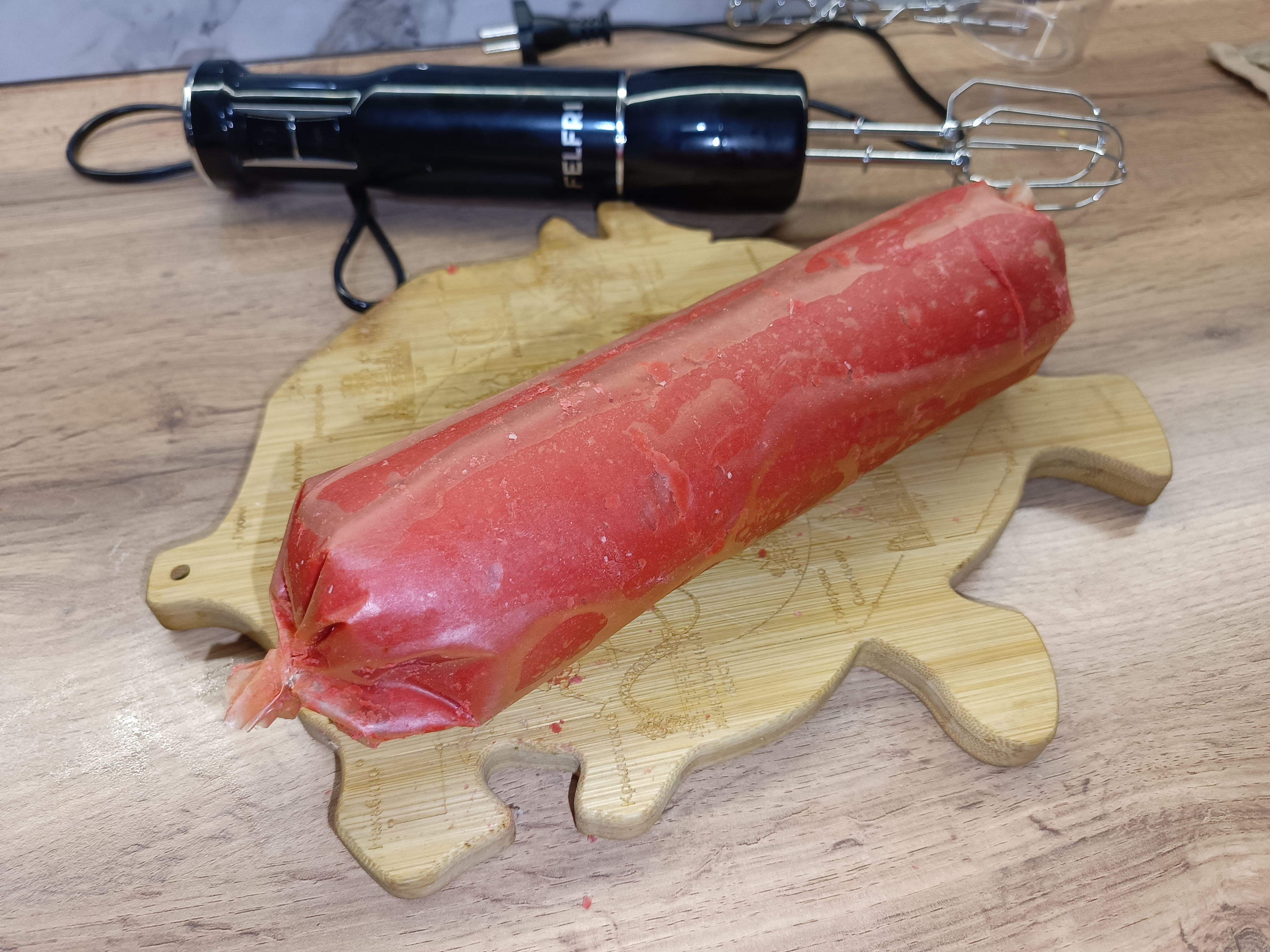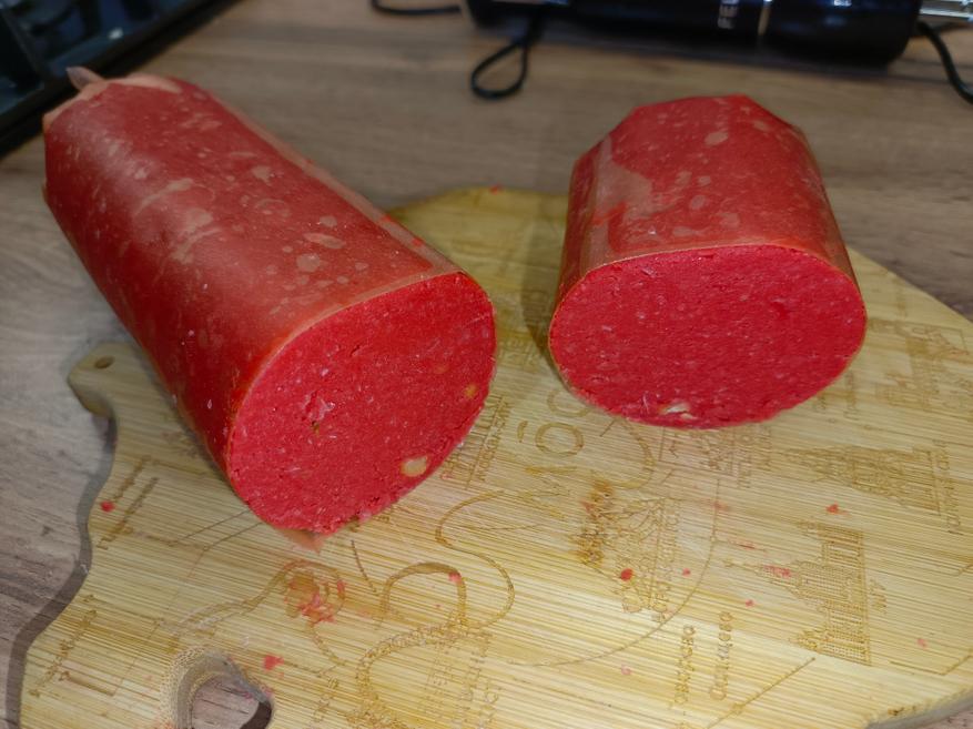 В дополнении решил посмотреть, как она справиться с горохом нут, из которого я приготовил что-то похожее на вегетарианскую колбасу. Заранее сваренный нут, измельченный чеснок, разведенный агар-агар смешал в единую массу и поместил в колбасную оболочку. Спустя час нахождения в холодильнике колбаска была готова. Отлично подходит для бутербродов, особенно на хлеб с маслом. Для цвета добавил свекольный краситель, и вот здесь слегка переборшил.