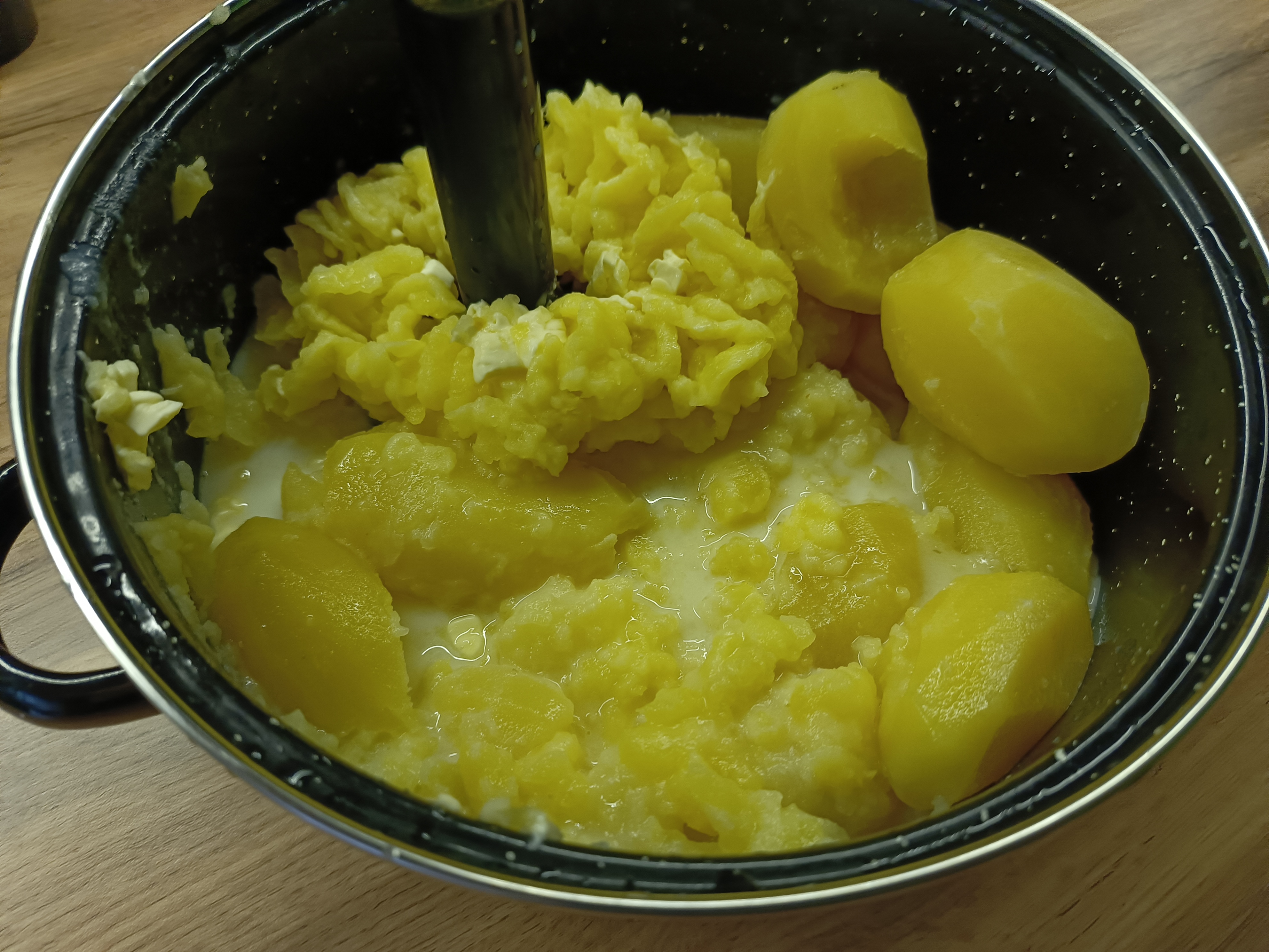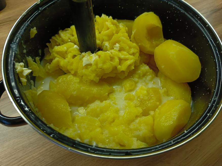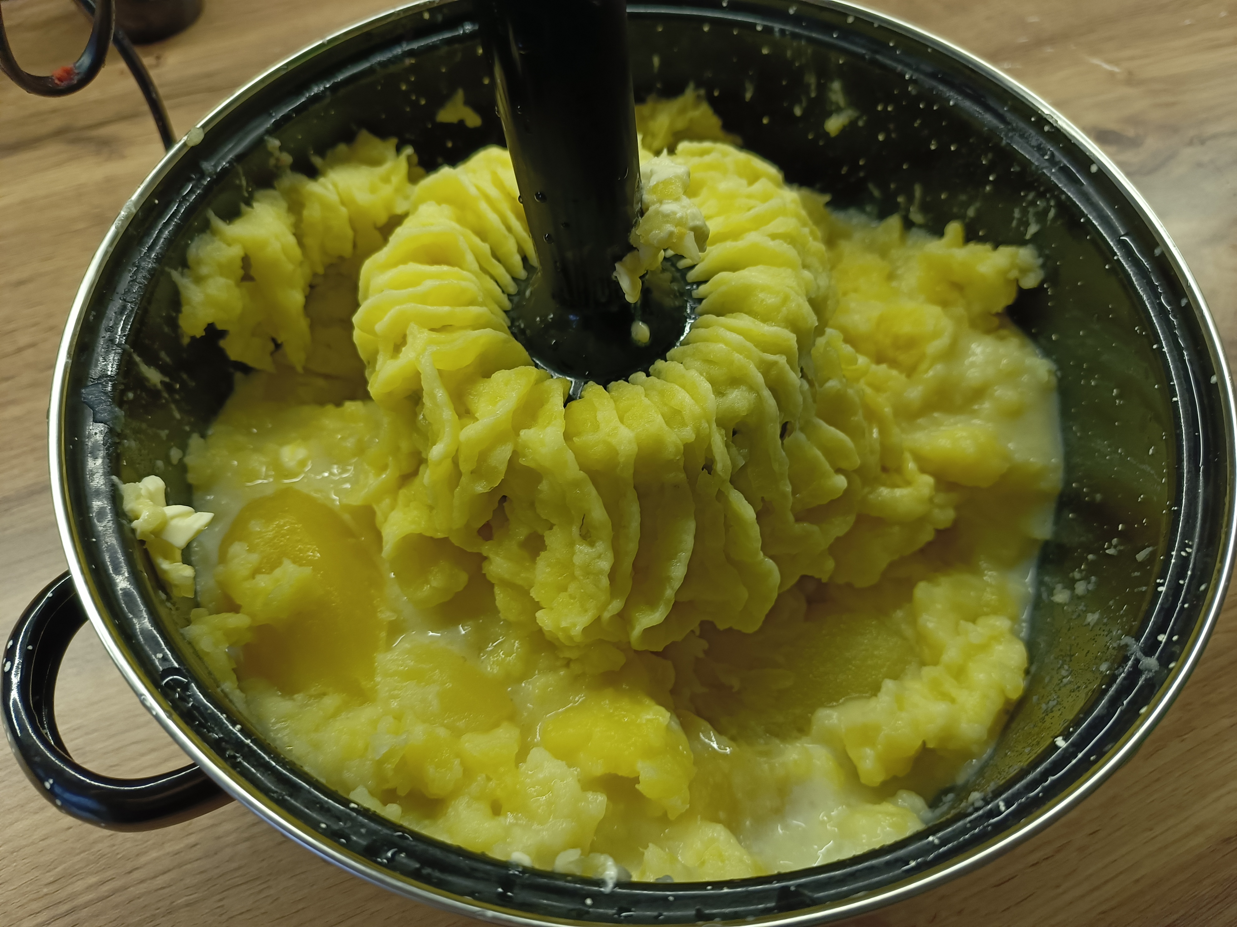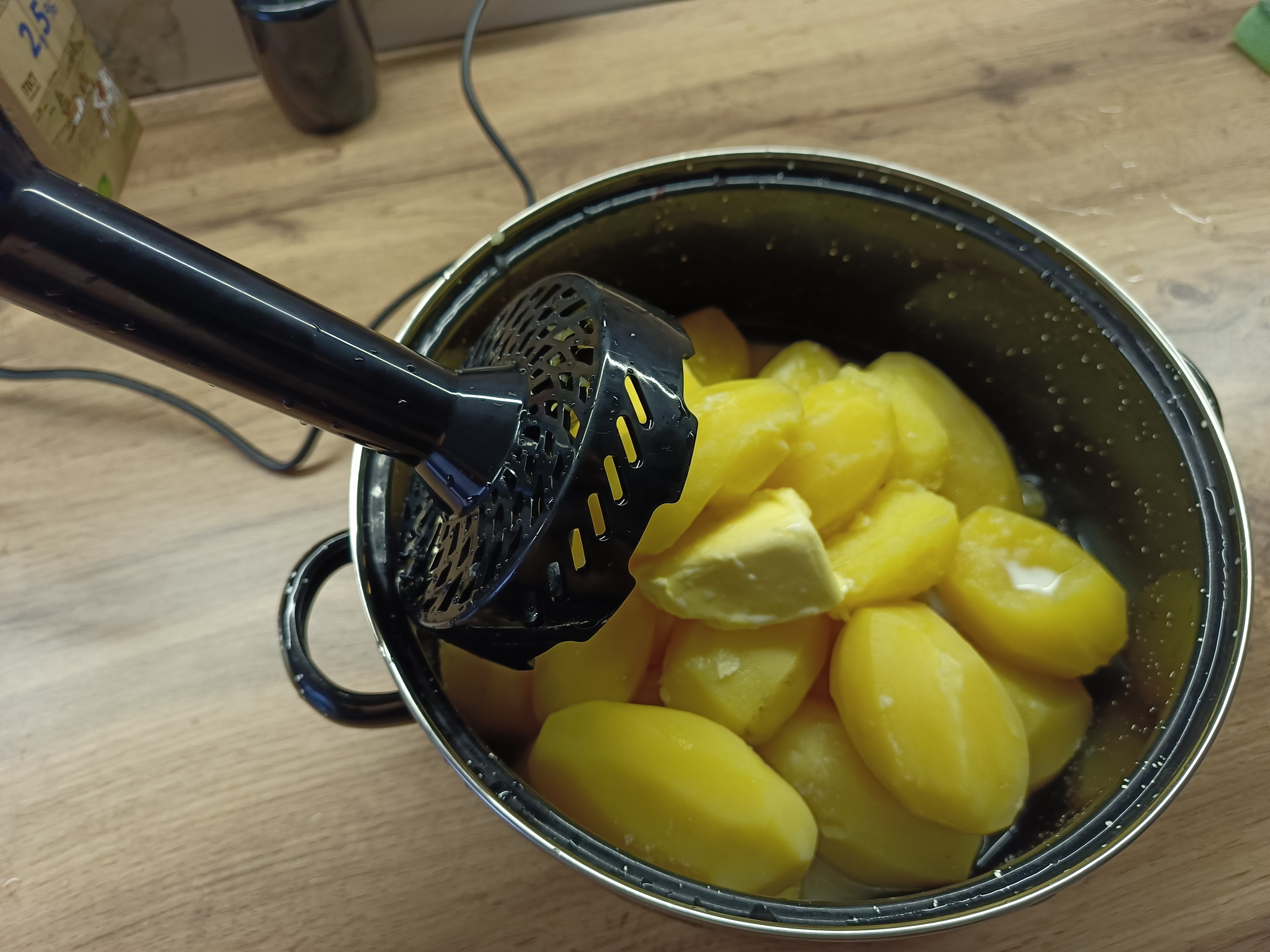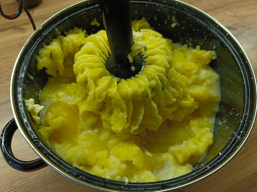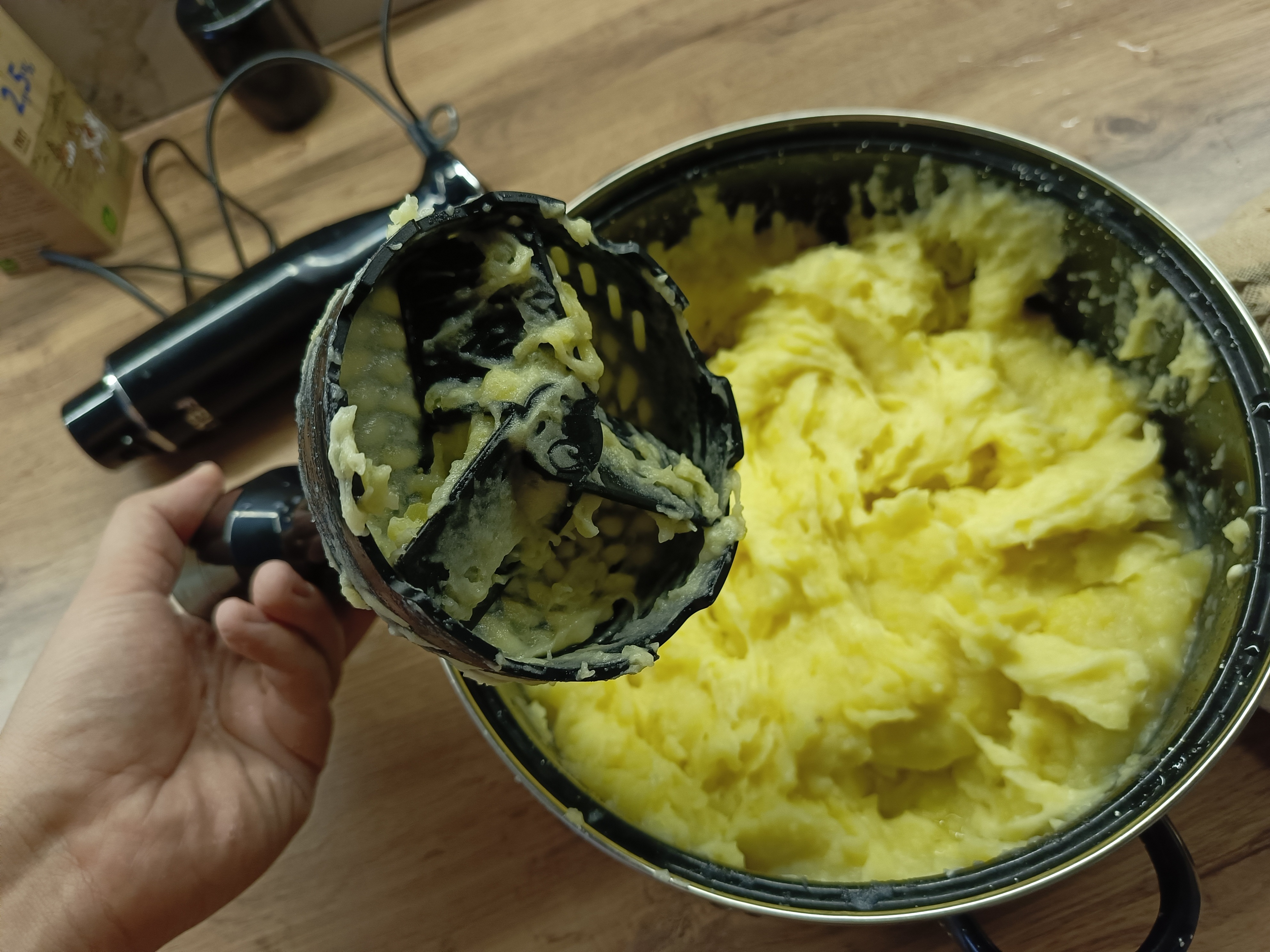 Напоследок попробую насадку пюре, которой я и приготовлю пюре. Отварить очищенный картофель, слить воду, добавить теплого молока, соль и сливочное масло и всё хорошо измельчить до однородной консистенции.