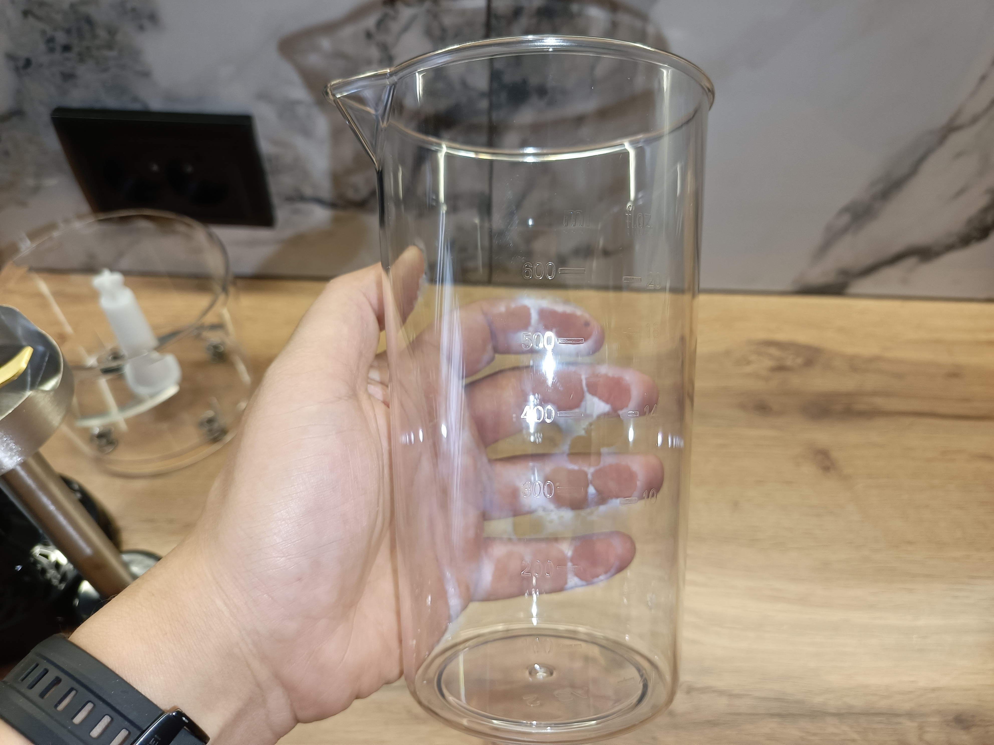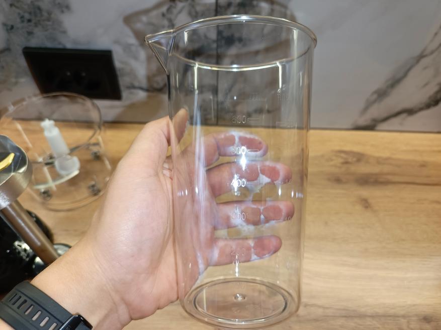 Мерный стаканчик пластиковый, прозрачный и имеет сливной носик. Мерная шкала есть, но, как всегда, она еле заметна.