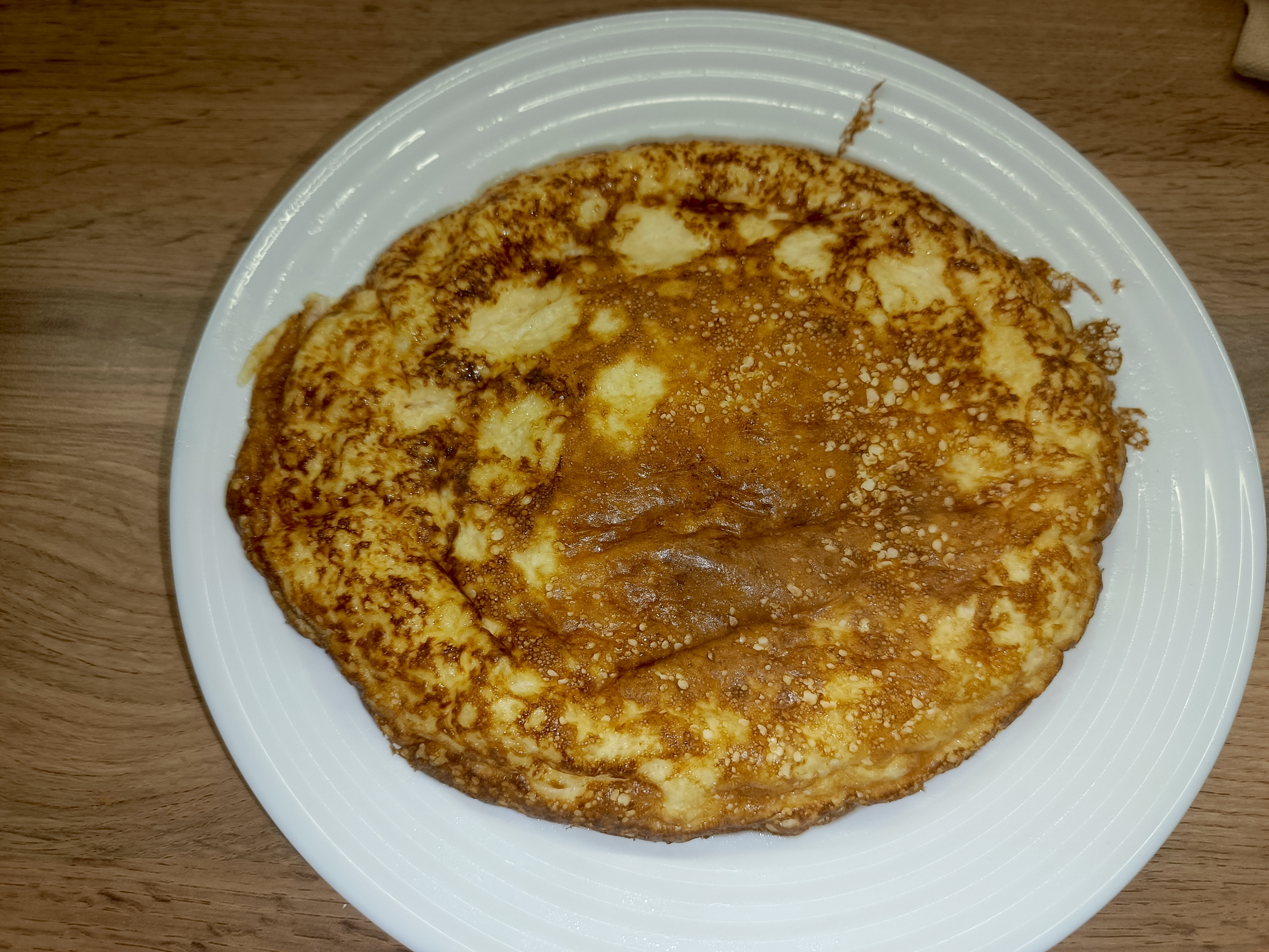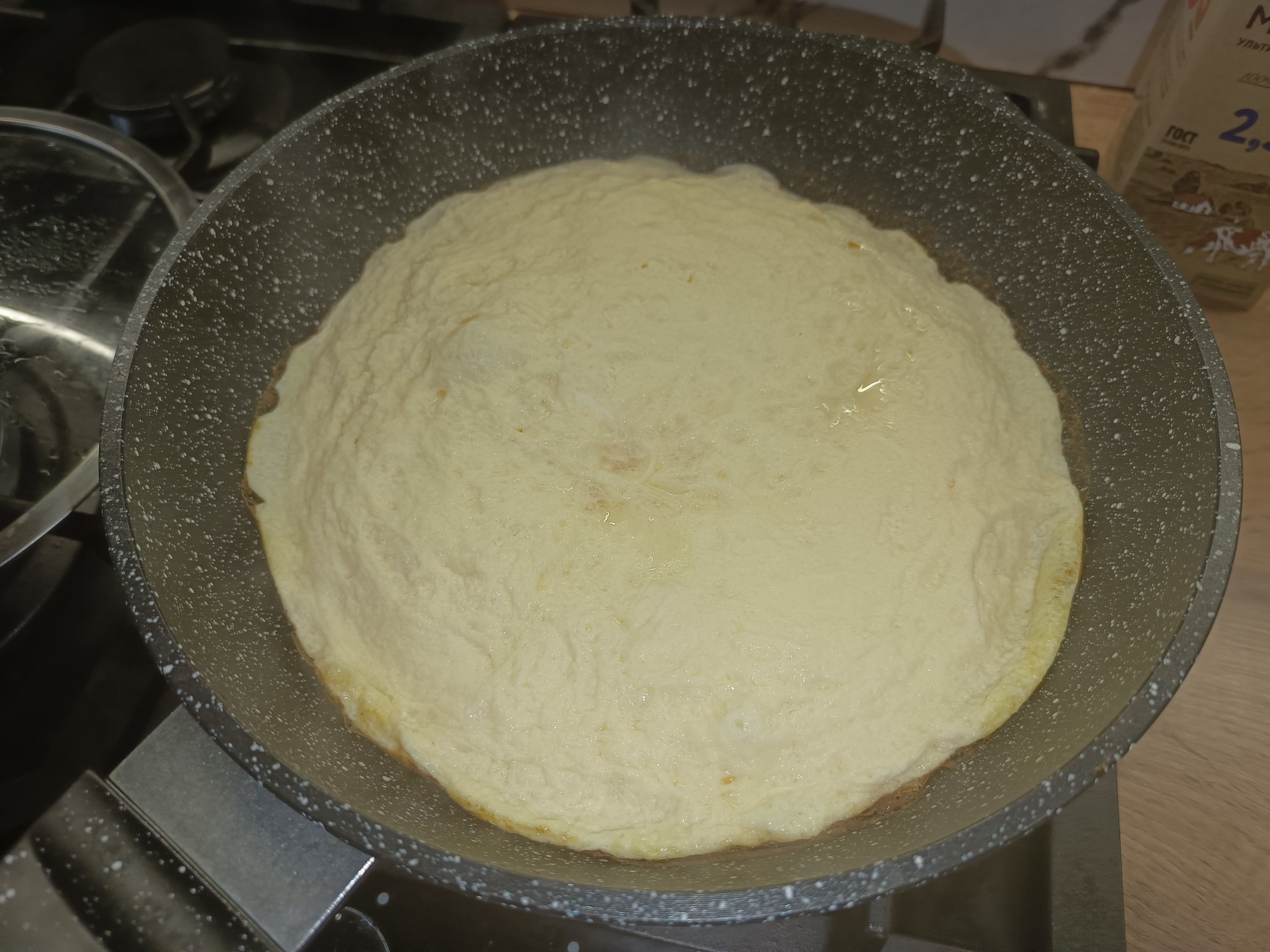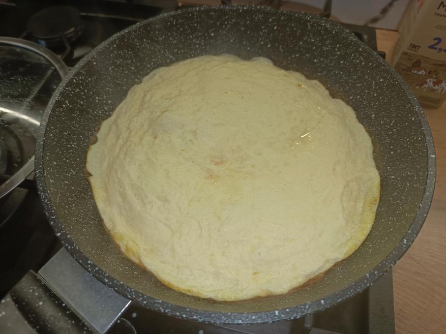 Для его приготовления нужно пять средних яиц, 200 мл молока и 1/2 ложки крахмала. Не забываем про соль, перец и другие специи по вкусу. Все ингредиенты смешиваем в течение пары минут миксером и выливаем в разогретую сковородку, накрываем крышкой и готовим до готовности на медленном огне.
