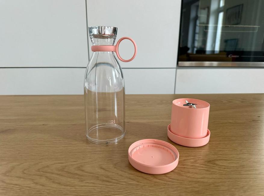 Felfri FHB-004 выполнен в классическом формате портативного блендера. Форма привычная, а за счет цвета и отделки устройство выглядит ярко и свежо. Корпус выполнен в нежно персиковом оттенке, с хромированными элементами. Такой вариант визуально ориентирован на подарочный сценарий, особенно если речь идет о девушке или ребенке. Внешне блендер смотрится аккуратно и цельно. Все элементы оформлены в едином стиле. Даже зарядная станция сделана из того же пластика, поэтому комплект воспринимается как одно целое, без ощущения разрозненных аксессуаров. Сборка визуально аккуратная, никаких зазоров при правильной сборке.