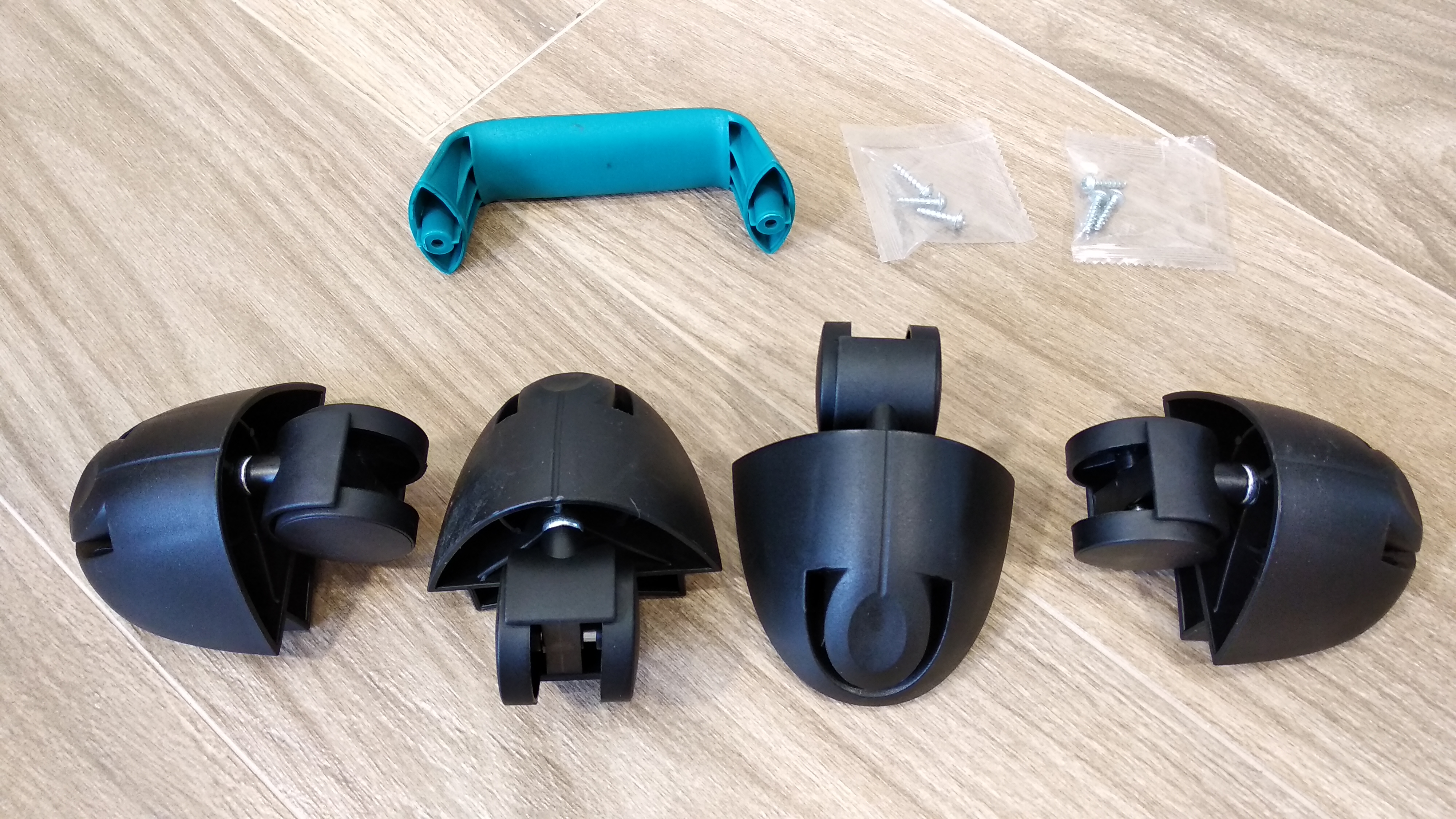 Ролики находятся на своих упорах, но к счастью они съемные и в случае поломки могут быть заменены. Ручка для переноски выполнена из пластика сине-зеленого цвета, как и нижняя часть корпуса. В двух пакетах всего 6 винтов — по одному на колеса и 2 на ручку.