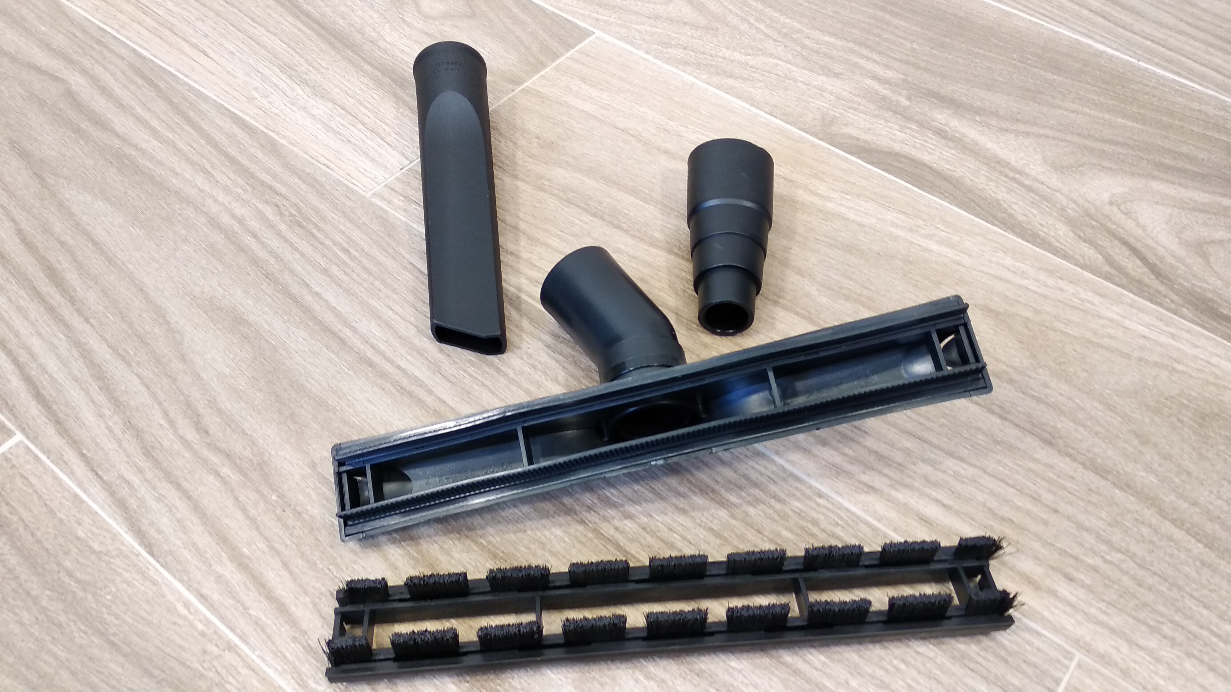 Насадки примерное такие же, как и у простого бытового пылесоса, но в то же время и не совсем так. Широкая насадка может быть с силиконовой «щетиной», либо с ворсовой. Она немного другого строения, нежели простая насадка для пола. Трубка состоит из трех составных частей, а значит, длину можно достаточно гибко настроить, не как с телескопической, но все же. Есть мягкая насадка (адаптер) круглого сечения со ступенчатым сужением. Могу предположить, что мягкость и ступени сделаны для гибкой возможности установки в рабочее место, например в станке или верстаке.