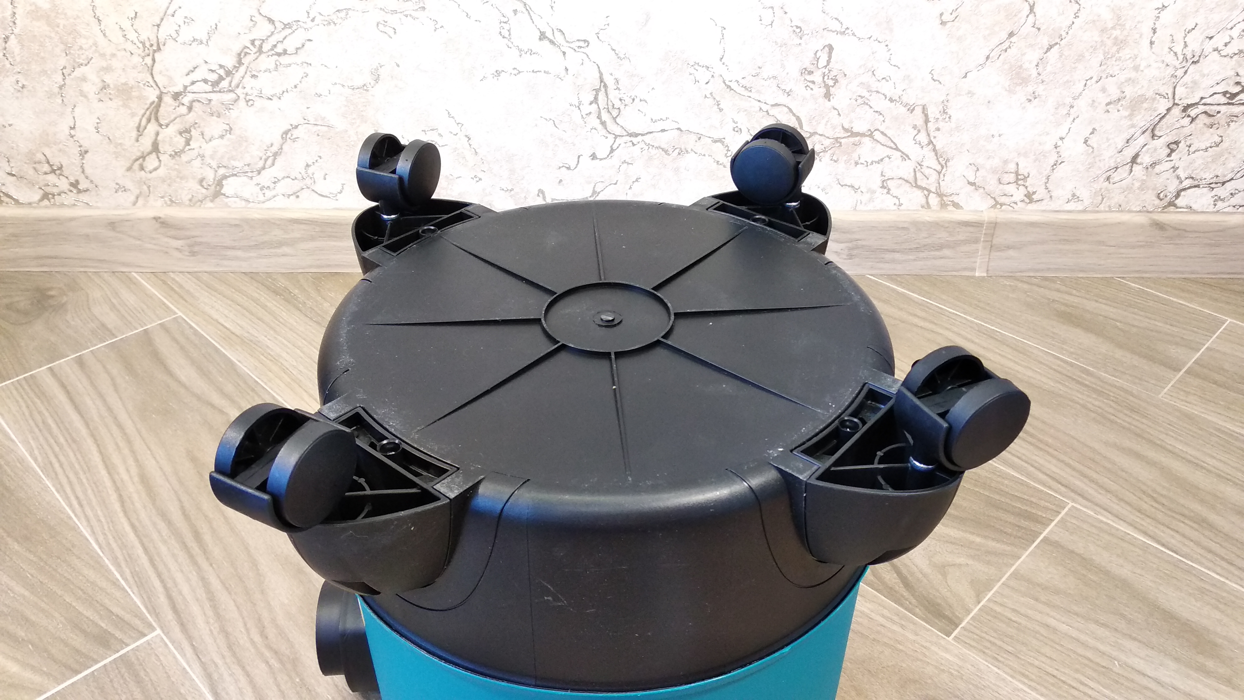 Первым делом, перед эксплуатацией пылесоса, его нужно собрать. Сделаем это и подготовим для сухой уборки. Установим колеса и ручку, чтобы можно было без труда перемещать пылесос.