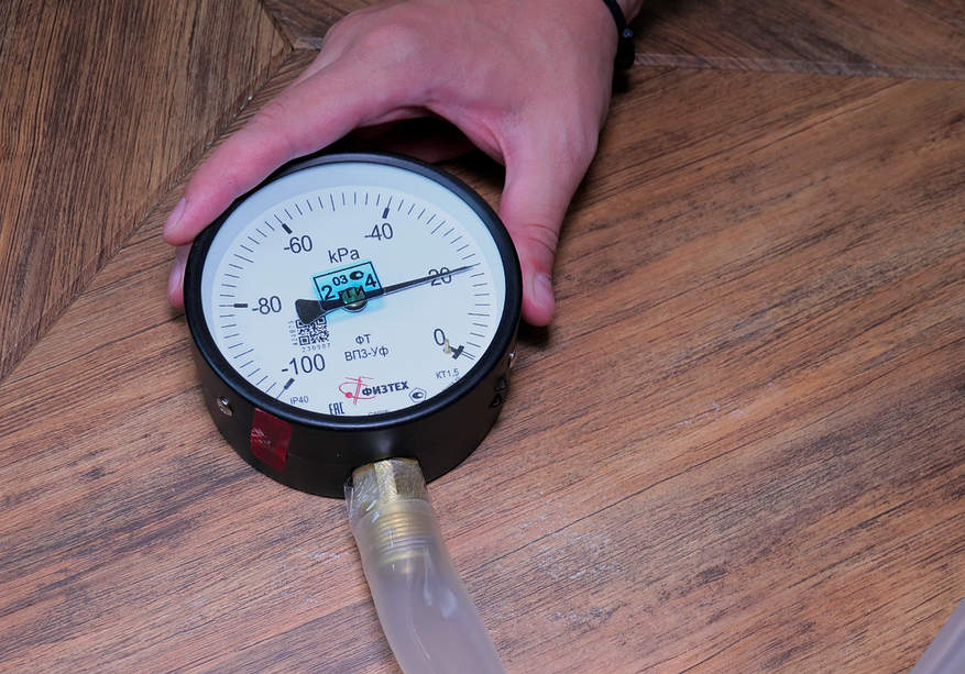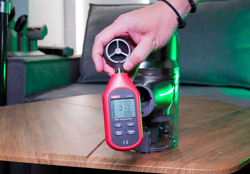 При этом уровень мощности, конечно, несопоставимый. Анемометр фиксирует пиковое значение в 38 м/с. Для сравнения, у аналогов этот показатель обычно держится около 30 м/с. Электронный манометр не успевает «разогнаться» до срабатывания защиты от перегрева, а вот механический смог сориентироваться быстро — в максимальном режиме стрелка показала 29 кПа. Это больше, чем заявлено производителем (27 кПа).
