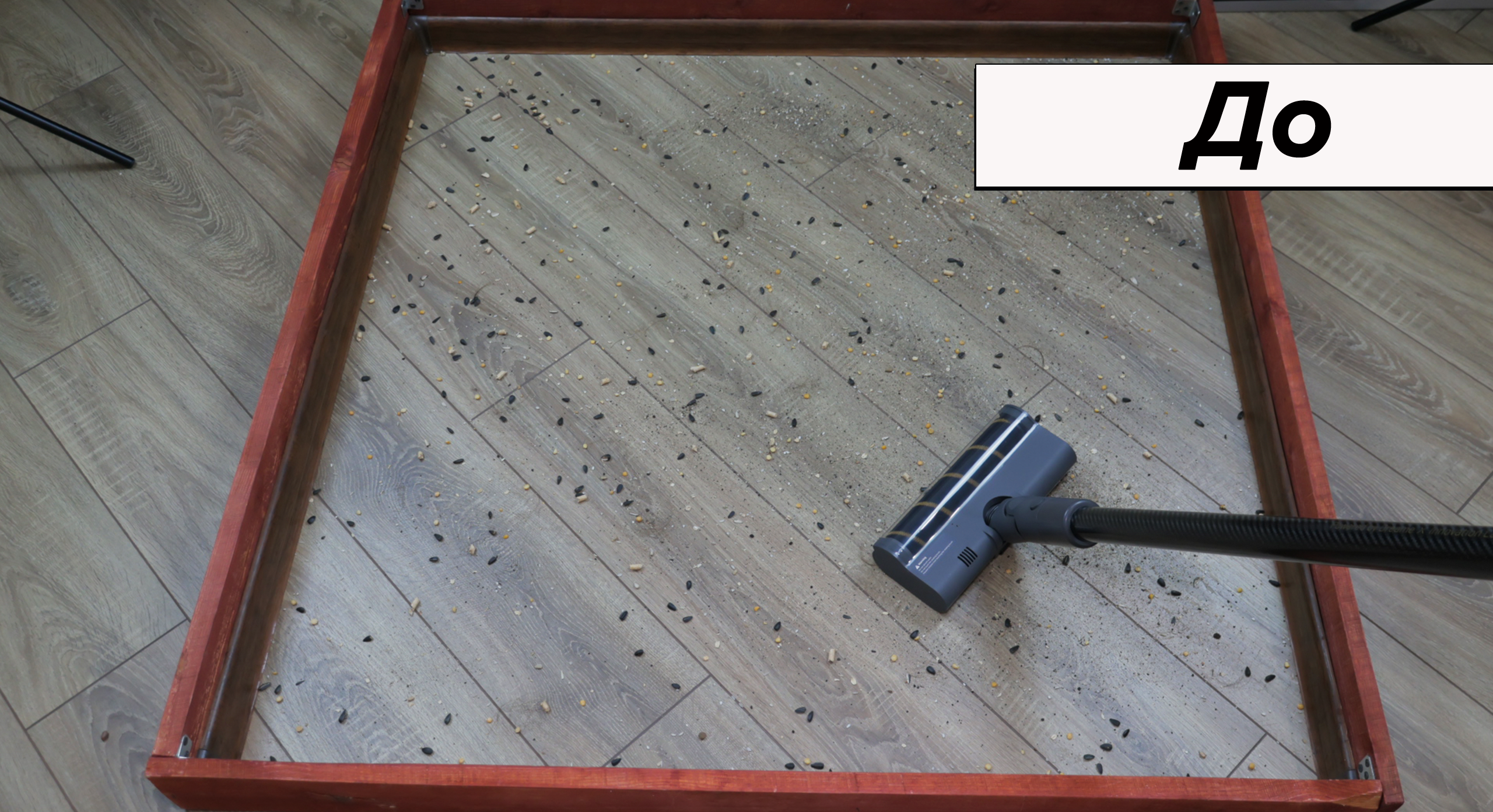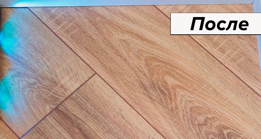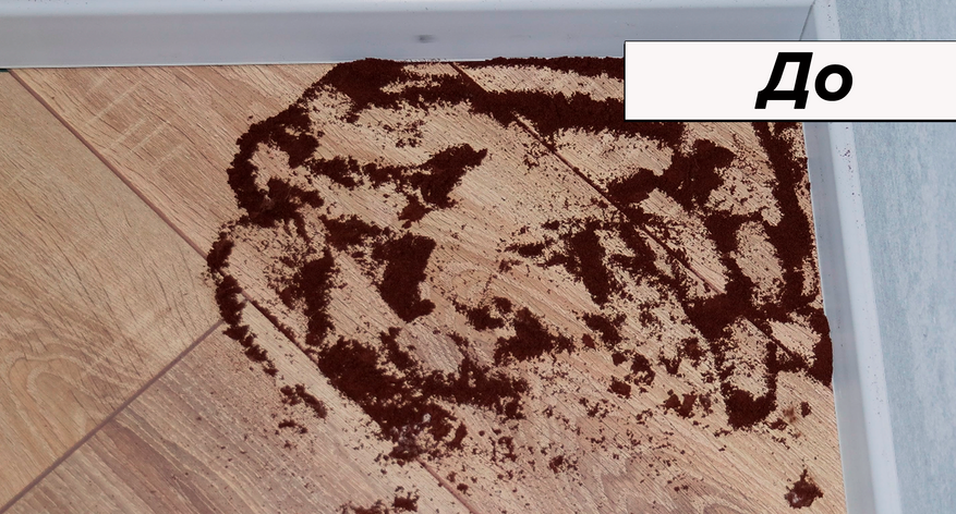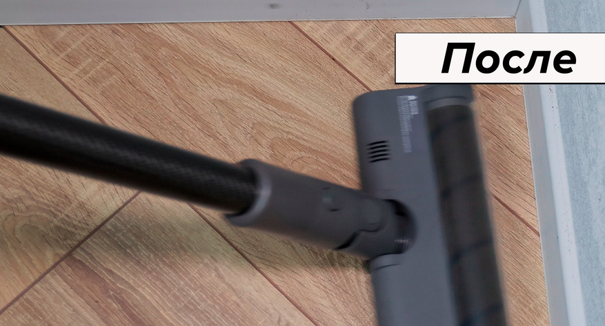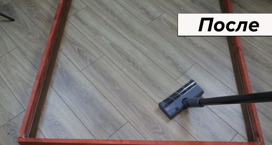 Ламинат в автоматическом режиме с паркетным валиком убирает за 2 прохода. Справился бы и за один проход, но крупные соринки отлетают от вращающегося инструмента — приходится подбирать их повторным движением.
