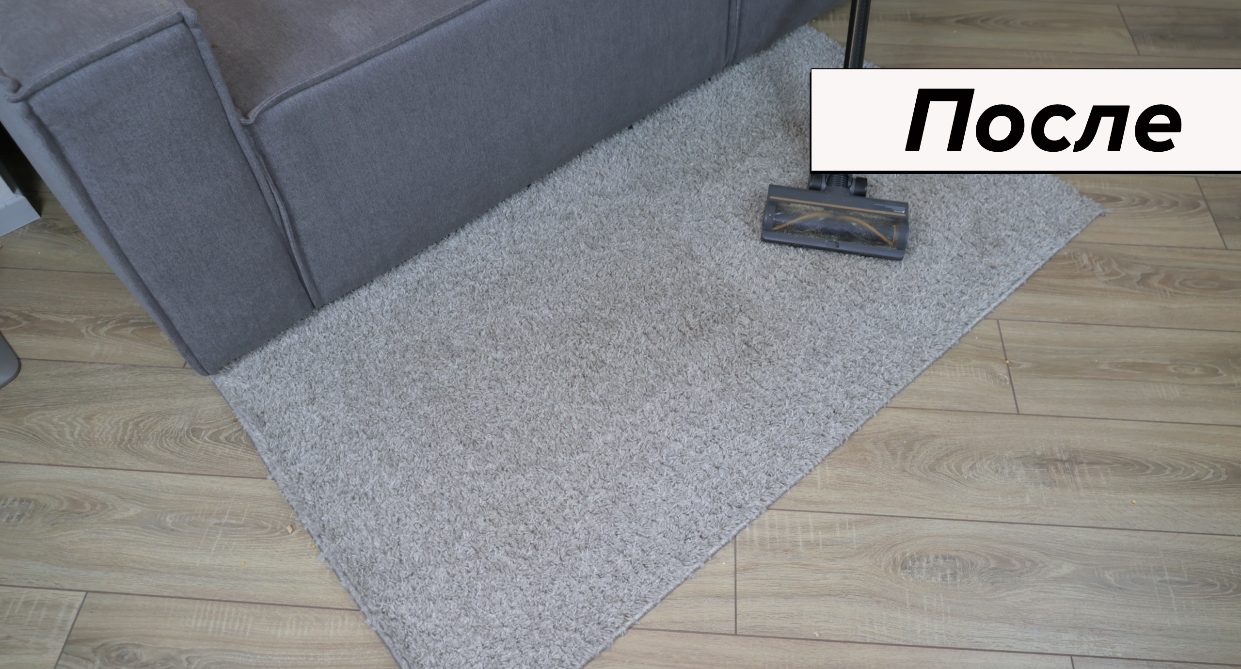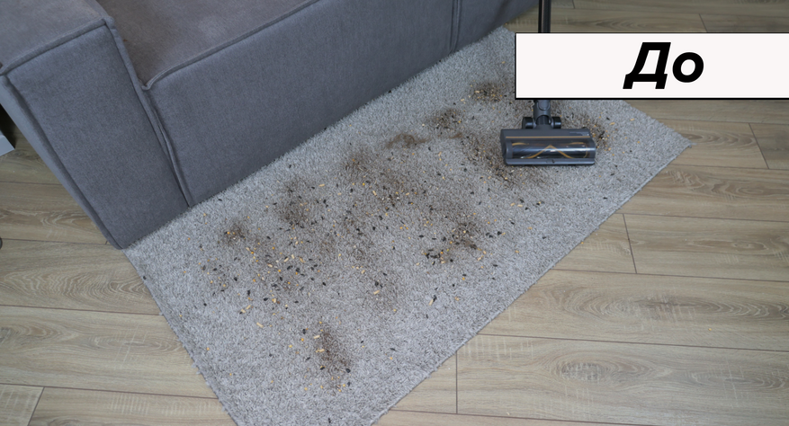 Мохнатый ковёр вычищает тяжелой насадкой на глубину. За несколько движений в длинном ворсе не остаётся ни крошки.