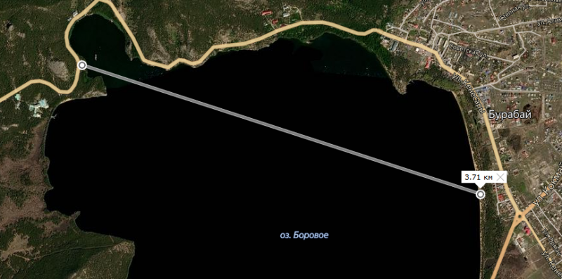 Ну а самое большое расстояние которое в целом было достигнуто, это расстояние между лодочной станцией возле скалы Жумбактас и пляжем в посёлке Бурабай: