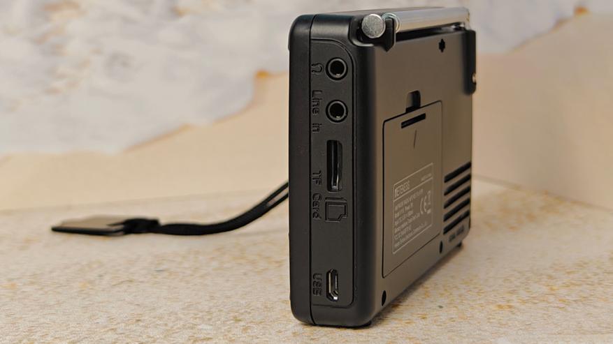 На боковом торце приемника сверху вниз разместили: разъем для подключения наушников, 3.5 мм вход AUX для подключения сторонних приборов. Можно послушать музыку с телефона или использовать приемник как портативную колонку к ПК. Ниже расположен слот для карты памяти, позволяющий использовать microSD-карты объемом до 32 ГБ и заключительный Micro USB порт для кабеля зарядки.