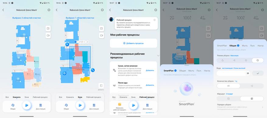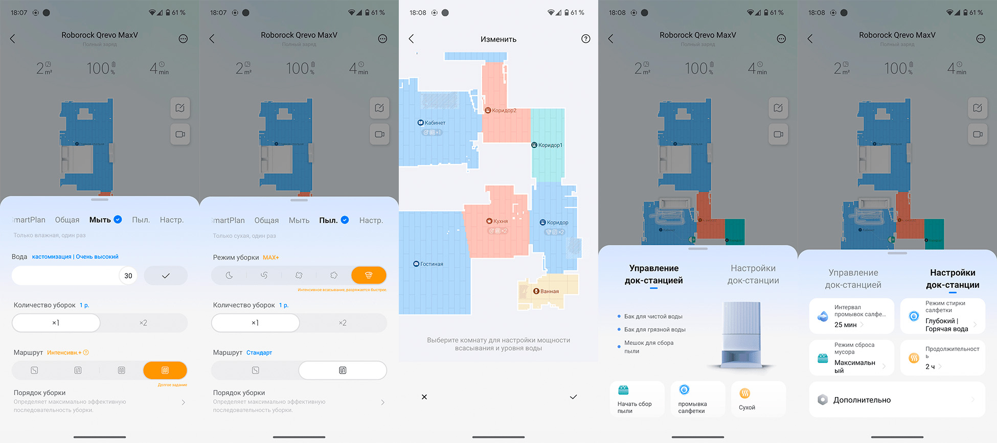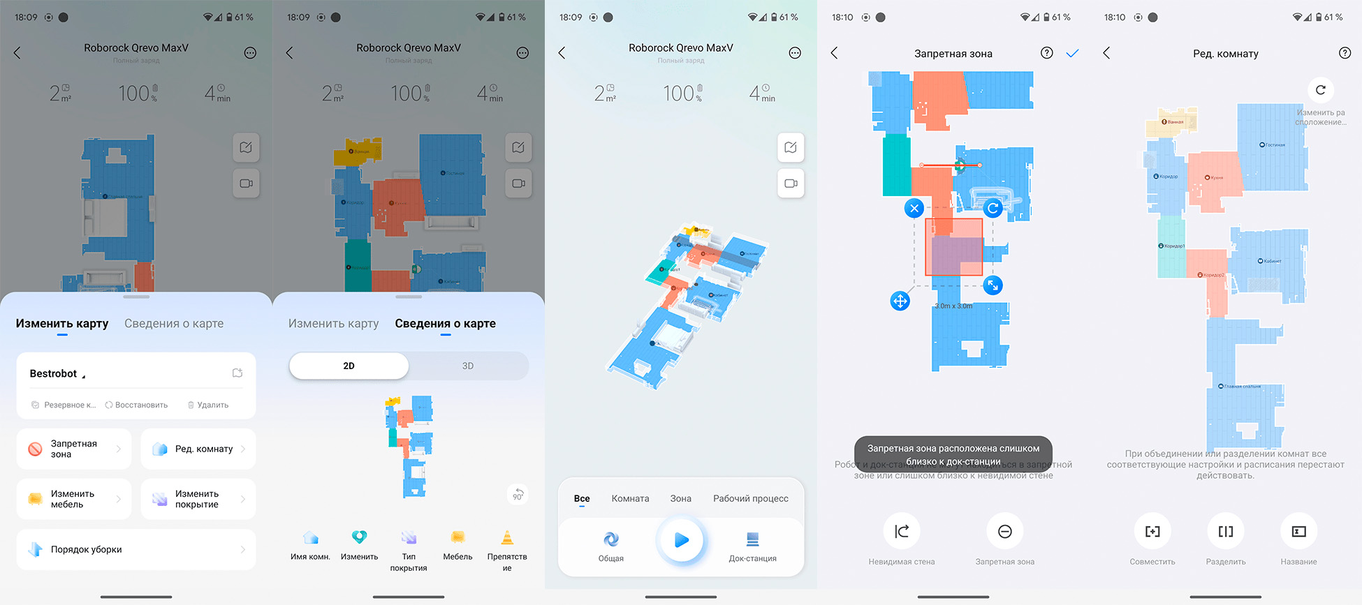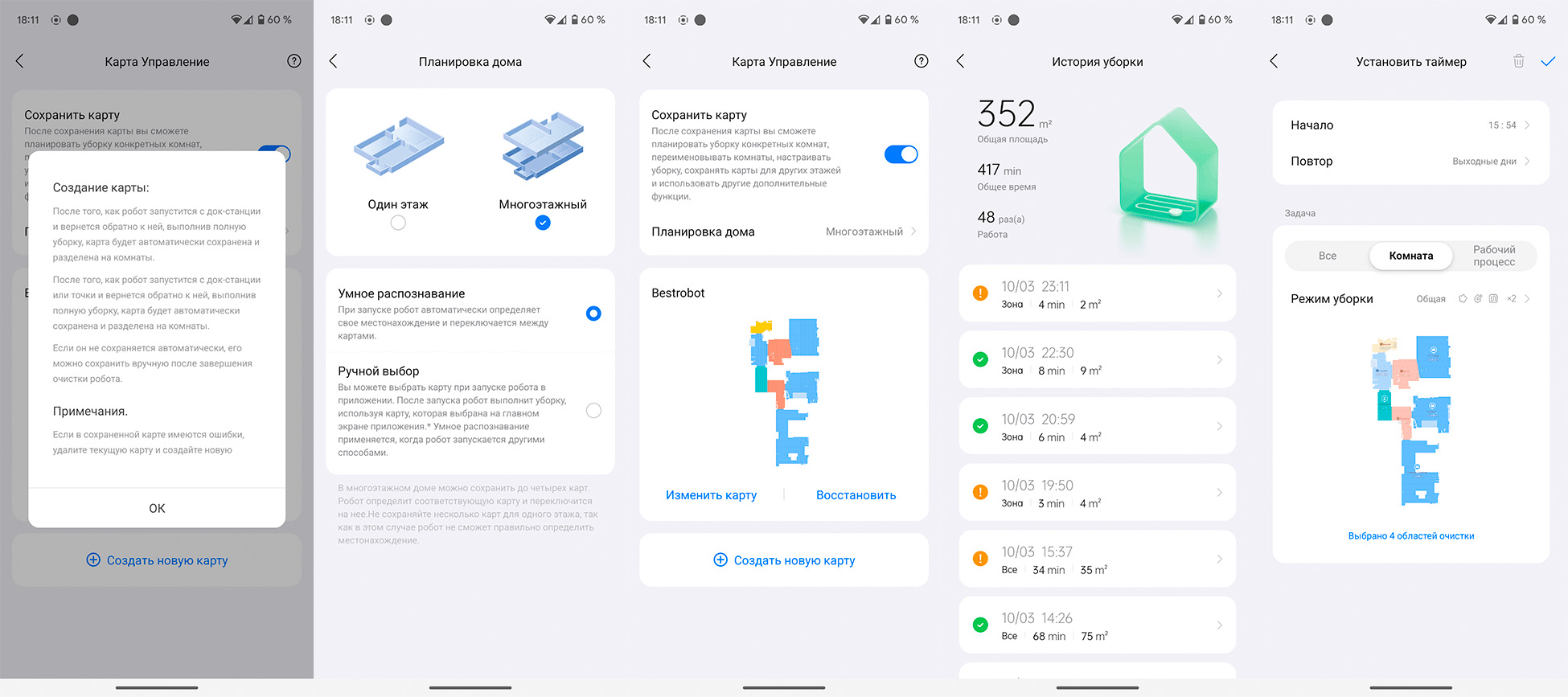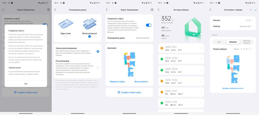 - многоуровневое помещение с сохранением до 4 карт (важно учитывать, что на картах без станции робот сможет делать только сухую уборку!);