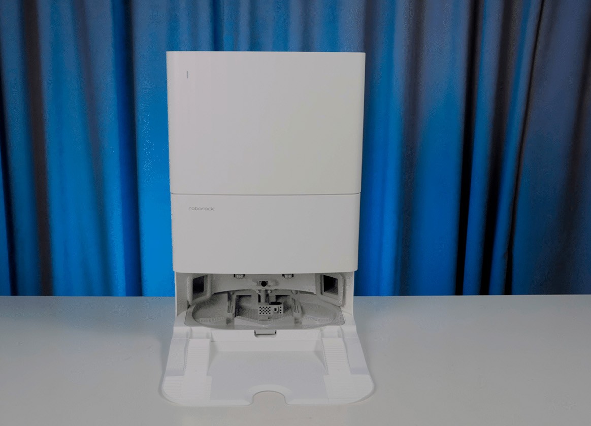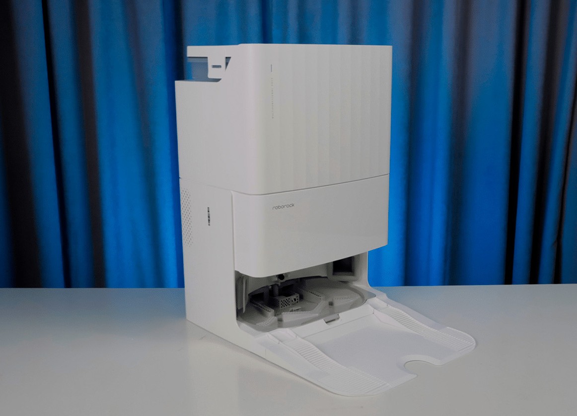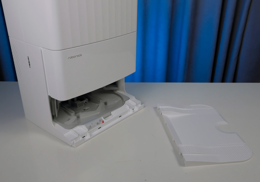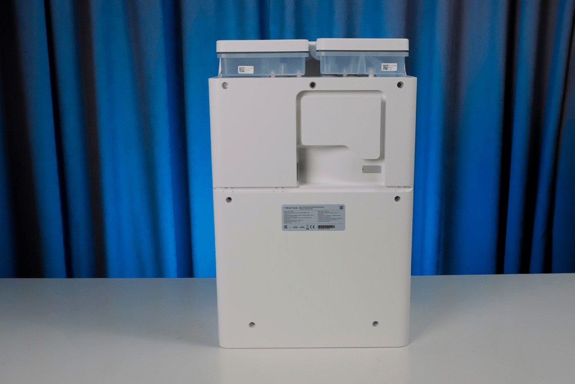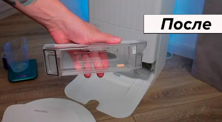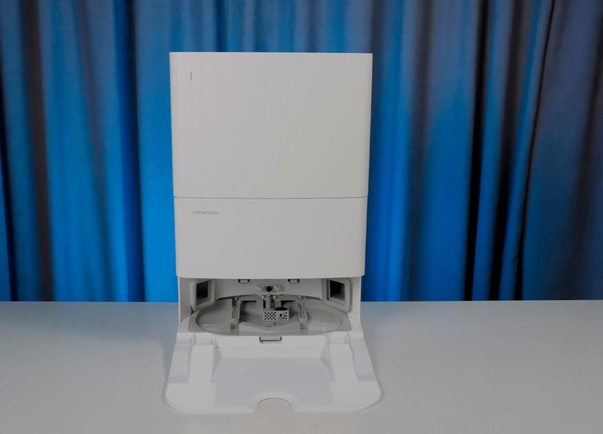 Станция полноразмерная, с резервуарами на 3,5-4 литра. Принцип работы следующий: робот сдаёт задом и заезжает салфетками в док. Полощет их в теплой воде, сливает отработанную жидкость в отдельный бак, заполняет встроенный бачок с помощью штуцера, выгружает мусор, а в конце уборки сушит салфетки теплым воздухом.