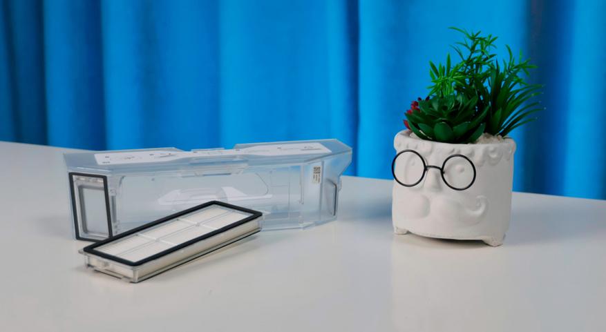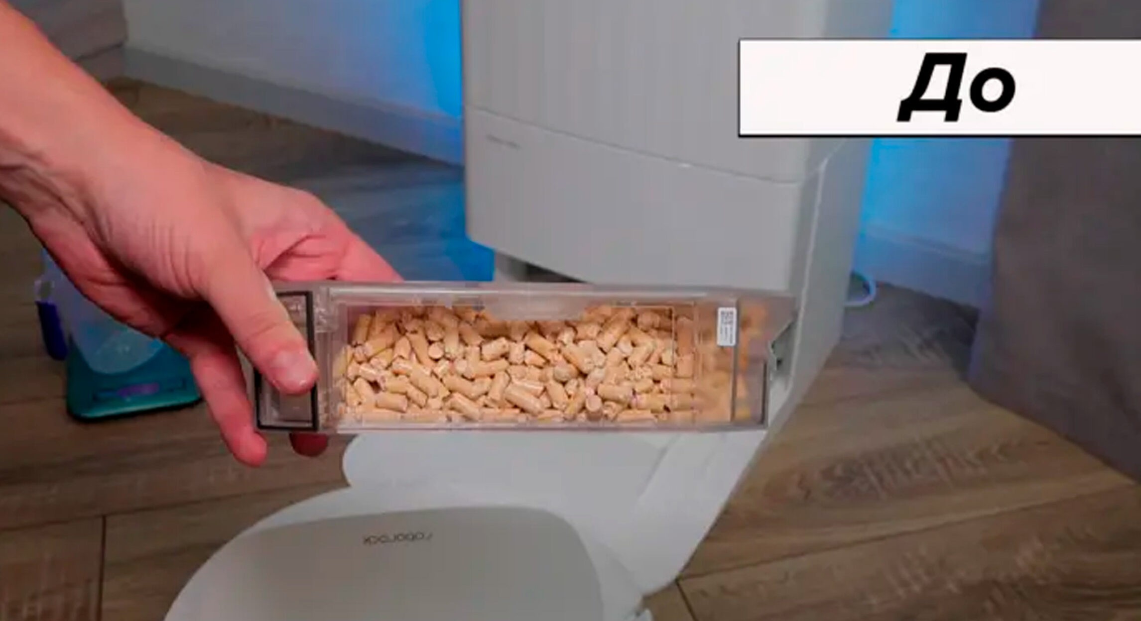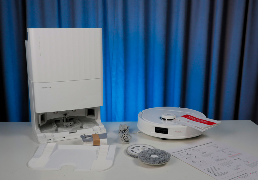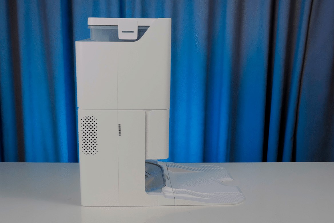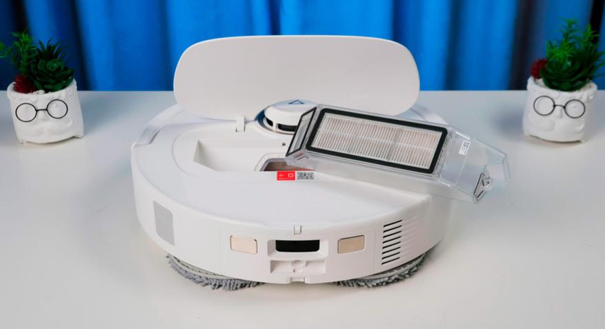 Станция полноразмерная, с резервуарами на 3,5-4 литра. Принцип работы следующий: робот сдаёт задом и заезжает салфетками в док. Полощет их в теплой воде, сливает отработанную жидкость в отдельный бак, заполняет встроенный бачок с помощью штуцера, выгружает мусор, а в конце уборки сушит салфетки теплым воздухом.