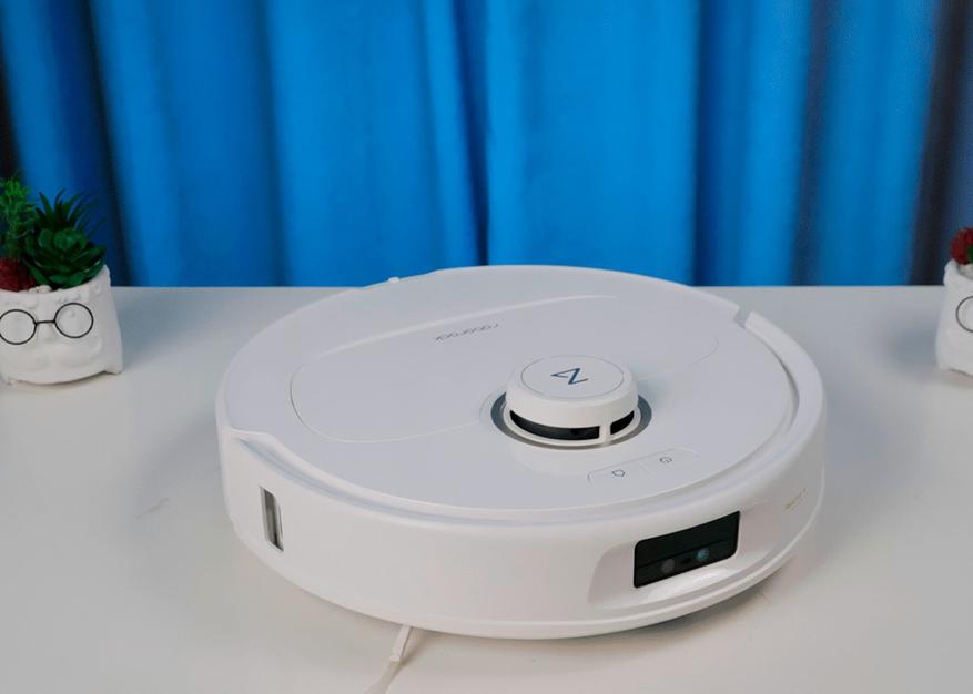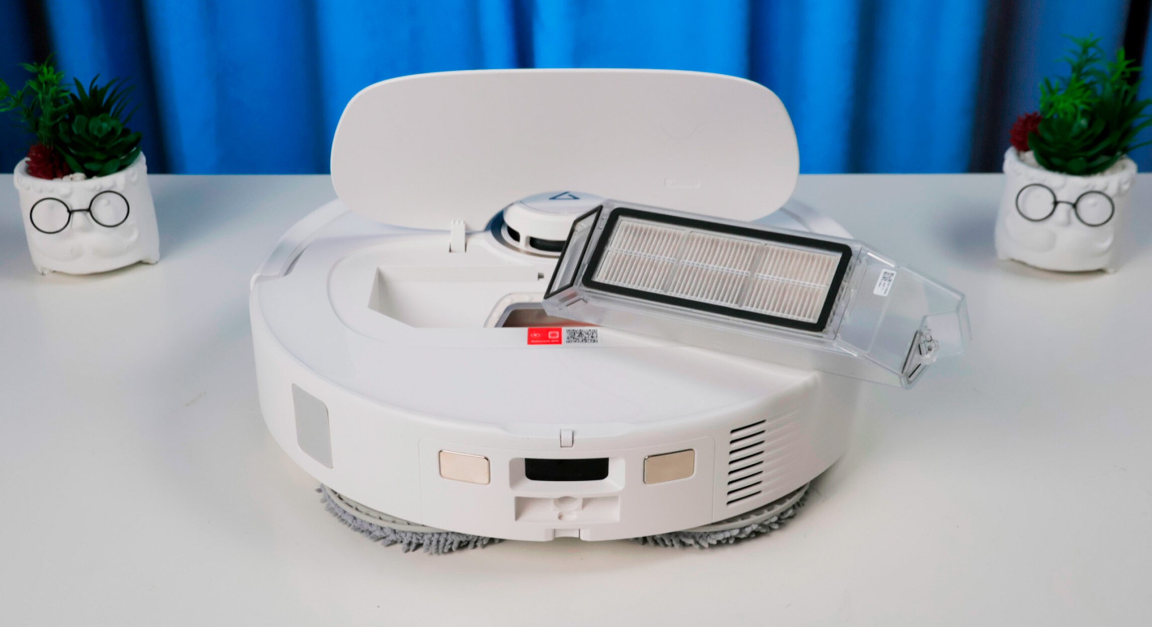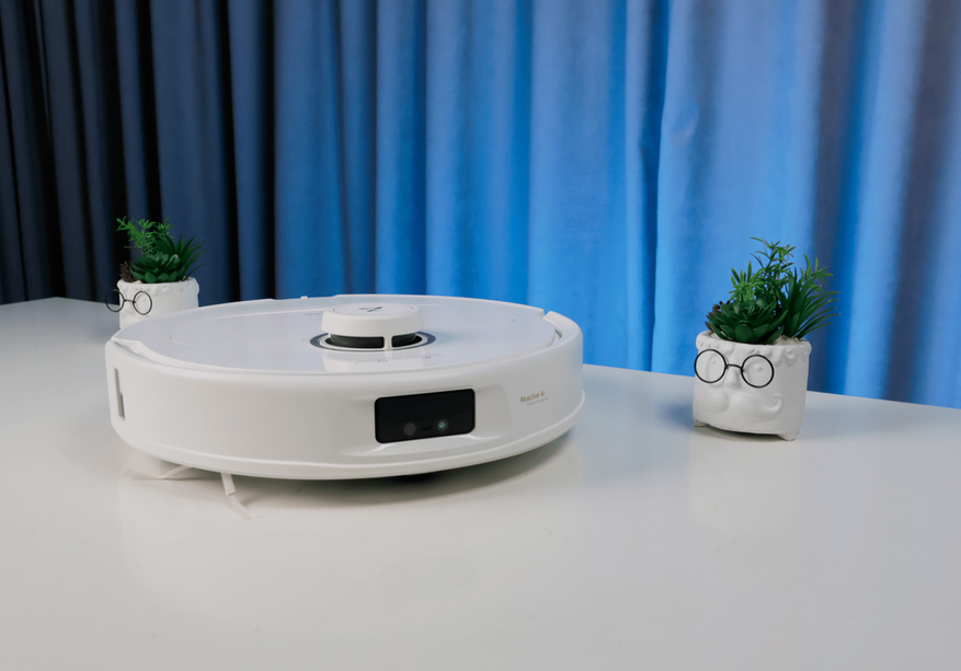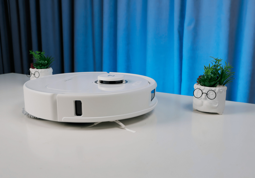 Визуально робот такой же, как остальные модели серии Q Revo: кругляш с матовым корпусом, наверху лидар и пара кнопок, контейнер под лицевой панелью. Ключевая особенность — высота корпуса. У MaxV она составляет 102 мм, и это может быть принципиально важным фактором, если у вас стандартная мебель.