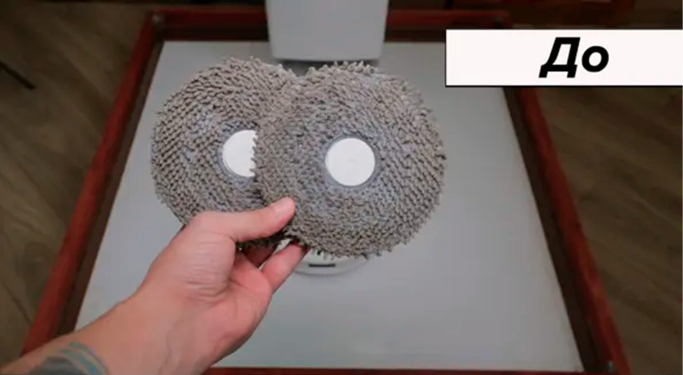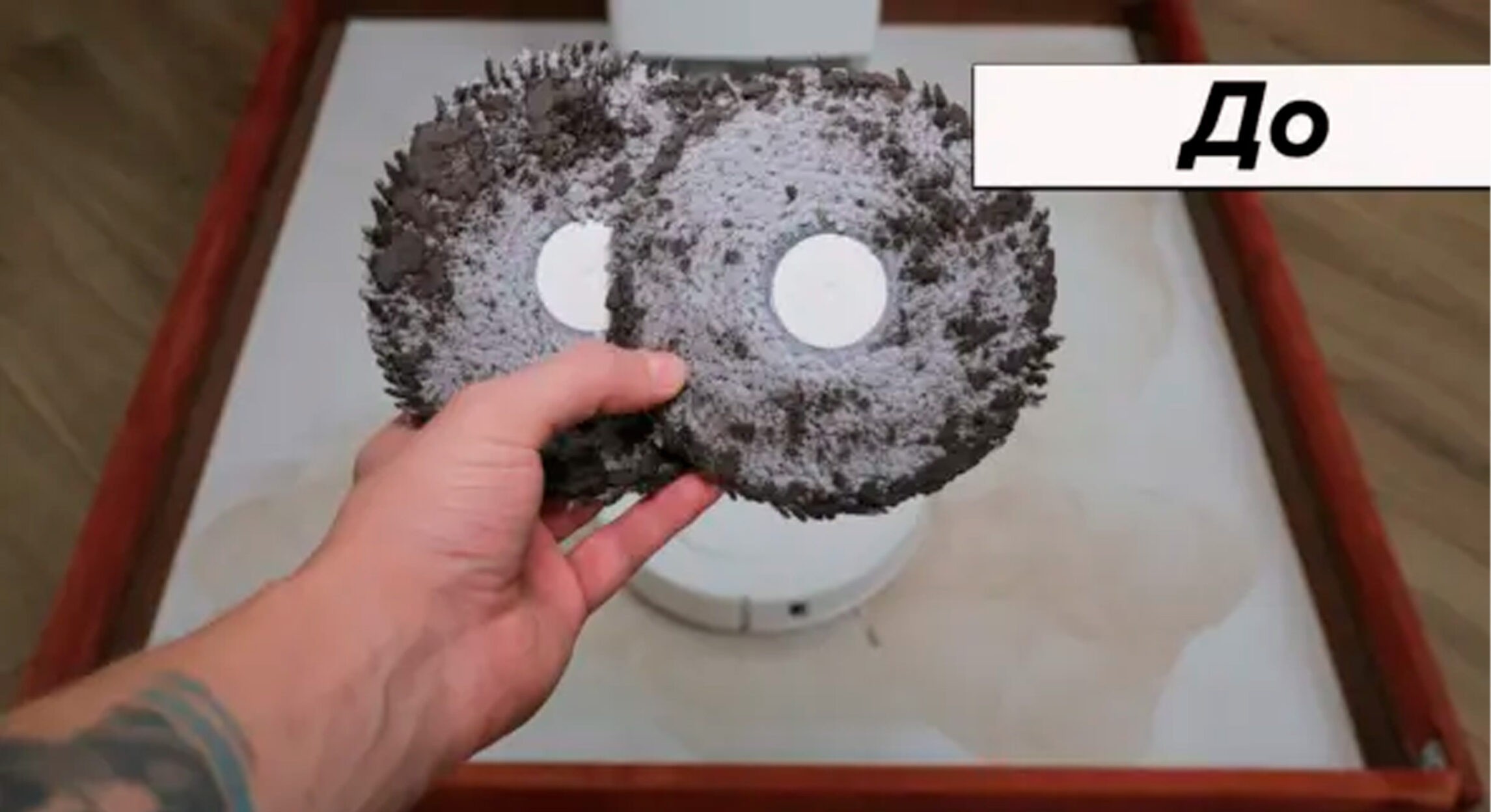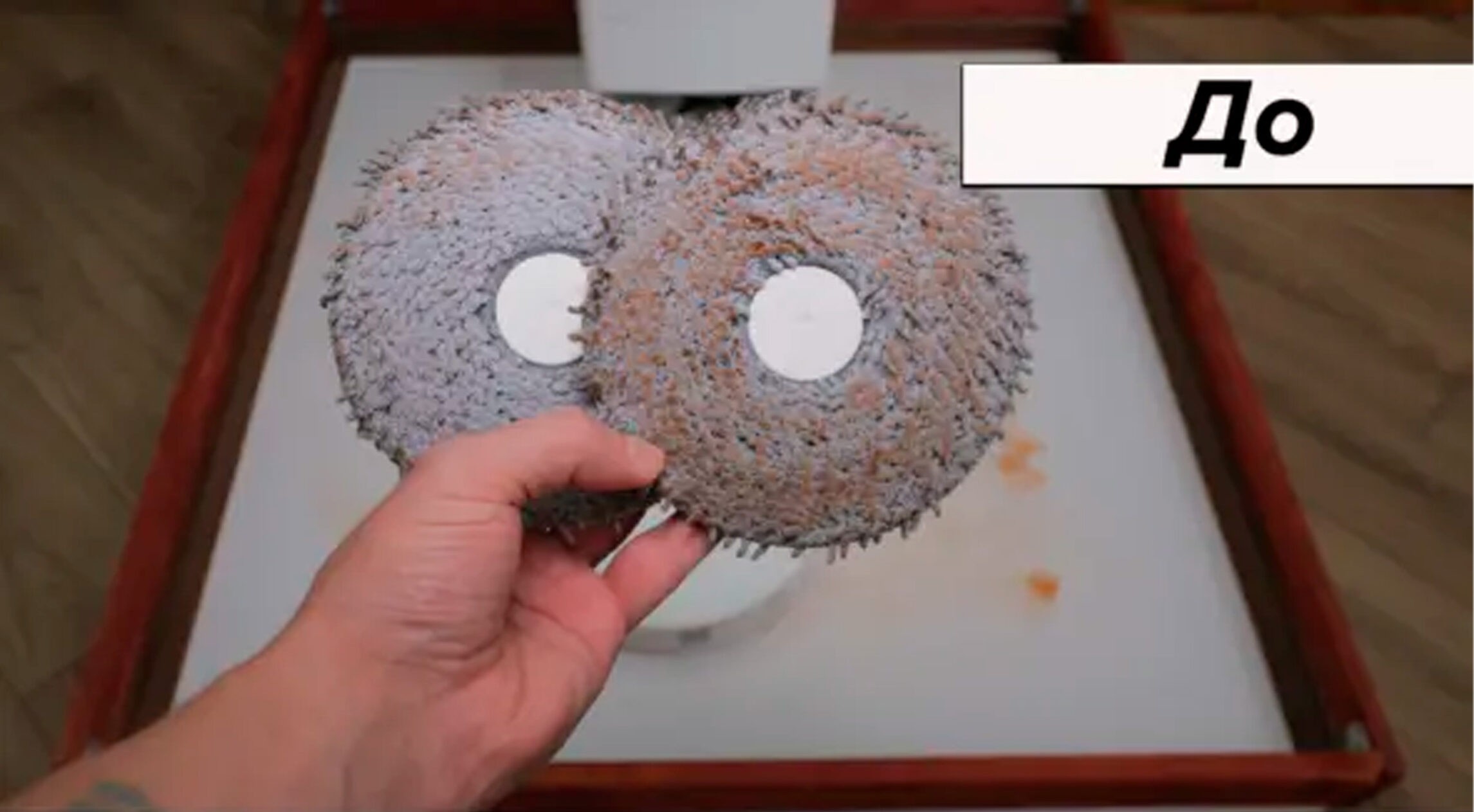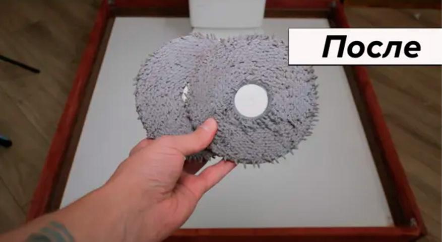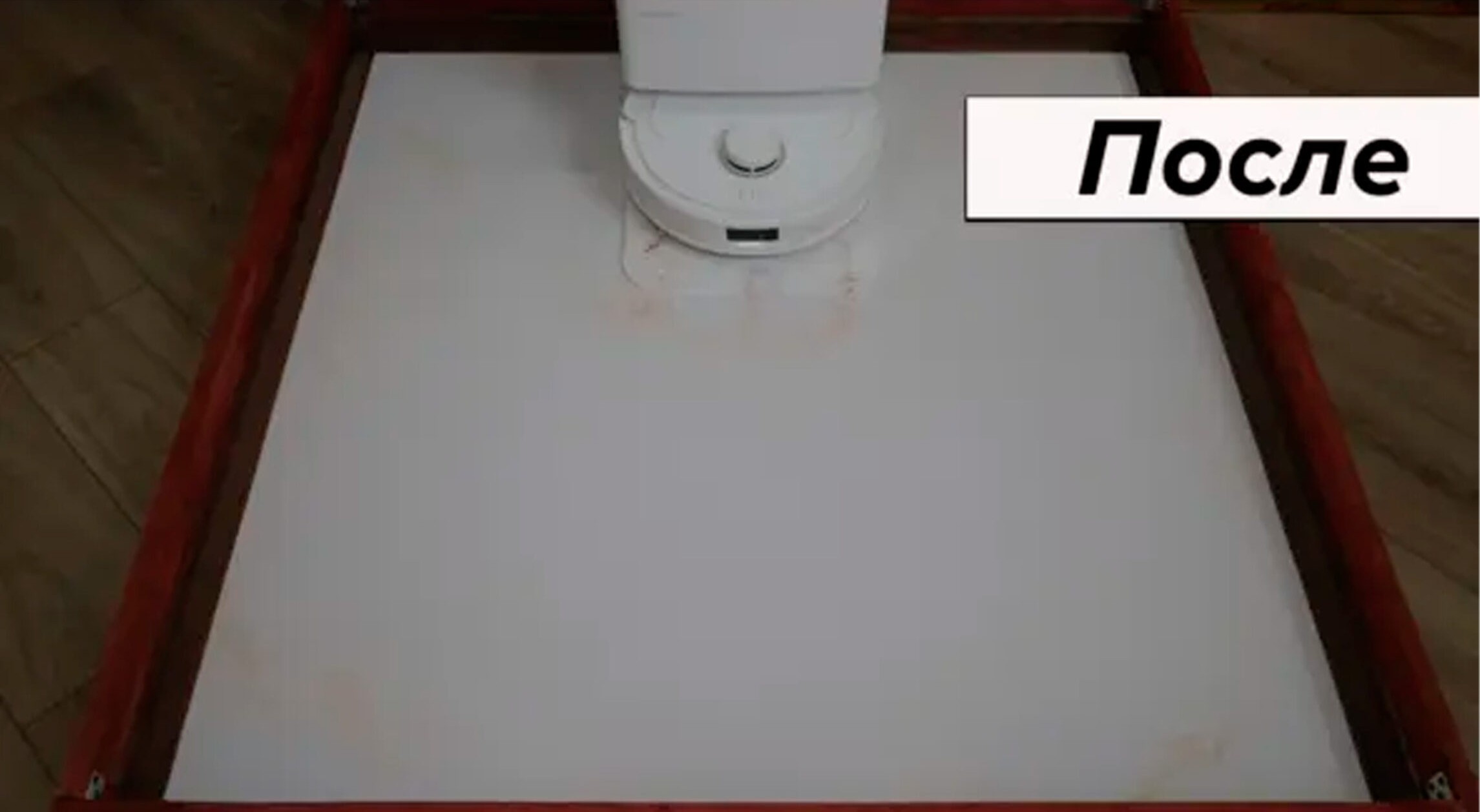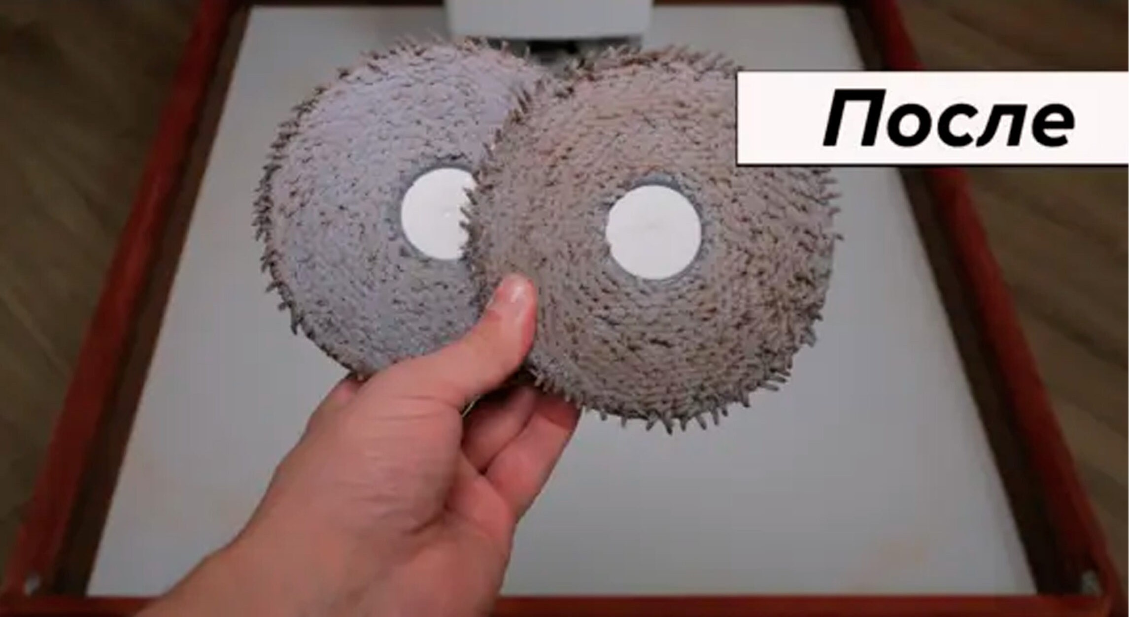 Эффективность влажной уборки у Q Revo MaxV высокая — крупноворсовые мопики плотно прижимаются к полу, обрабатывают пристенные участки. Но по сравнению с Pro-версией интенсивность подачи воды снизилась, что повлияло на скорость отмывания пятен и результаты у стен, где на отдельных участках могут оставаться пятна в пределах 1,5 см. С экстремальными загрязнениями Roborock Q Revo MaxV будет возиться долго, но пыль и водные пятна устранит за 2-3 прохода.