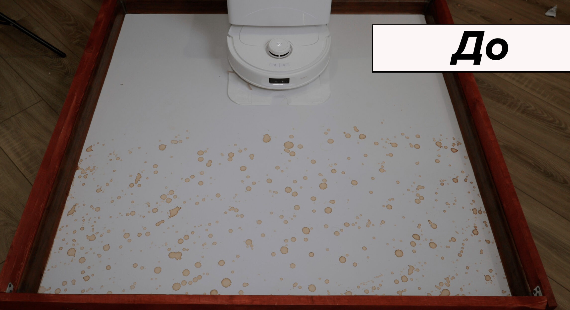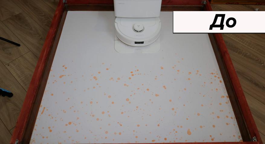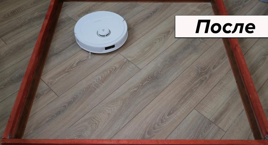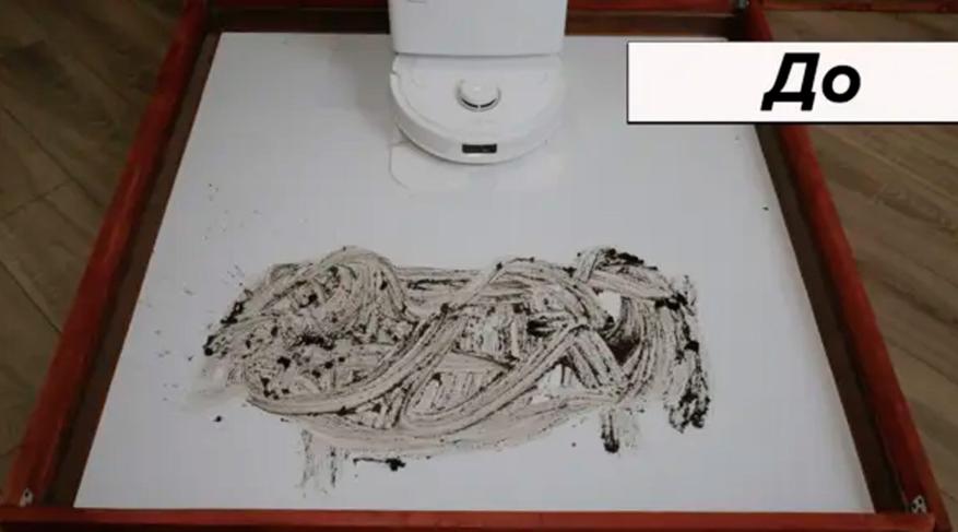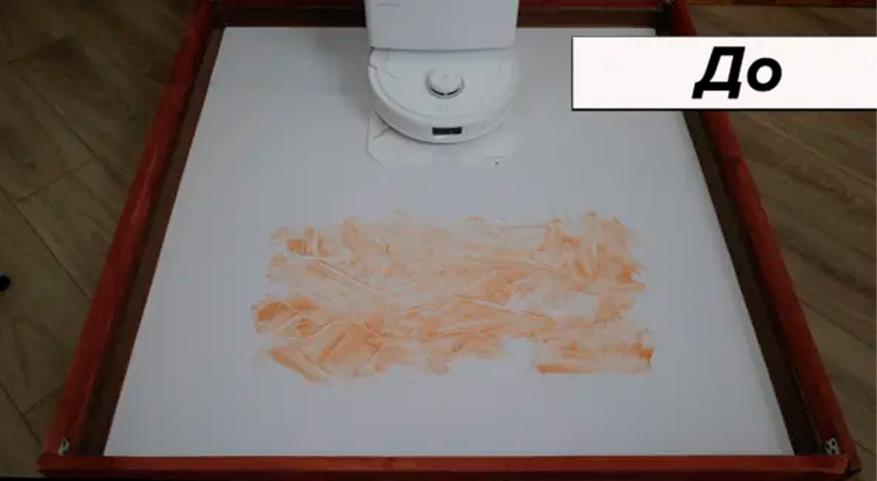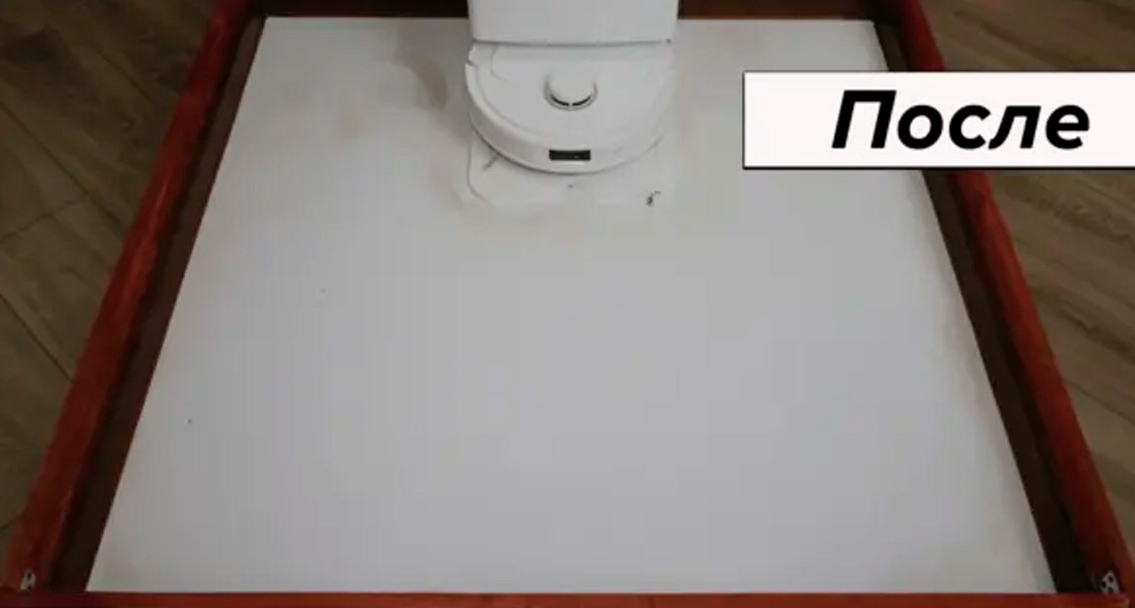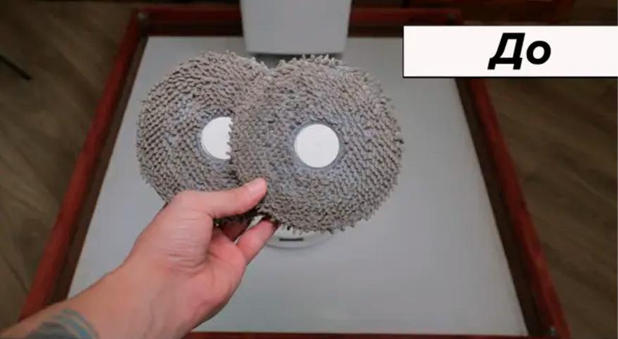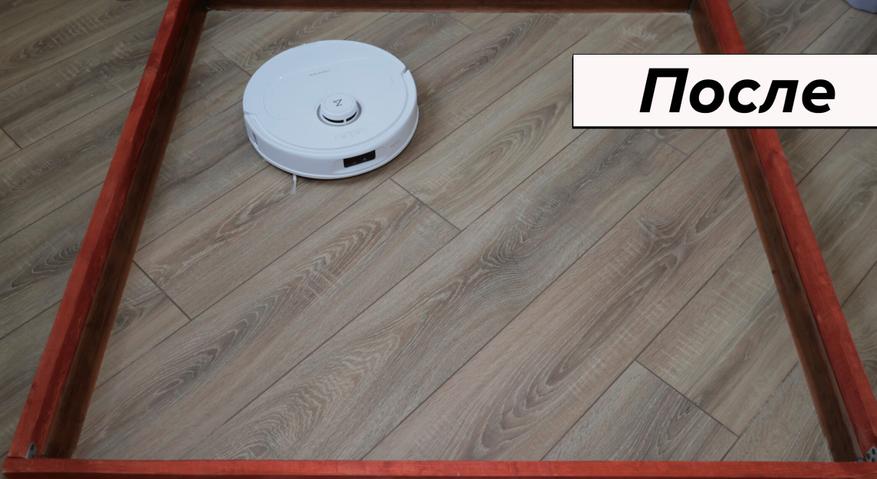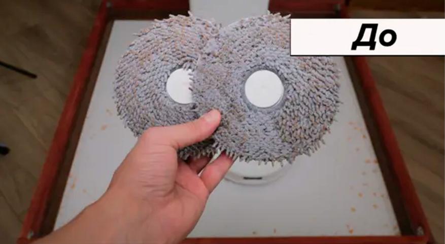 Эффективность влажной уборки у Q Revo MaxV высокая — крупноворсовые мопики плотно прижимаются к полу, обрабатывают пристенные участки. Но по сравнению с Pro-версией интенсивность подачи воды снизилась, что повлияло на скорость отмывания пятен и результаты у стен, где на отдельных участках могут оставаться пятна в пределах 1,5 см. С экстремальными загрязнениями Roborock Q Revo MaxV будет возиться долго, но пыль и водные пятна устранит за 2-3 прохода.