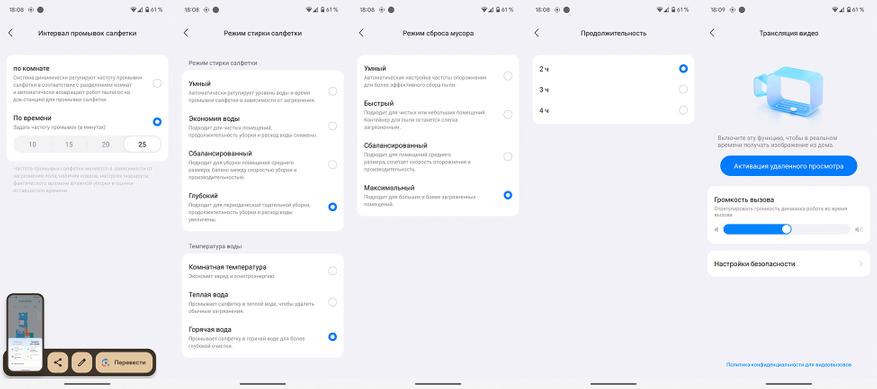 - настройка полоскания салфеток (10-25 мин / по комнатам);