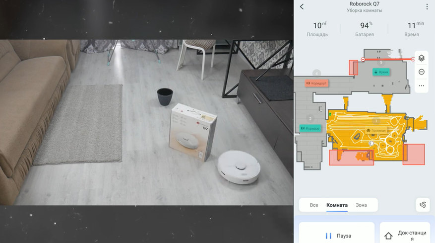 На максимальной мощности Roborock Q7 отработал 100 минут и за это время убрал 106 кв.м. При необходимости возобновляет уборку с места прерывания.
