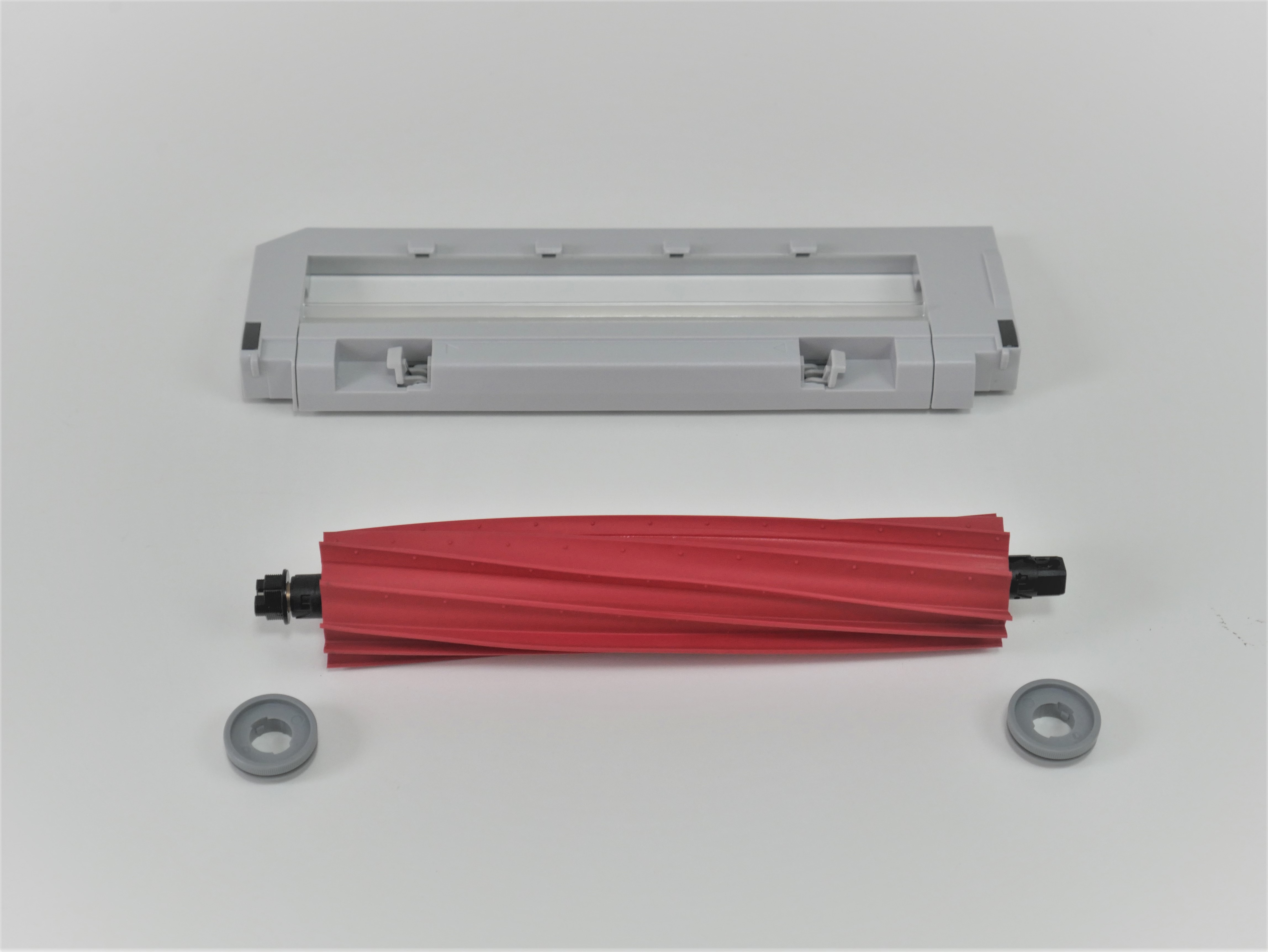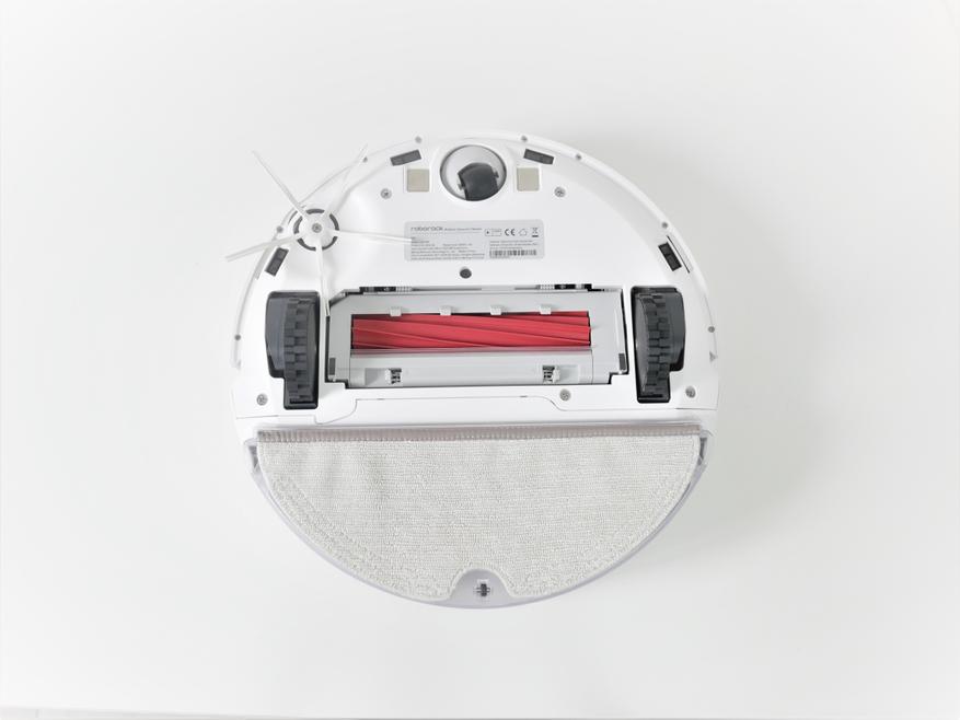 Снизу робот выглядит в точности, как Roborock S7. Помимо стандартных элементов, таких как датчики падения, колеса и клеммы, под днищем установлена 5-лучевая резиновая щётка и ребристый силиконовый валик.