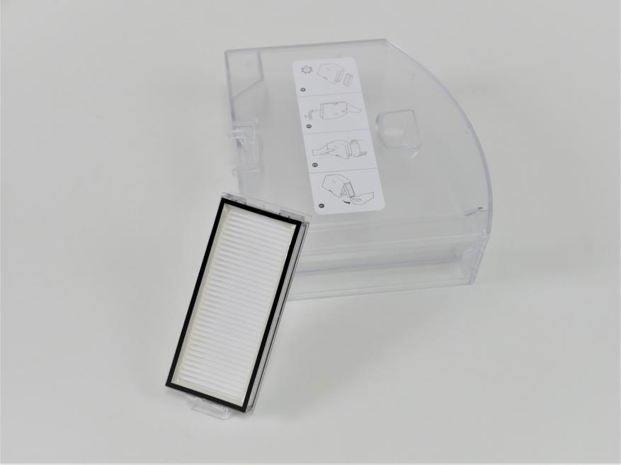 Под крышкой размещается пылесборник нового типа: он огромный (750 мл) и смещен вправо, чтобы встать рядом с моторным отсеком (для повышения эффективности всасывания). Фильтрация одинарная — через НЕРА-фильтр.