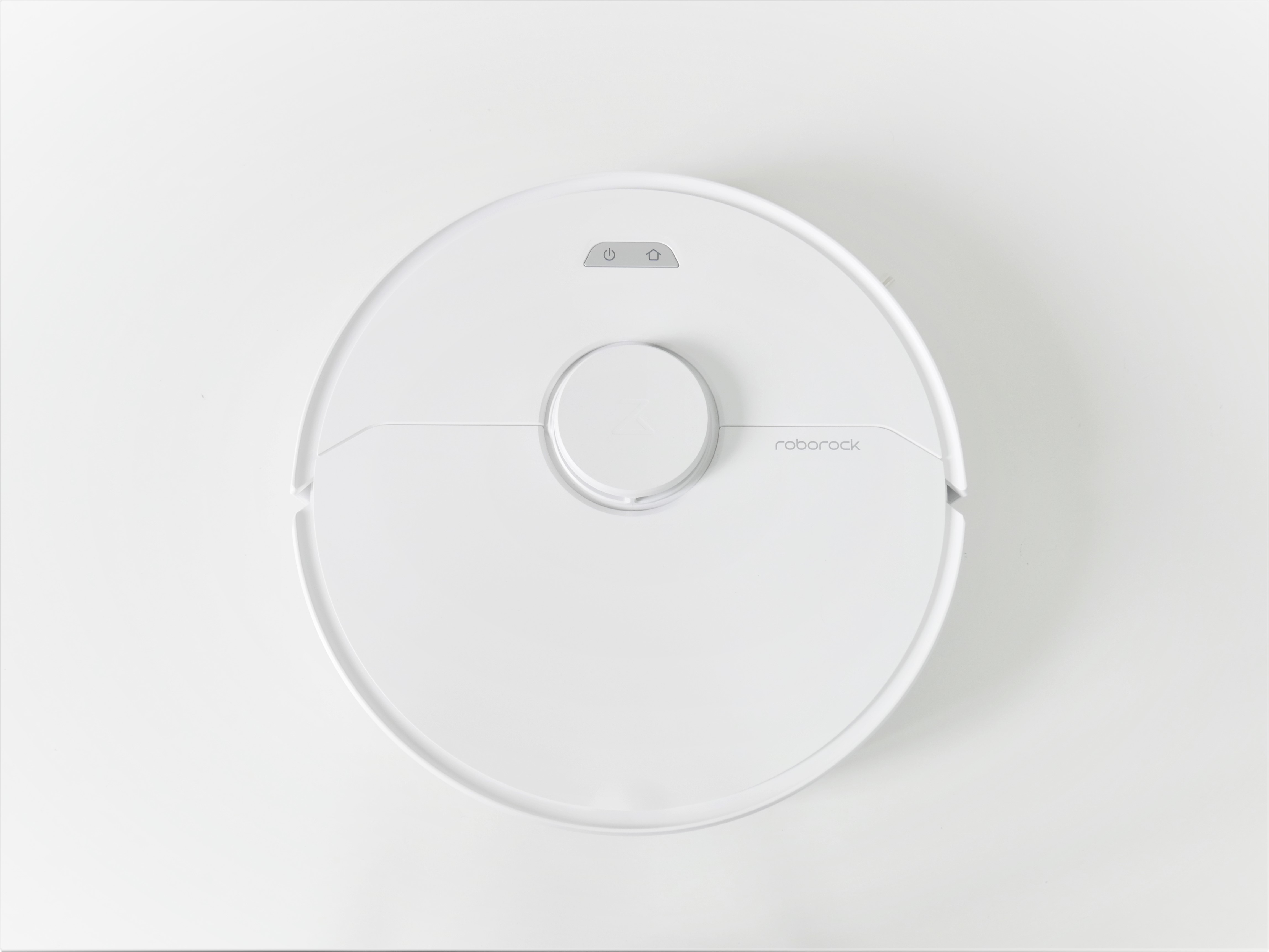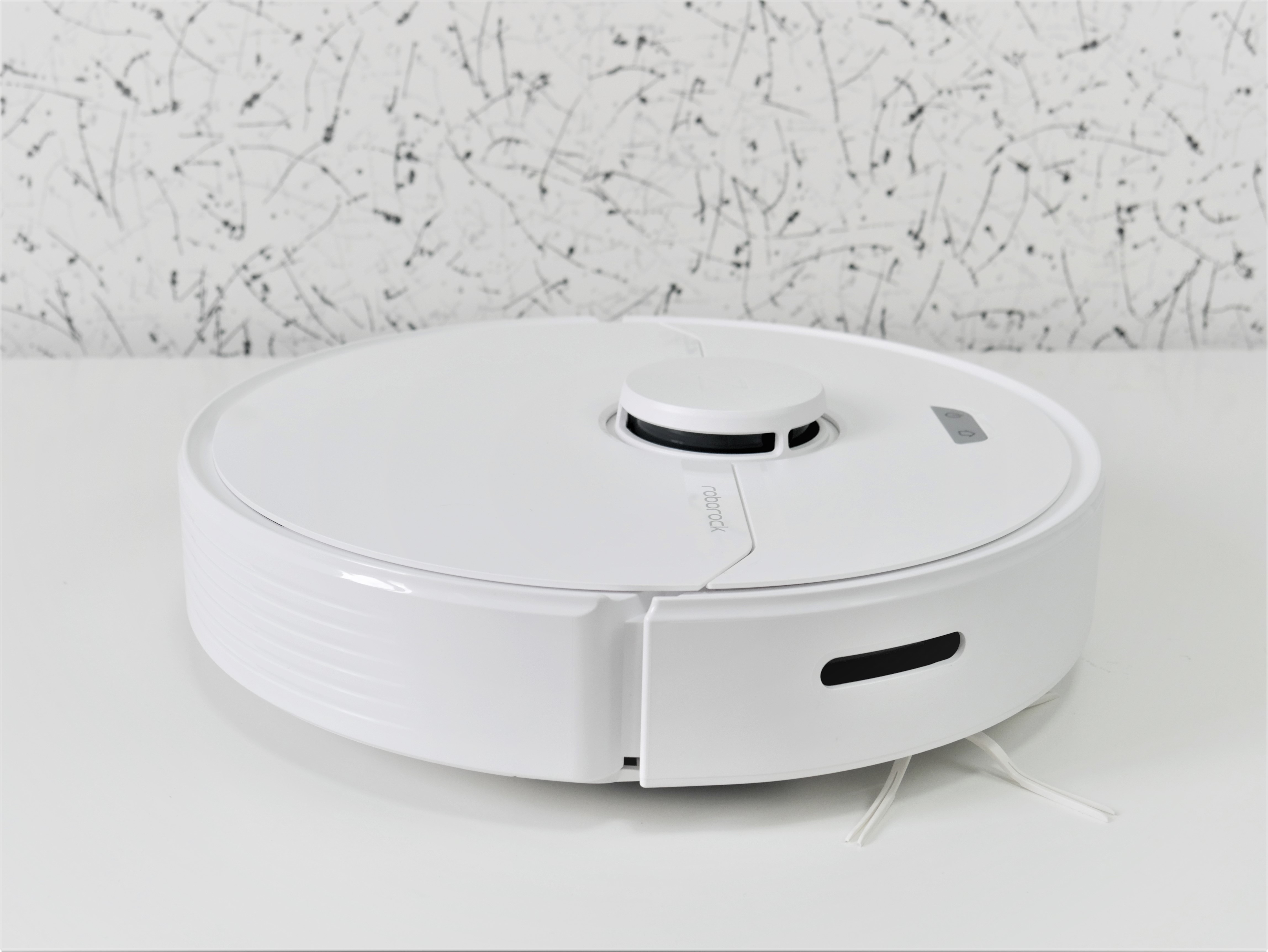 Сверху робот выглядит почти так же, как Roborock S6 Pure: белая таблетка с башенкой лидара и откидной крышкой, бампер с прорезями и торчащая из-под него торцевая щётка.