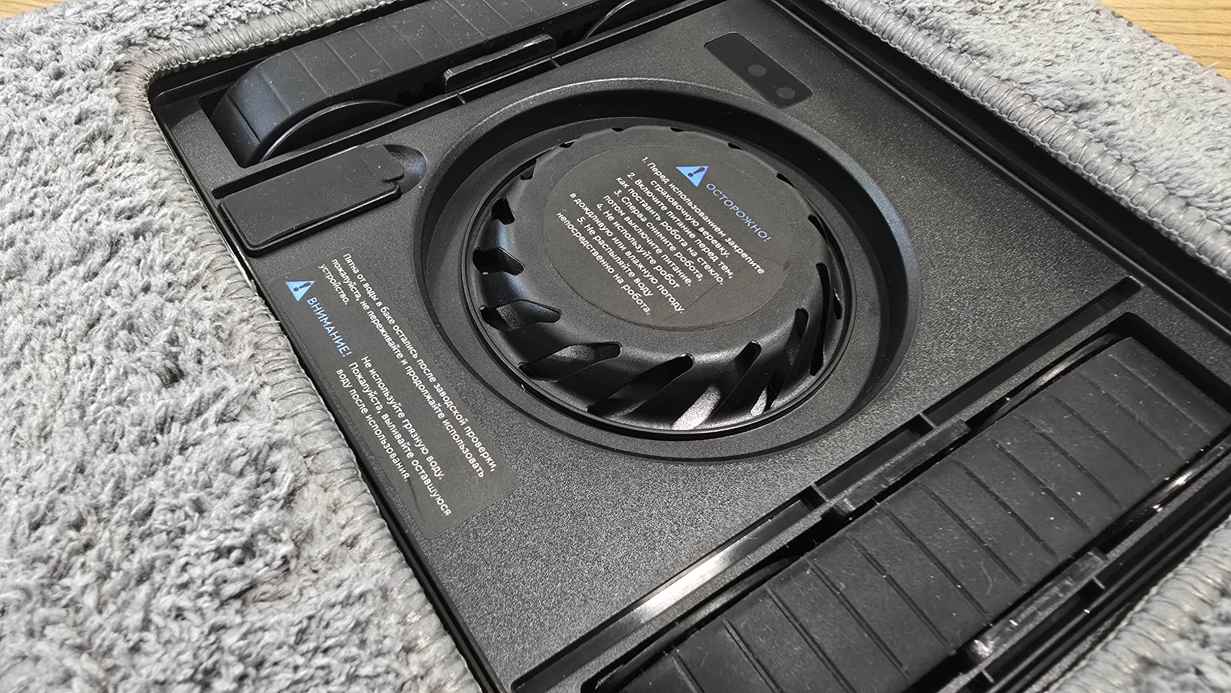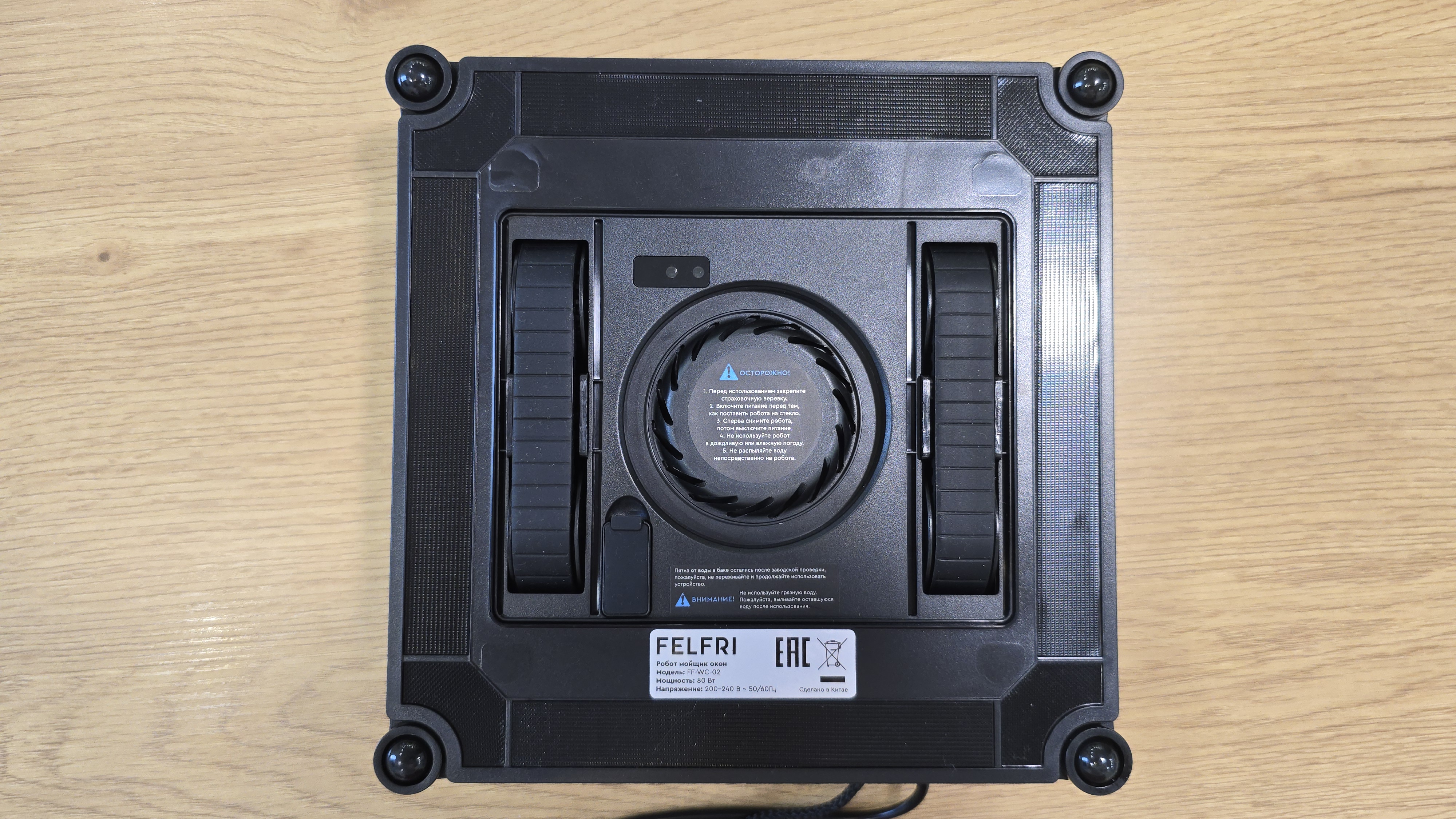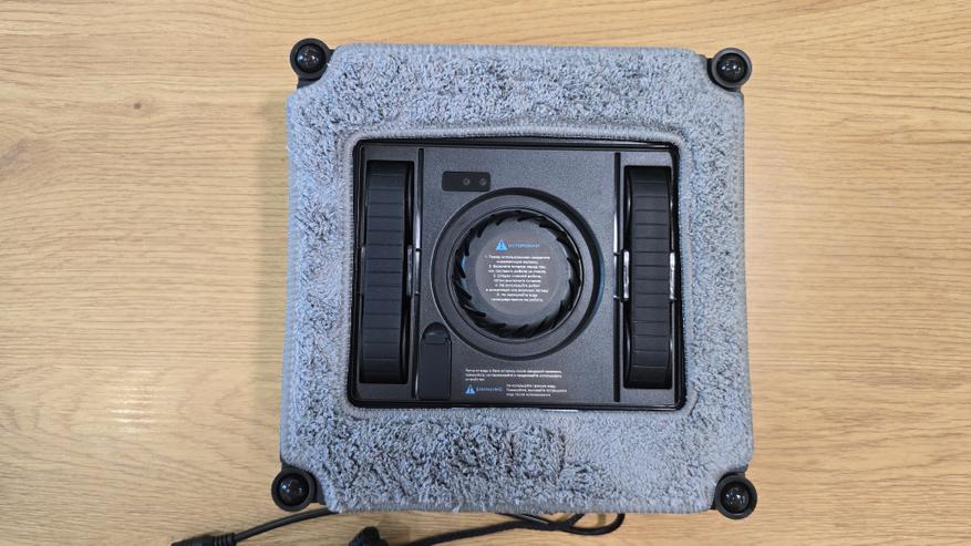По периметру тыльной стороны находится площадка-липучка для крепления салфетки. Салфетка асимметричная: две стороны широкие, две — узкие. Установить её неправильно практически невозможно. Если закрепить не той стороной, она будет мешать движению устройства. Углы салфетки имеют вырезы, чтобы не перекрывать датчики защиты от падения, размещённые в каждом углу корпуса. Эти сенсоры отслеживают край поверхности и особенно важны при работе на безрамочных окнах, где нет физического ограничителя.
