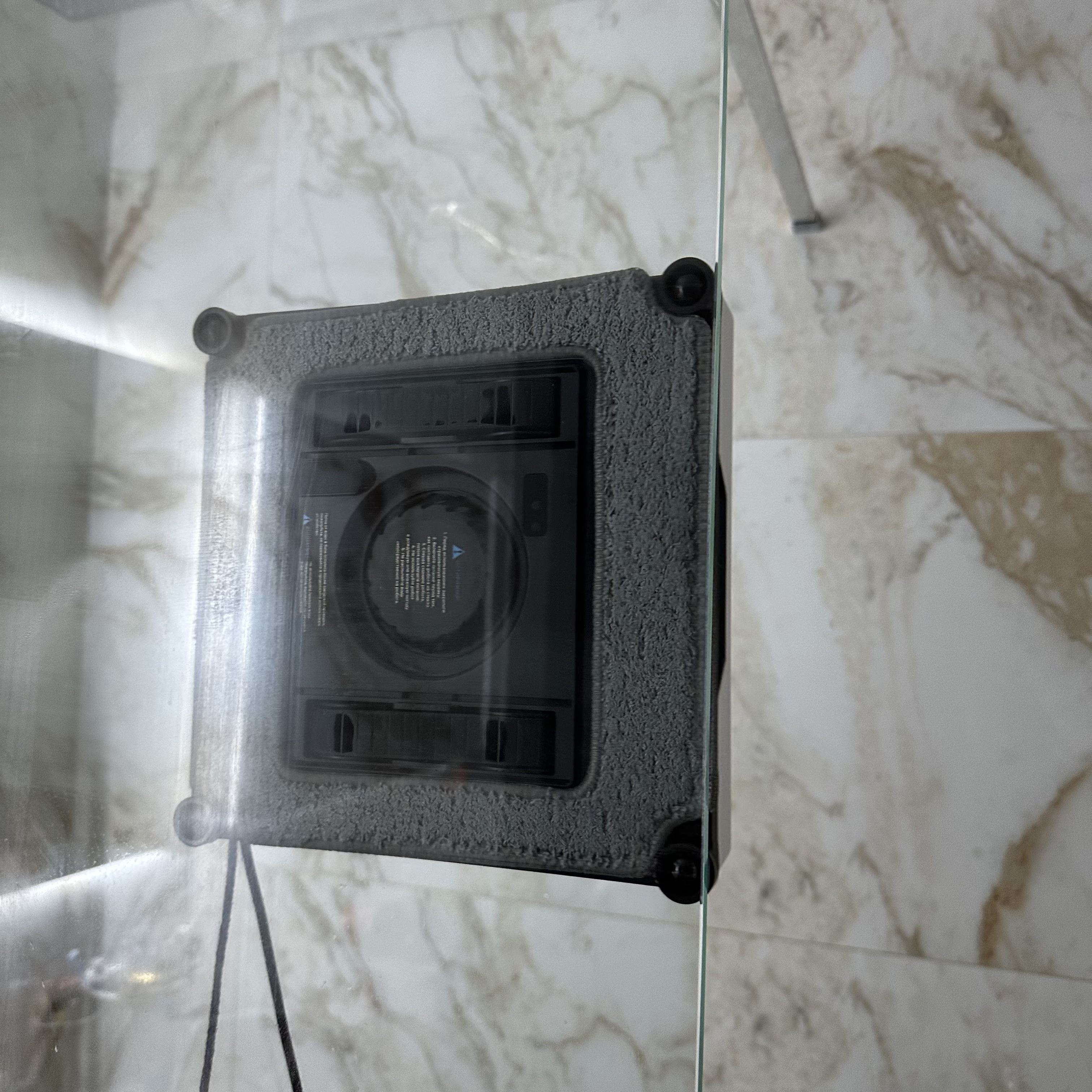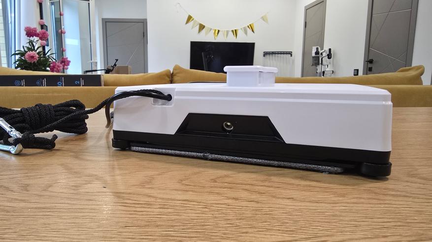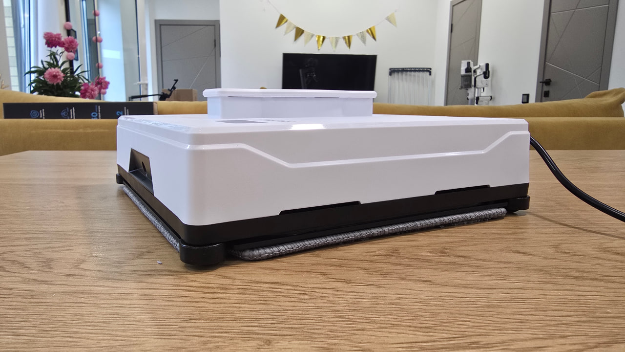 На вид это простая плоская коробочка, толщиной с бургер. Никаких выступающих элементов, ничего громоздкого. Всё компактно и даже немного игрушечно, по крайней мере, пока его не включишь. Без химии, без предварительного замачивания, без луж, тряпок и возни… просто заливаешь воду, включаешь, и он начинает методично ползти по стеклу, распыляя воду и тут же протирая каждый участок. Я сначала наблюдала с недоверием, но уже через пару минут стало понятно: вмешиваться не придётся. Приблизительно через час все семь окон в гостиной, включая панорамные, были чистыми. И за это время я ни разу не взяла в руки тряпку. Вот это, по правде говоря, меня полностью устраивает.